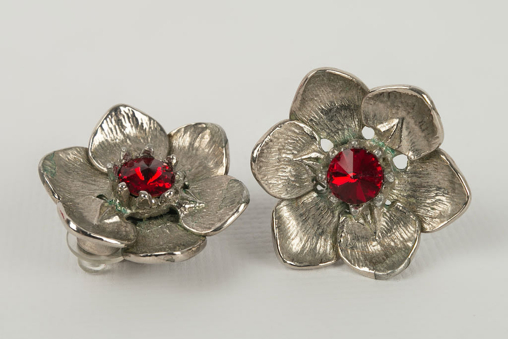 DIOR -Boucles d'oreilles clips en métal argenté figurant une fleur centrée d'un strass rouge.