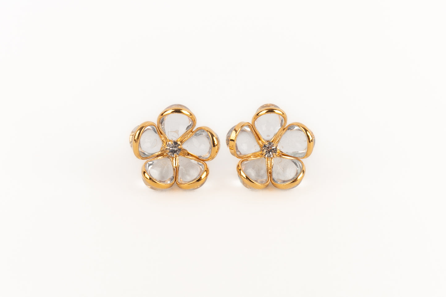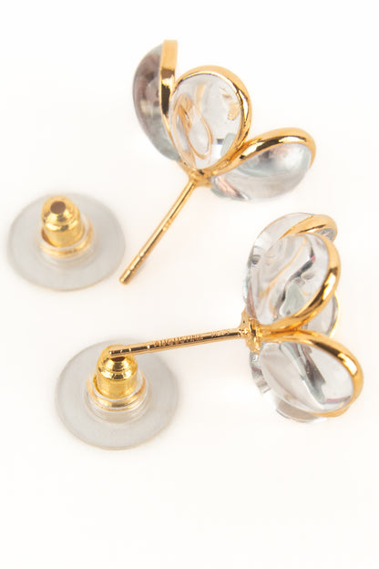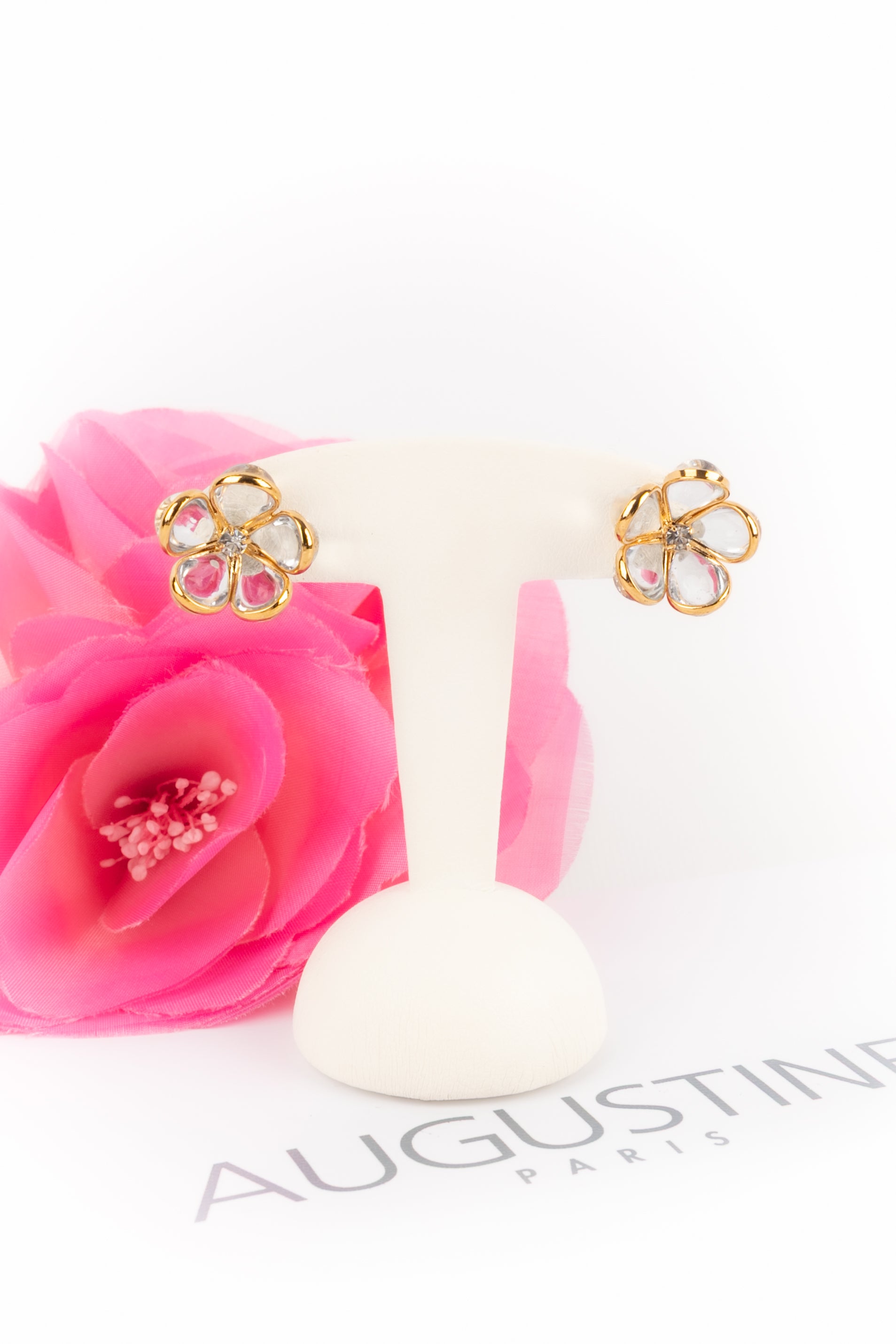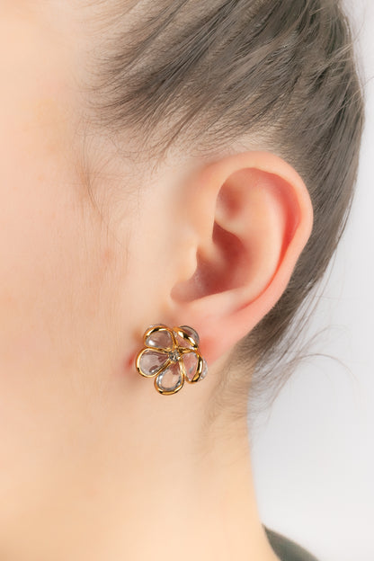 AUGUSTINE - (Made in France) Boucles d'oreilles fleurs en métal doré et pâte de verre transparente.