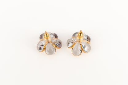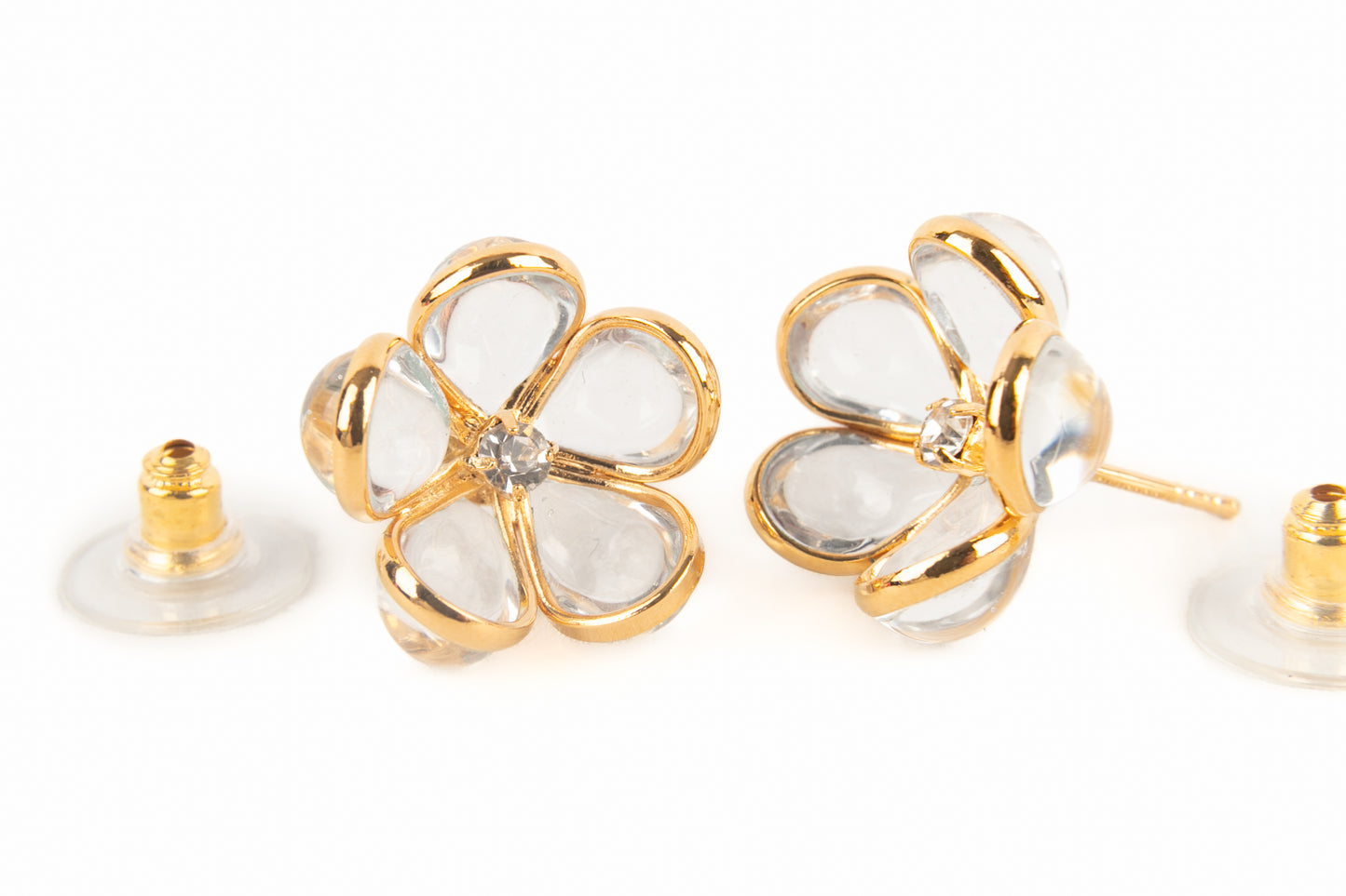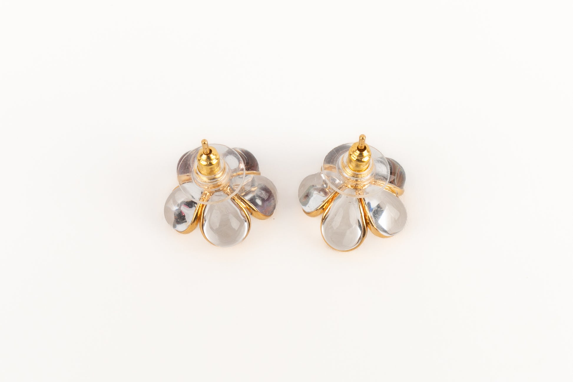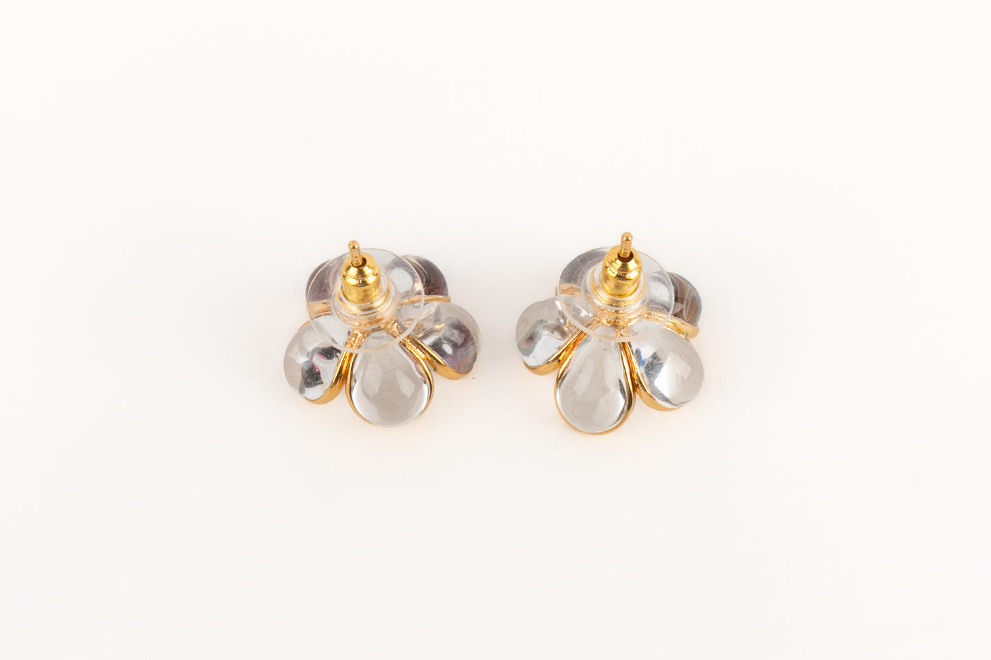 AUGUSTINE - (Made in France) Boucles d'oreilles fleurs en métal doré et pâte de verre transparente.