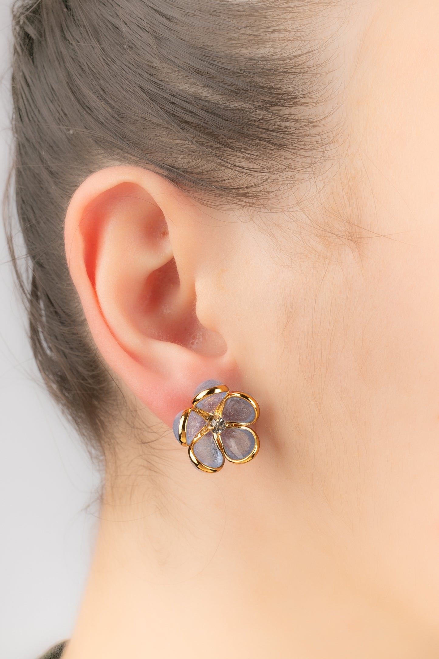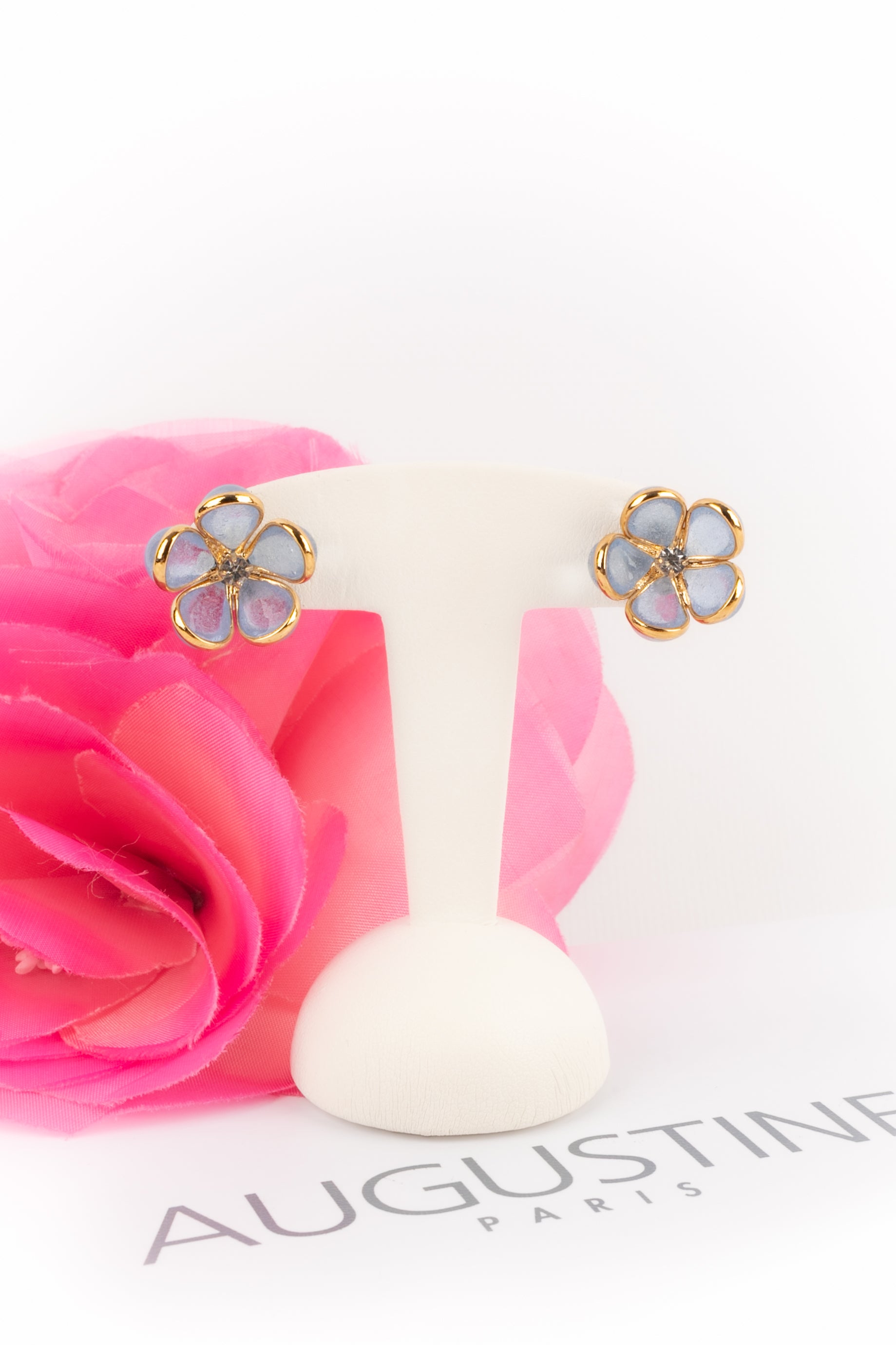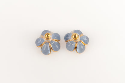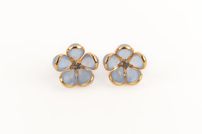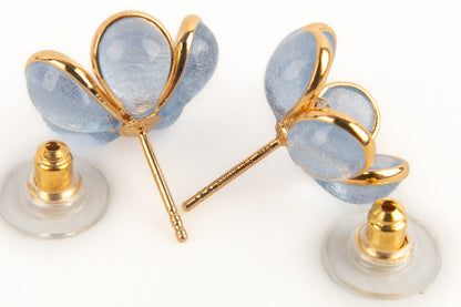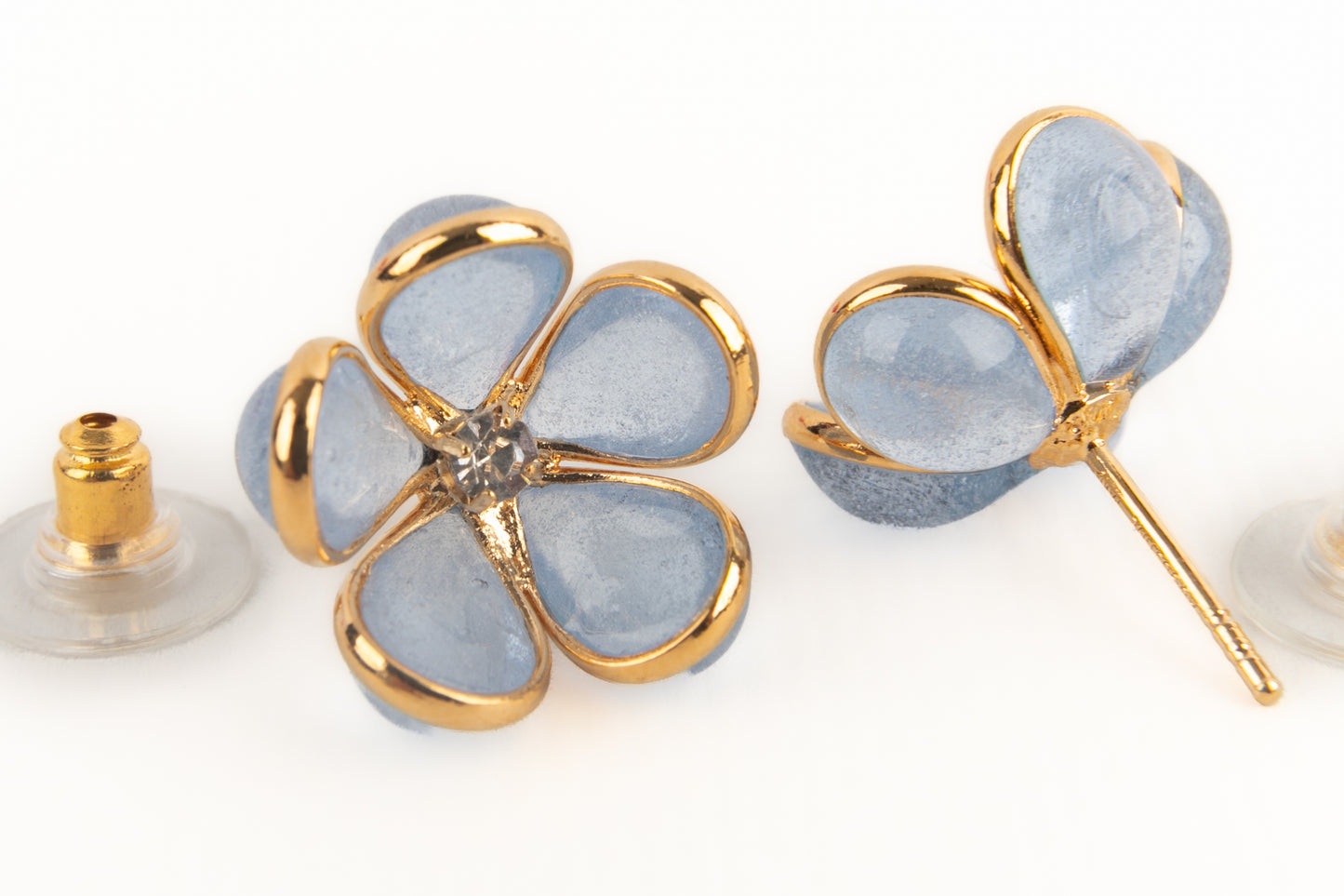AUGUSTINE - (Made in France) Boucles d'oreilles fleurs en métal doré et pâte de verre bleue ciel.