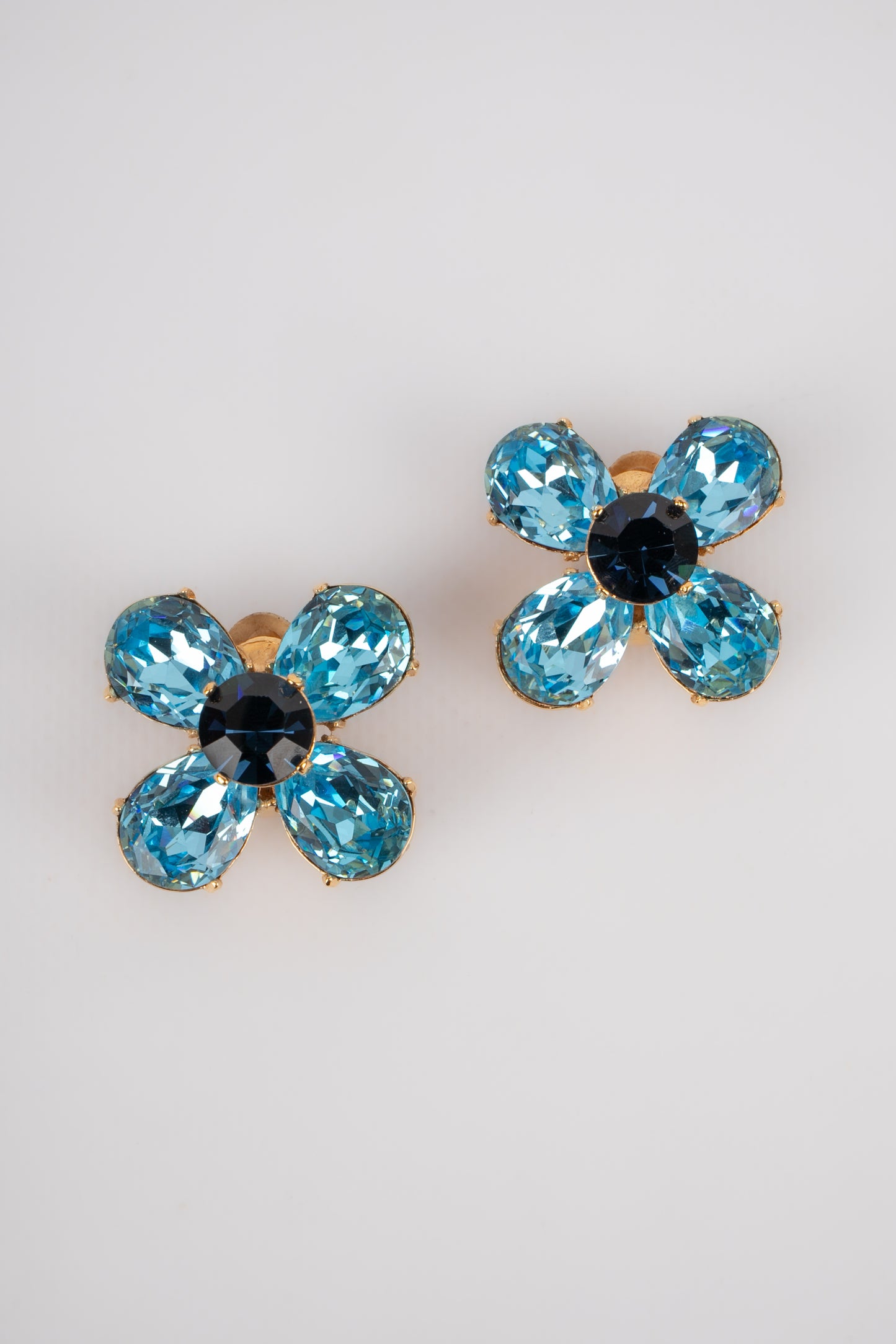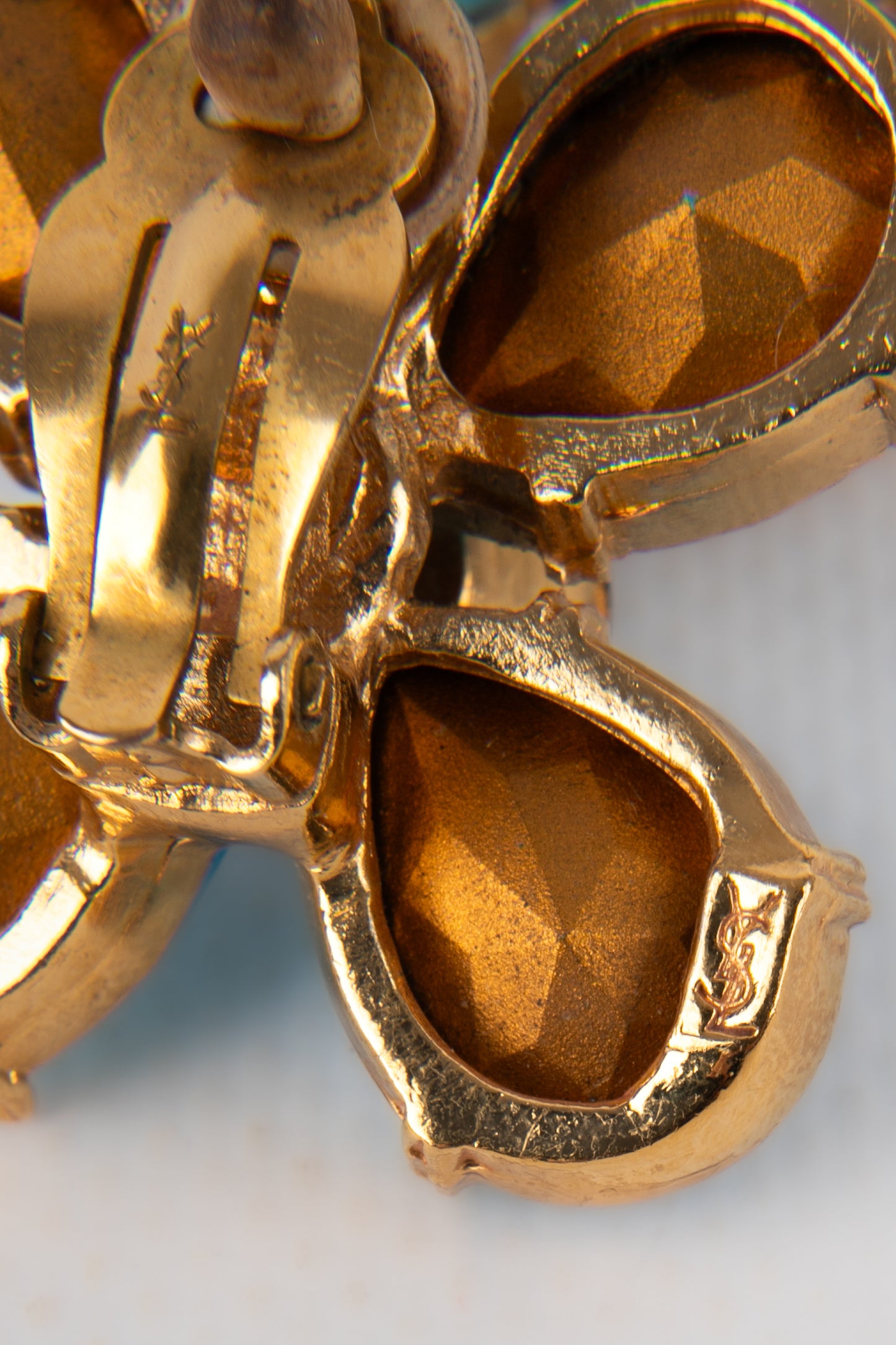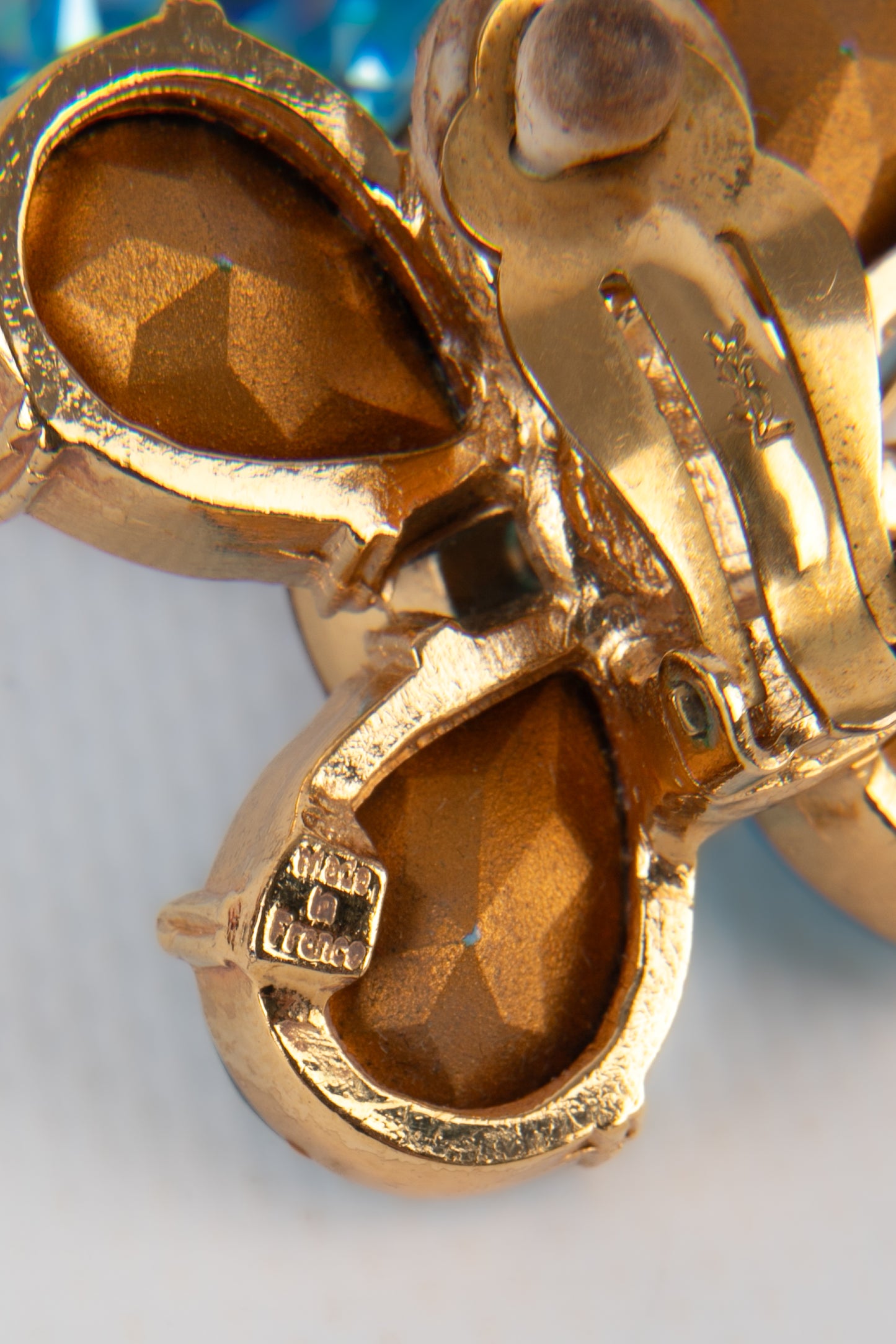 YVES SAINT LAURENT -(Made in France) Boucles d'oreilles clips en métal doré et strass bleus.