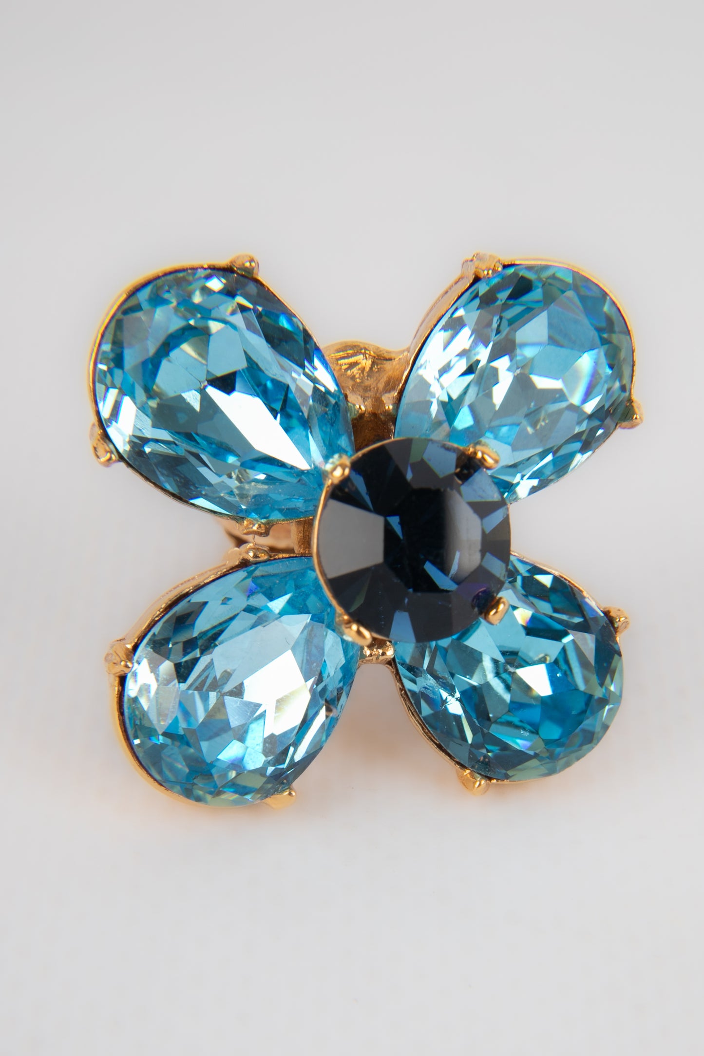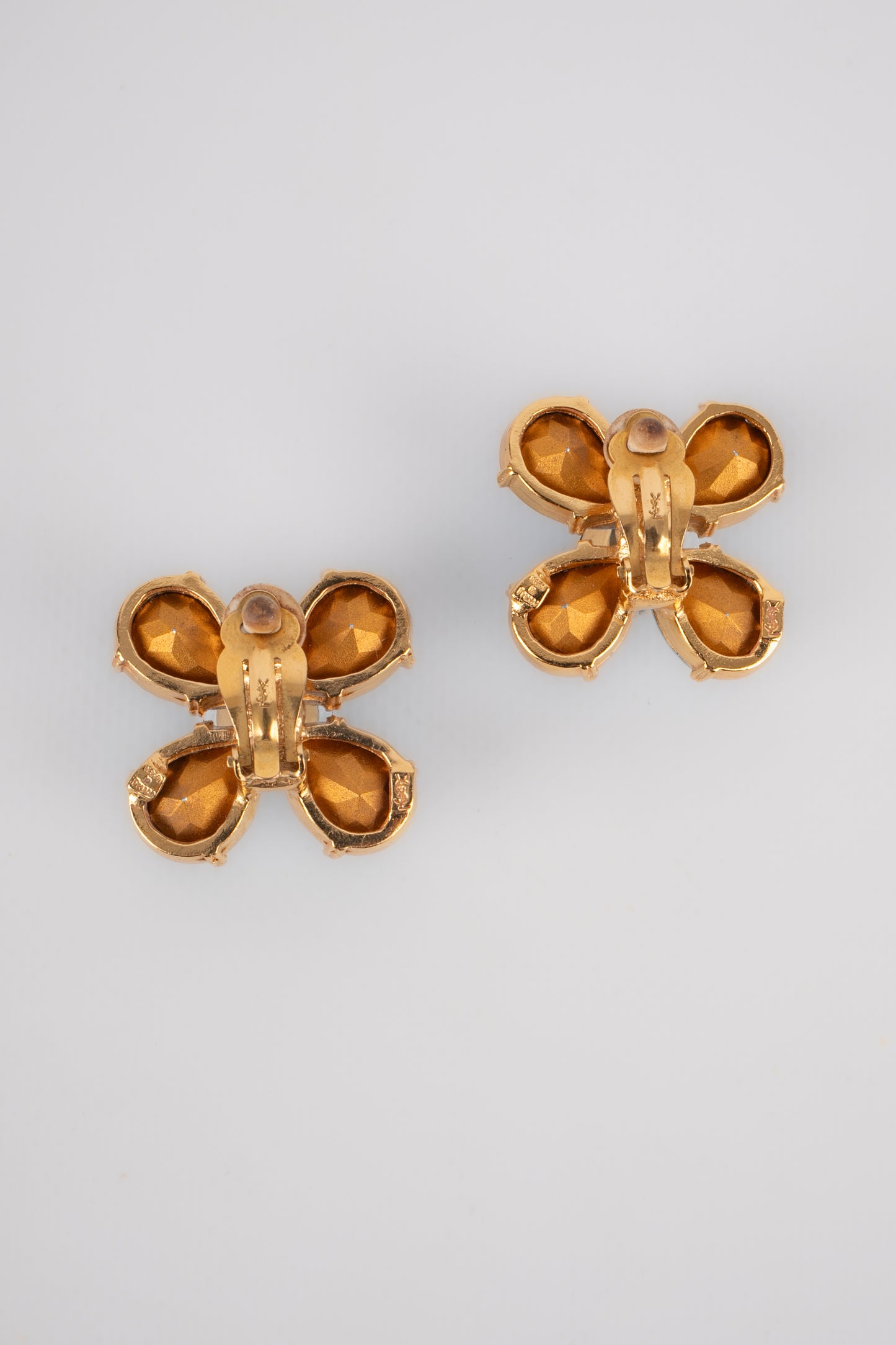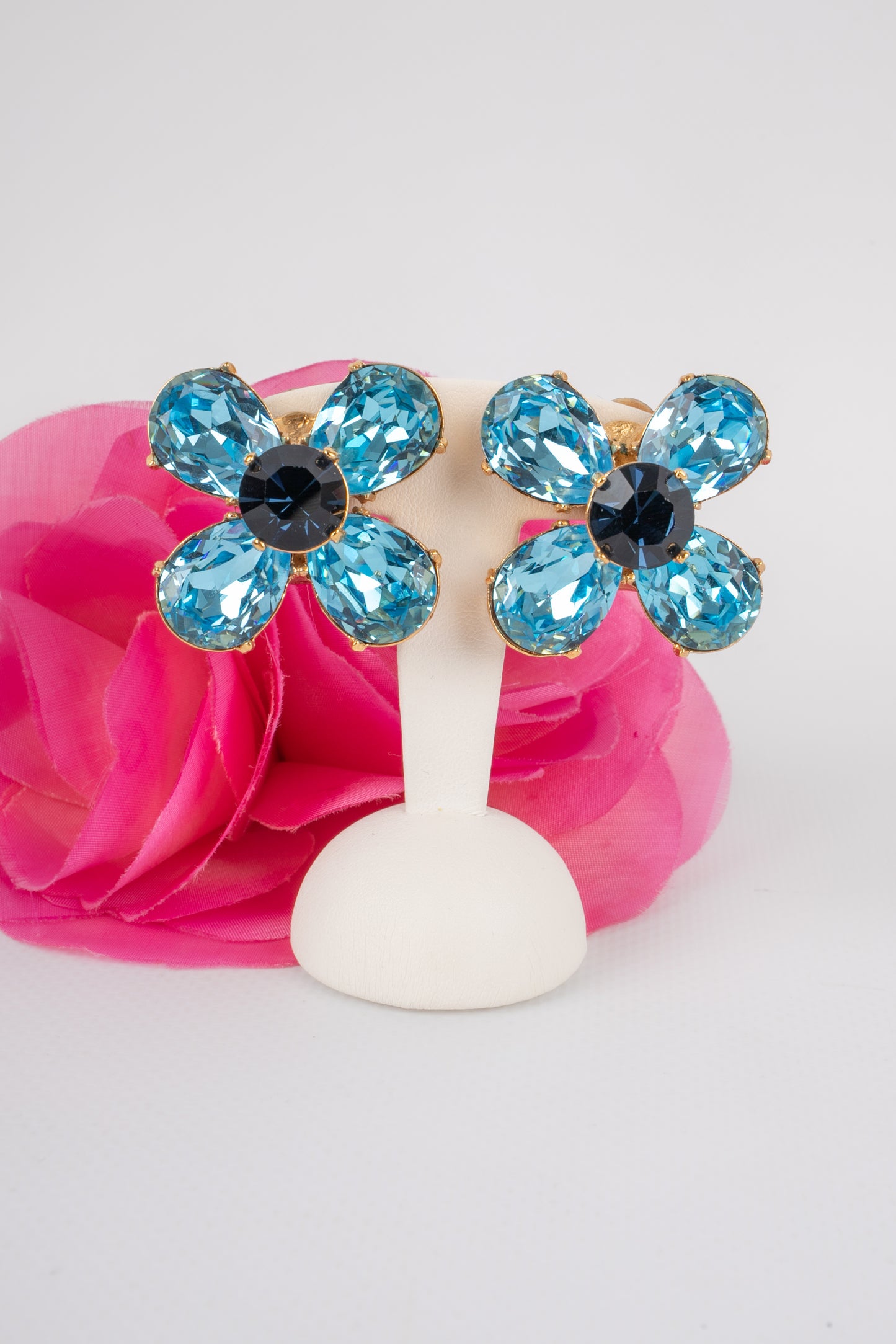 YVES SAINT LAURENT -(Made in France) Boucles d'oreilles clips en métal doré et strass bleus.