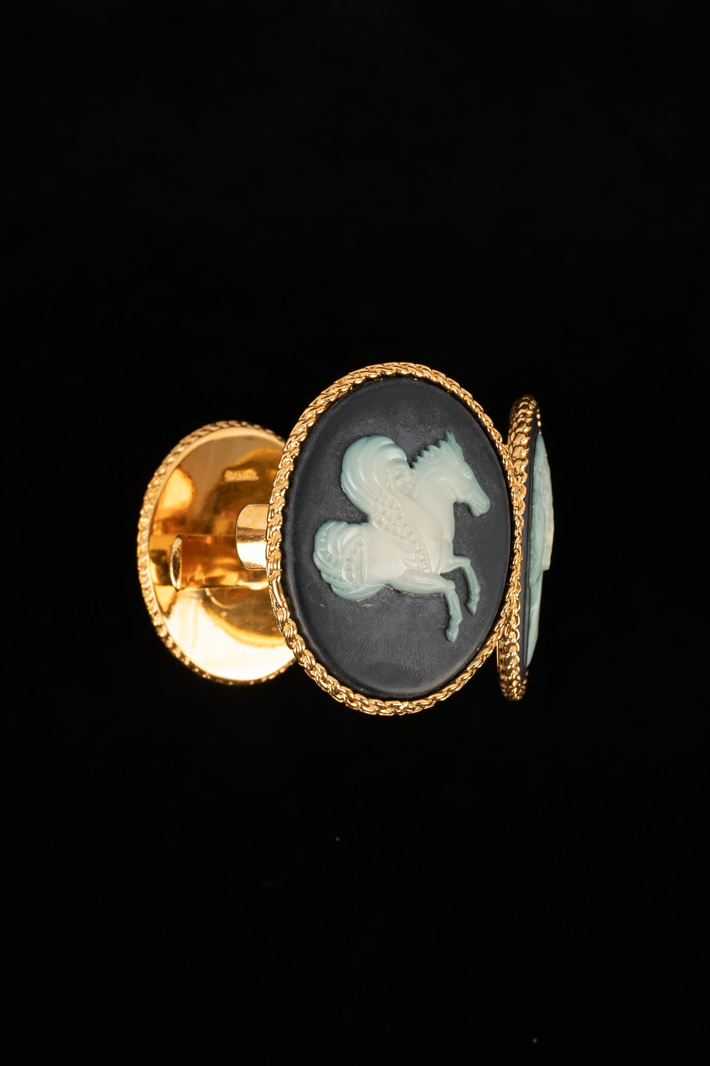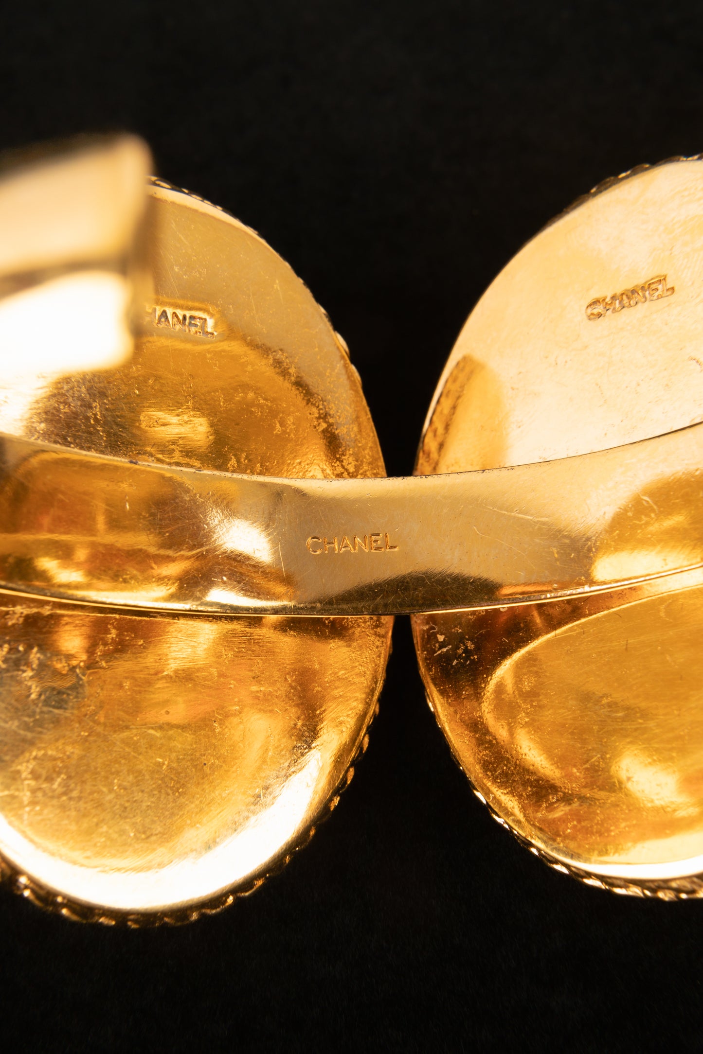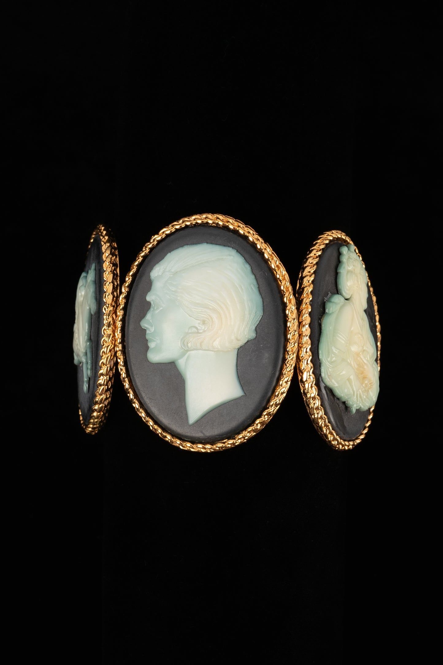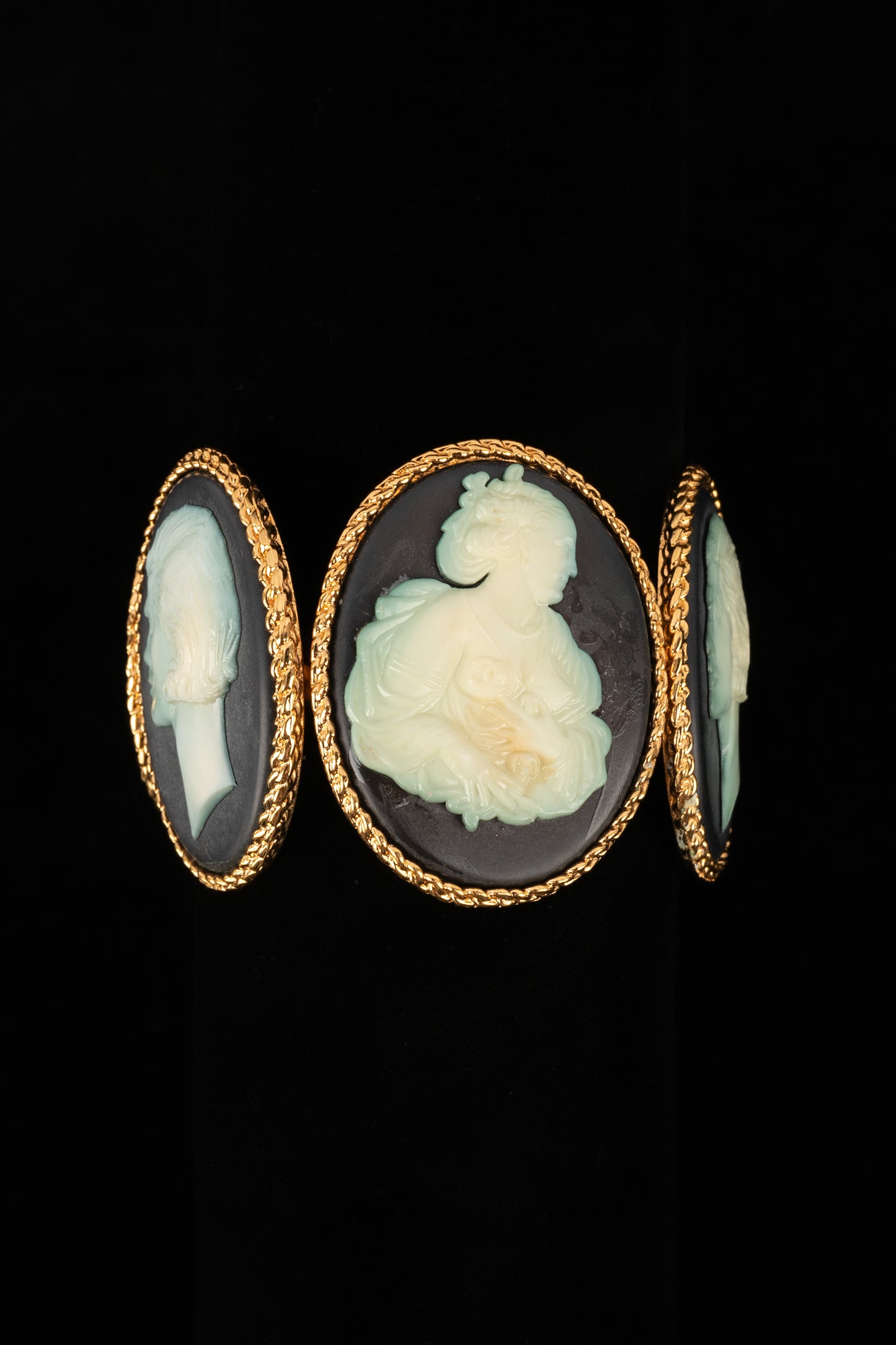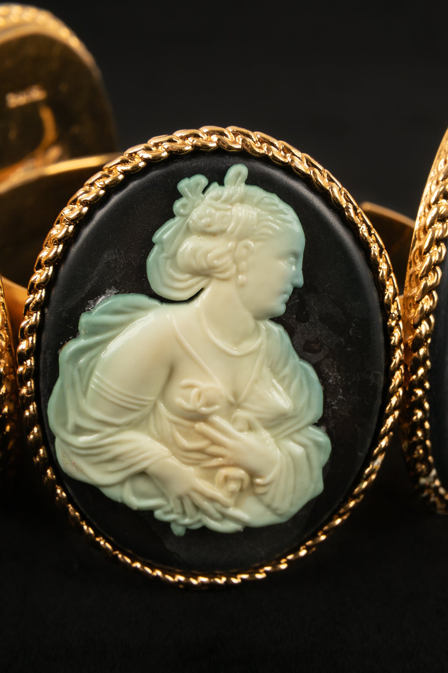 CHANEL - (Made in France) Bracelet en métal doré décoré de camées. Collection Printemps-Eté 1989. Bon état général, à signaler décoloration sur la partie blanche du camé.