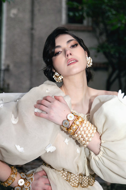Découvrez notre collection de bracelets fantaisie vintage, issus des plus grandes maisons de couture. Chaque bracelet est une pièce unique et introuvable, incarnant le luxe et l'élégance intemporelle. Parmi nos trésors, retrouvez les typiques manchettes Yves Saint Laurent, symboles de style et de sophistication.