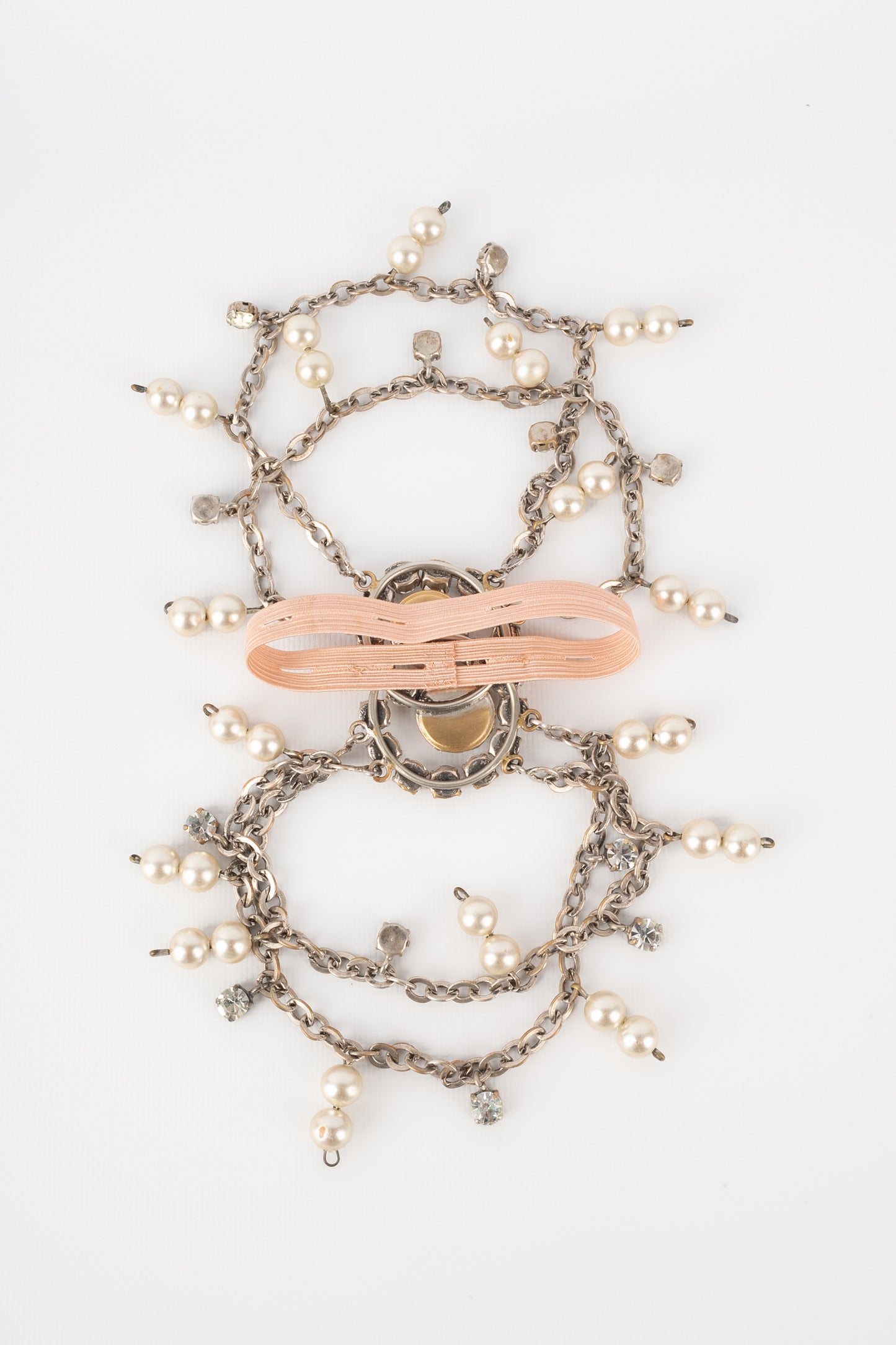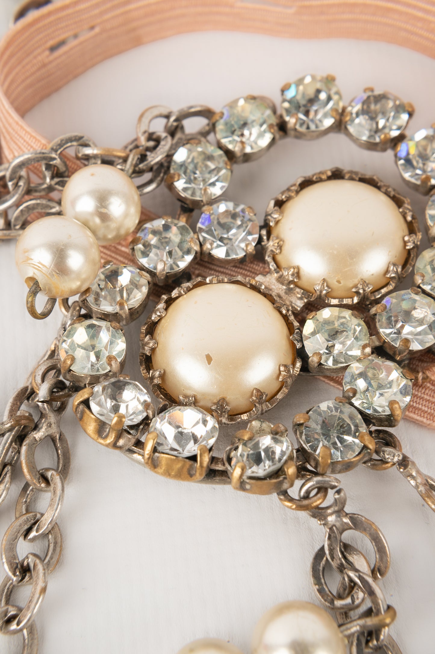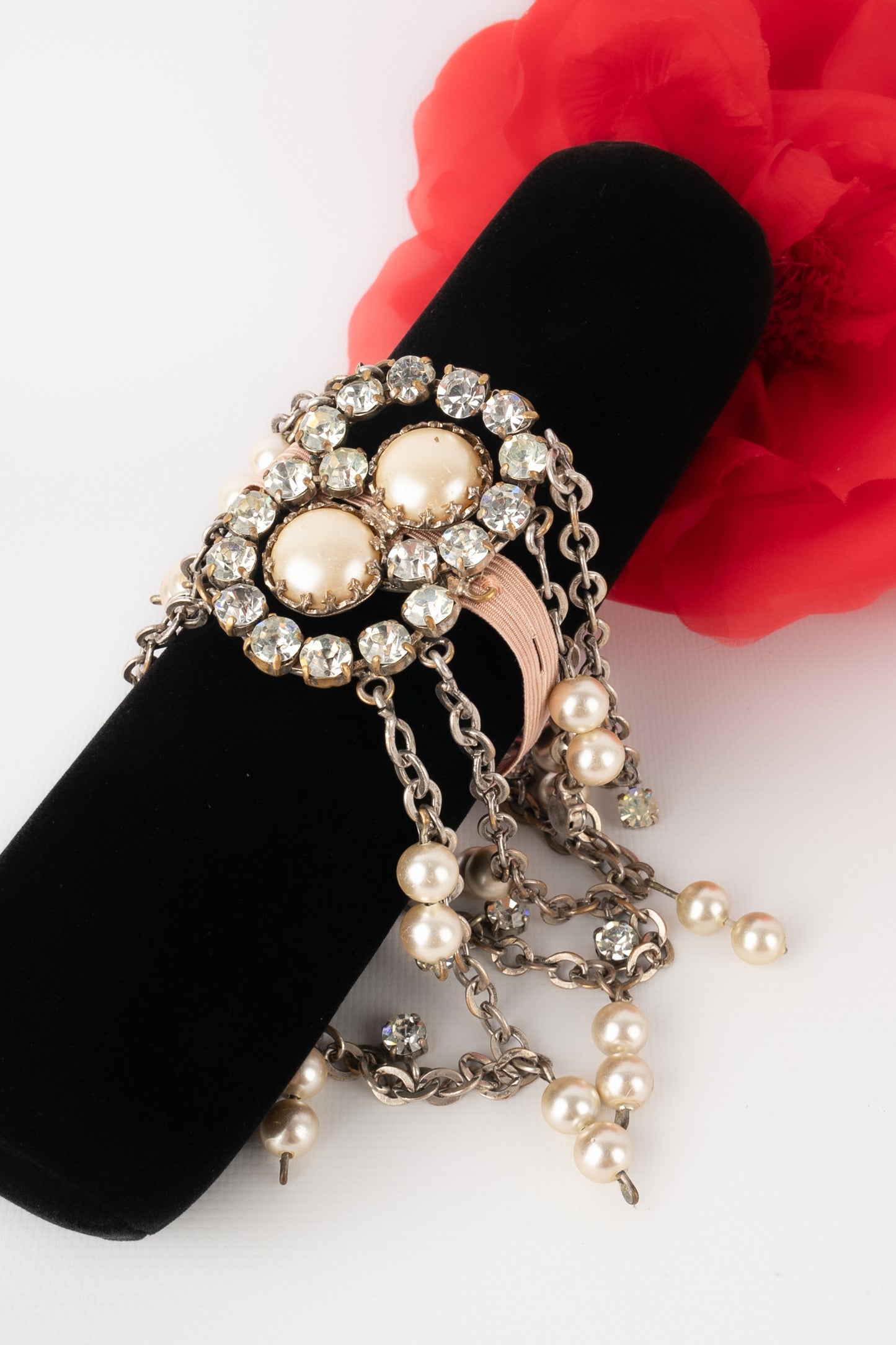 THÉÂTRE - Bracelet de bras en métal argenté, strass, perles et cabochons de nacre. Bijou de cabaret ou de théâtre datant des années 1920's.