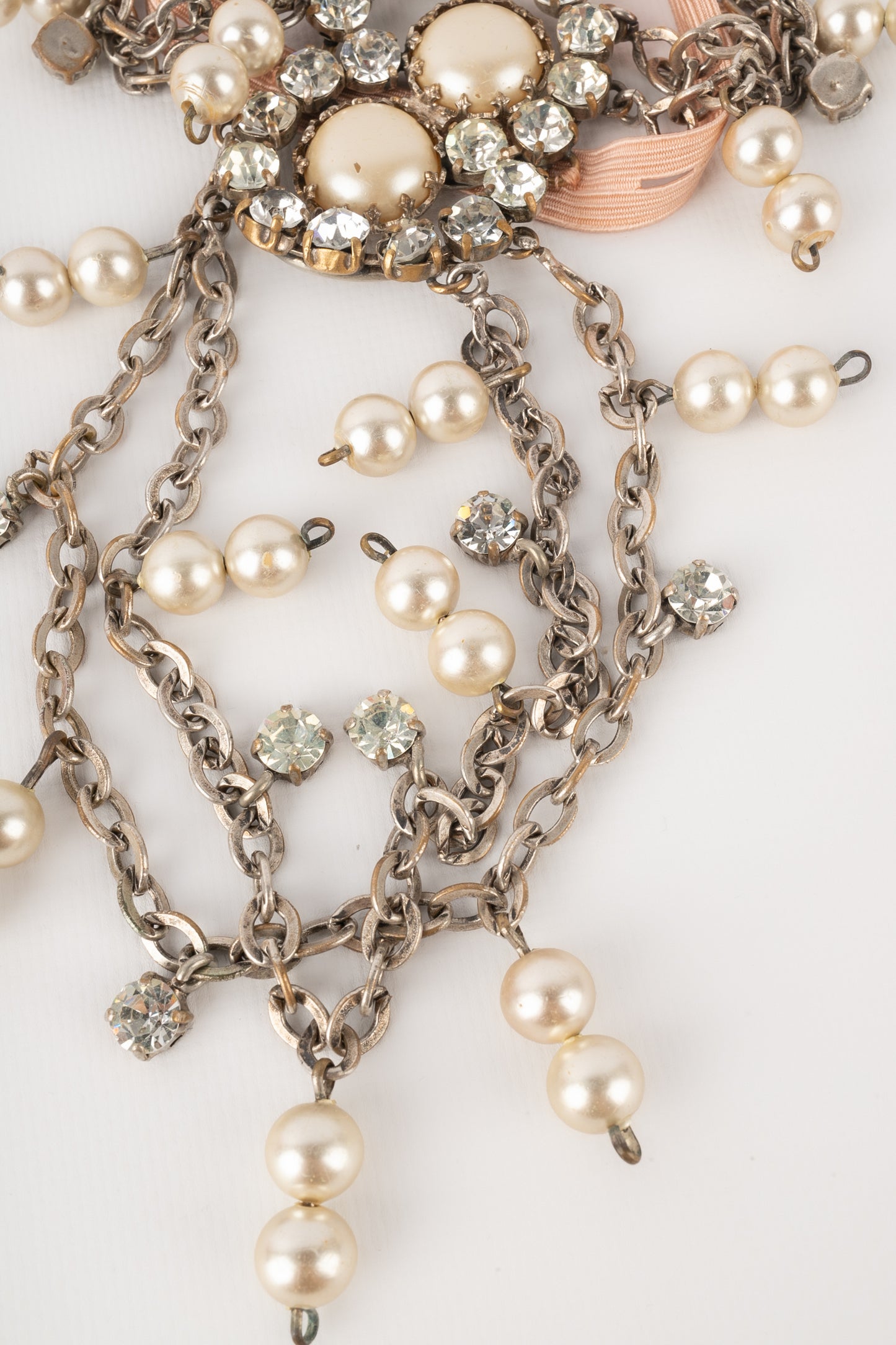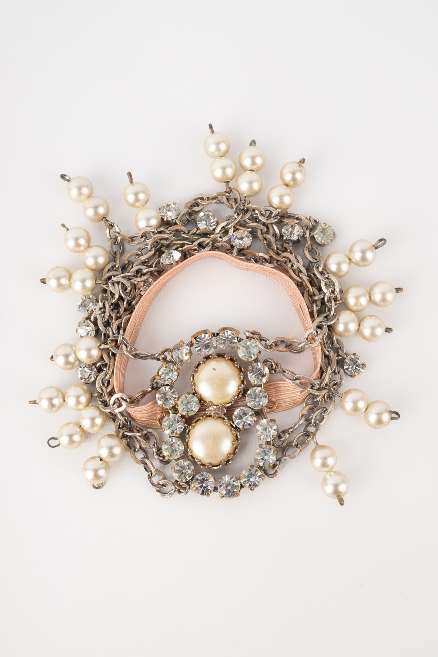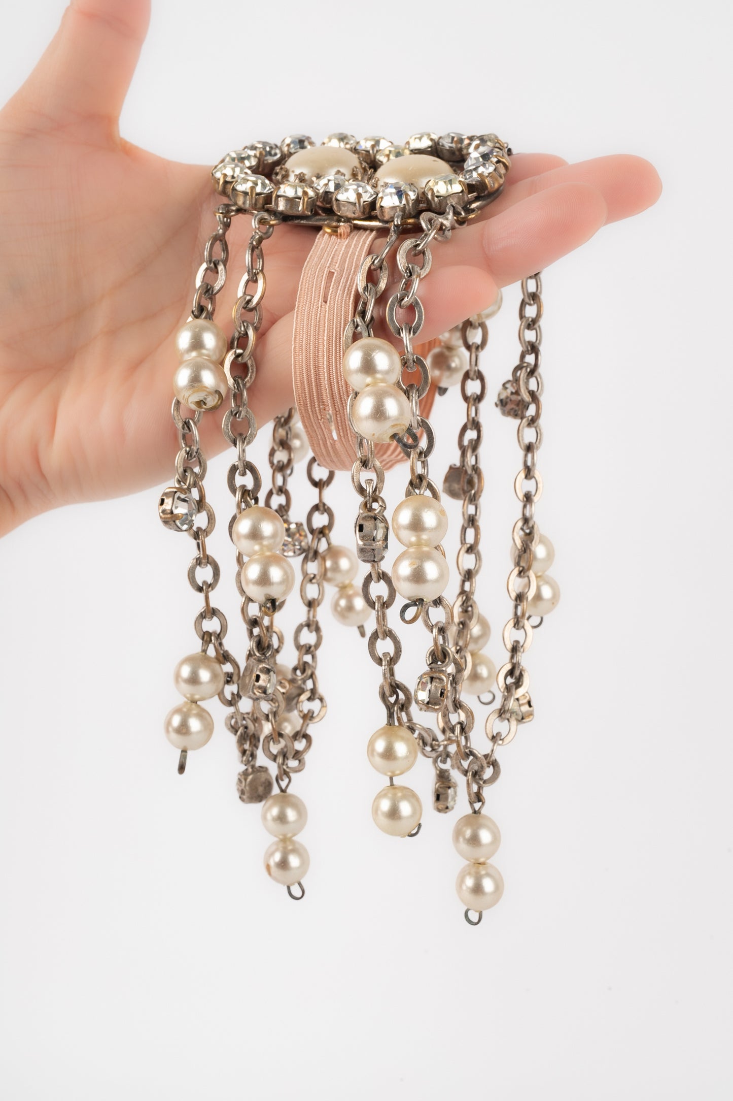 THÉÂTRE - Bracelet de bras en métal argenté, strass, perles et cabochons de nacre. Bijou de cabaret ou de théâtre datant des années 1920's.