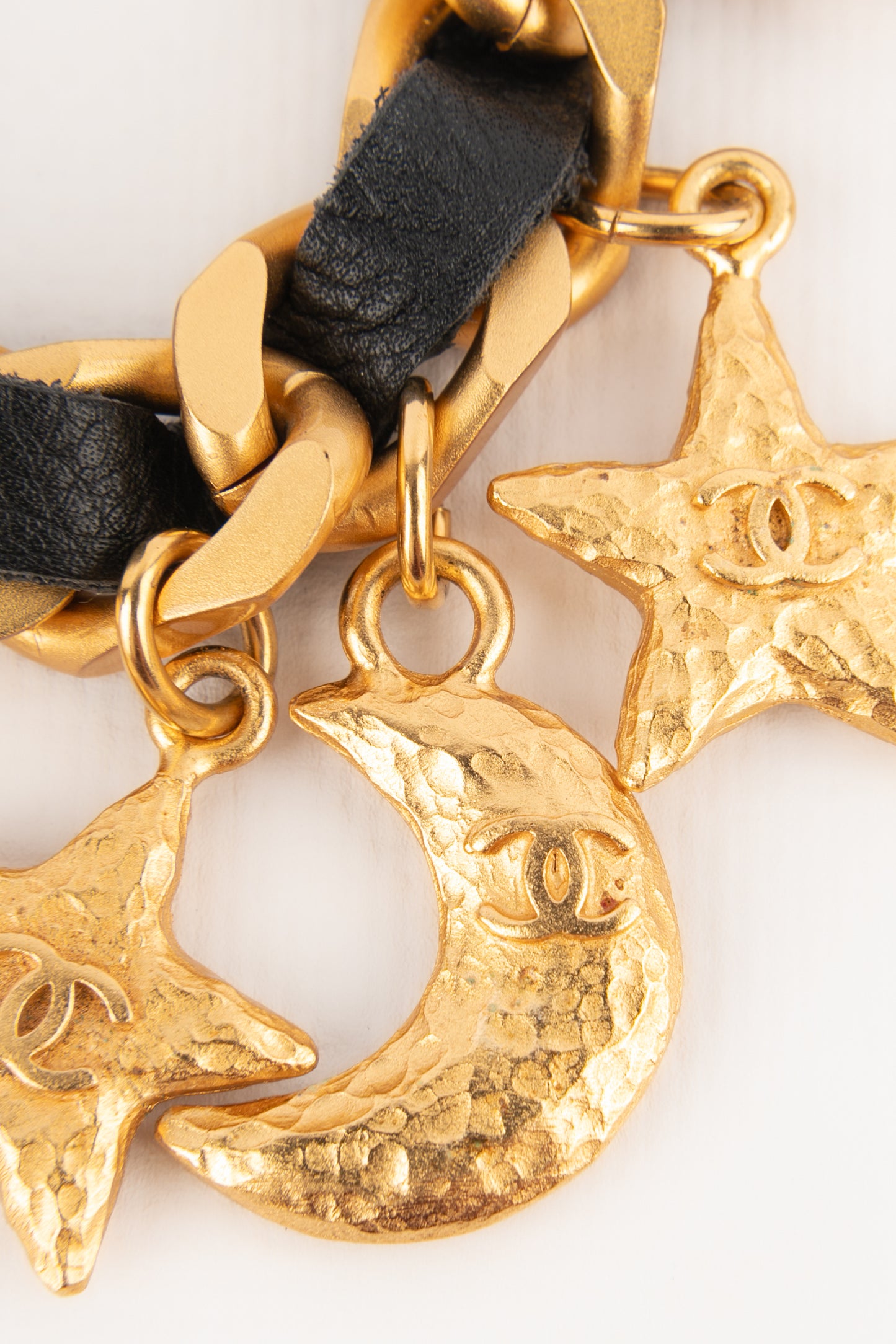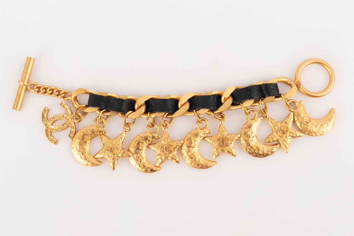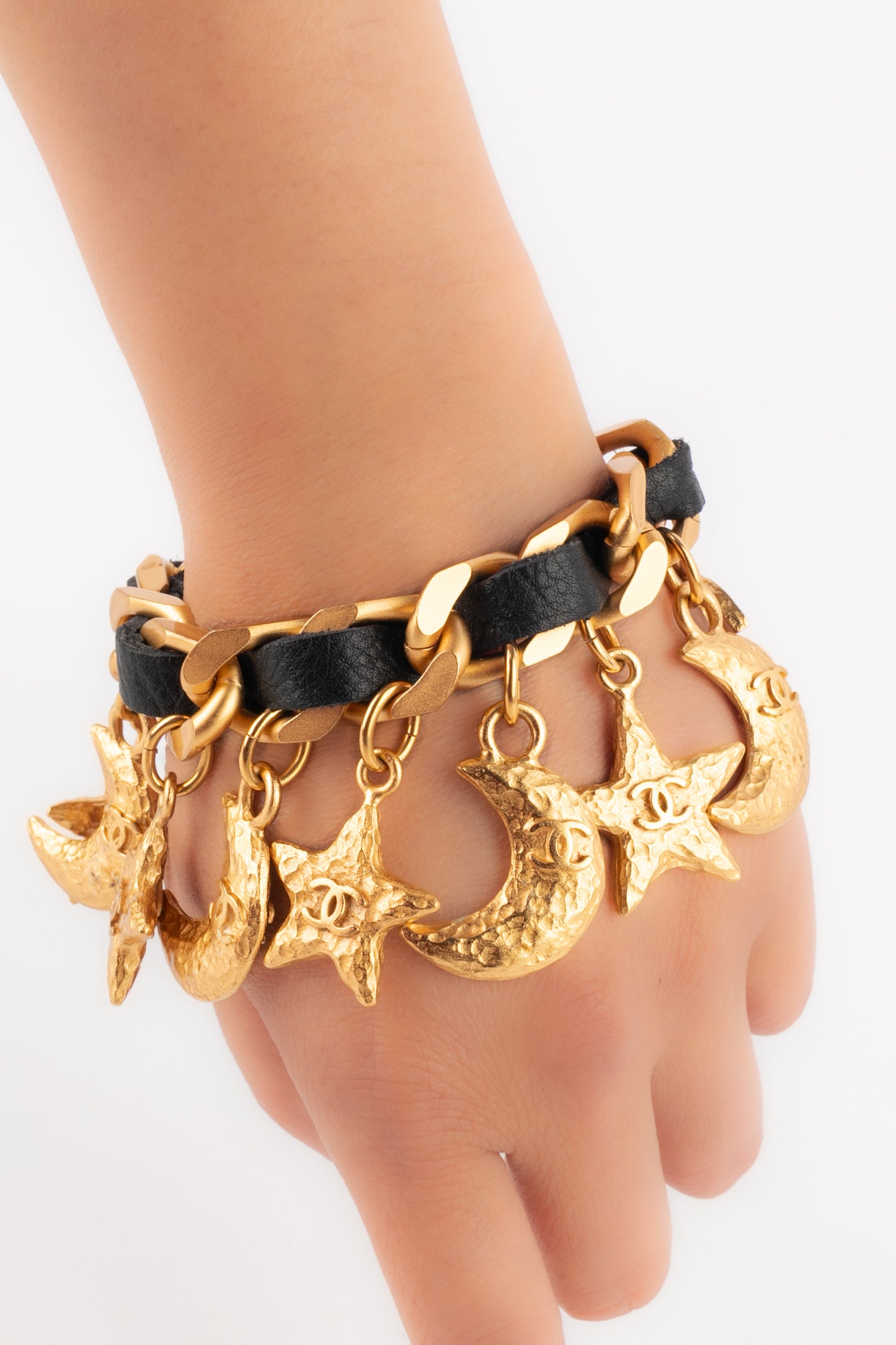 CHANEL -(Made in France) Bracelet en métal doré et cuir noir accompagné de breloques figurant des étoiles et des lunes. Collection Automne-Hiver 1995.
