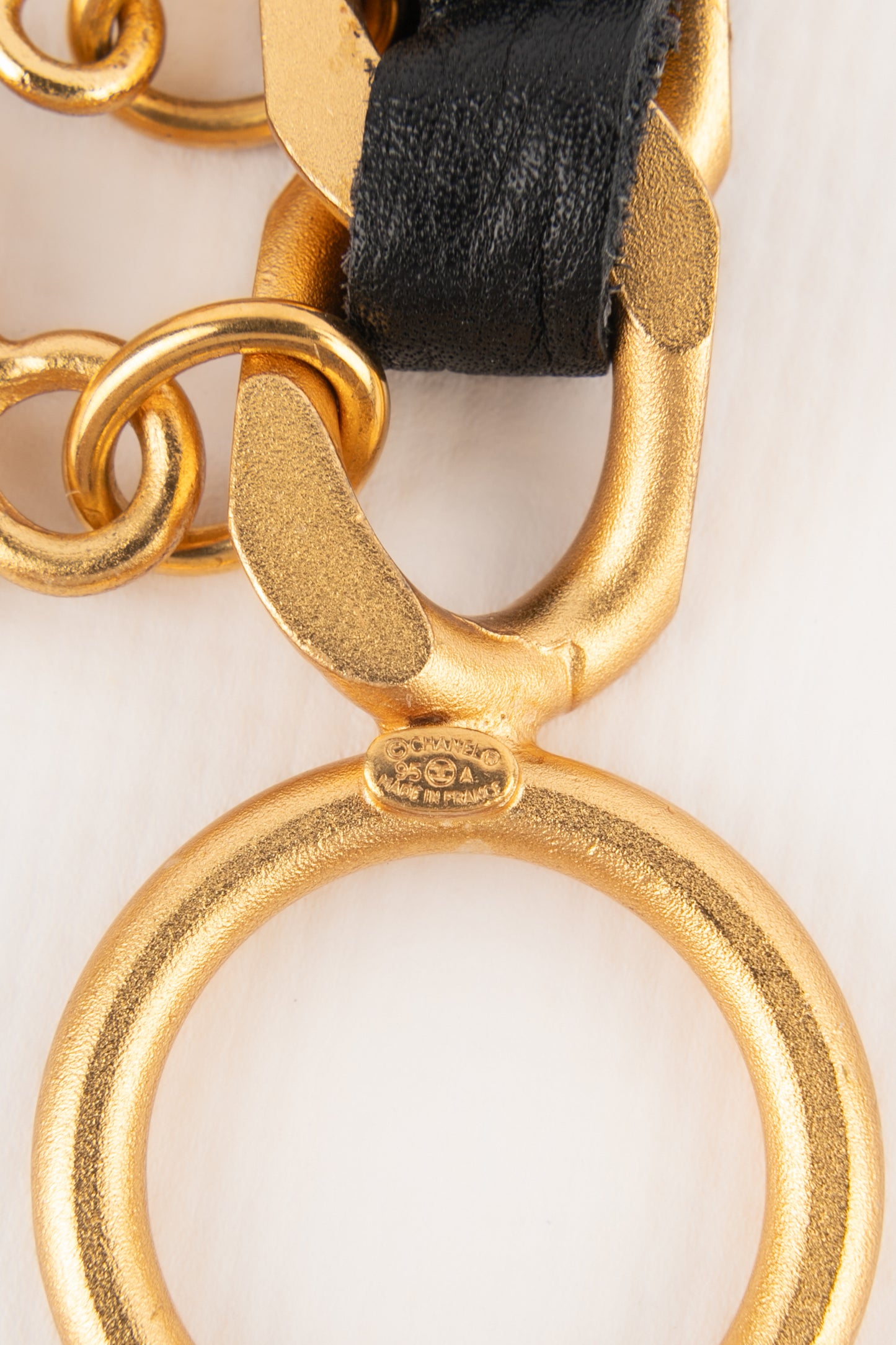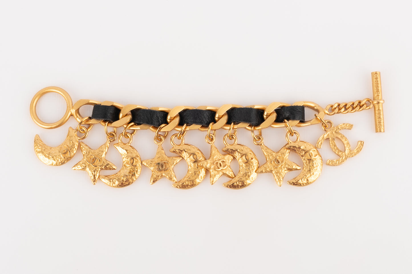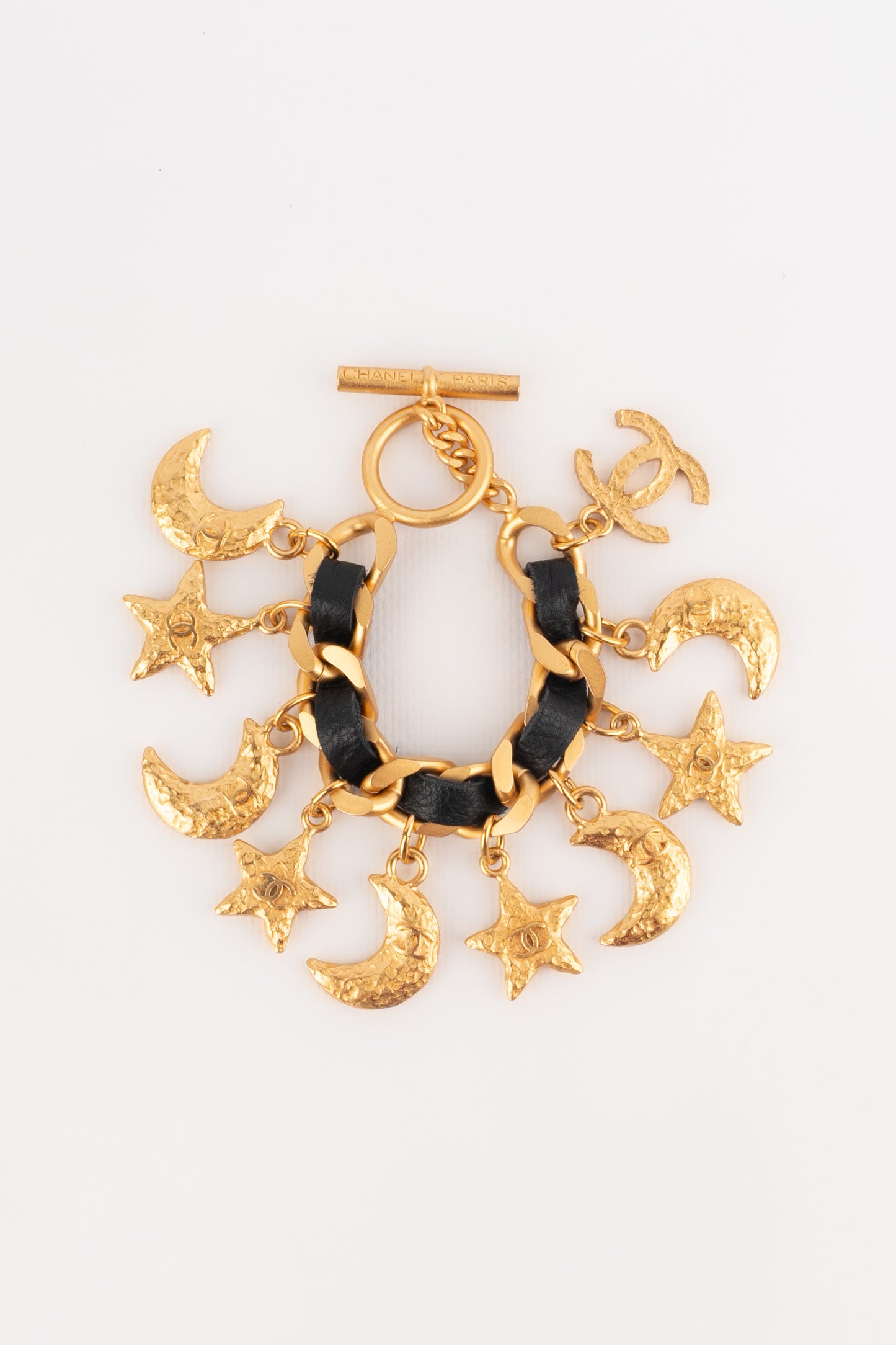 CHANEL -(Made in France) Bracelet en métal doré et cuir noir accompagné de breloques figurant des étoiles et des lunes. Collection Automne-Hiver 1995.