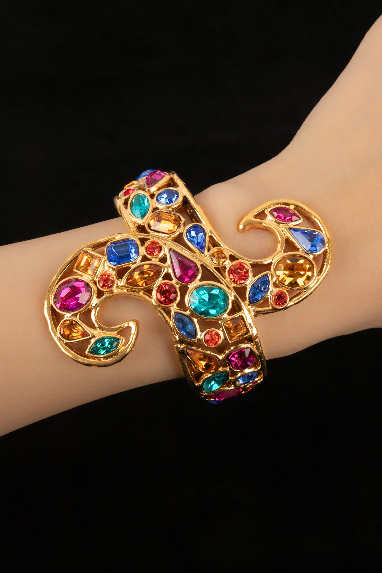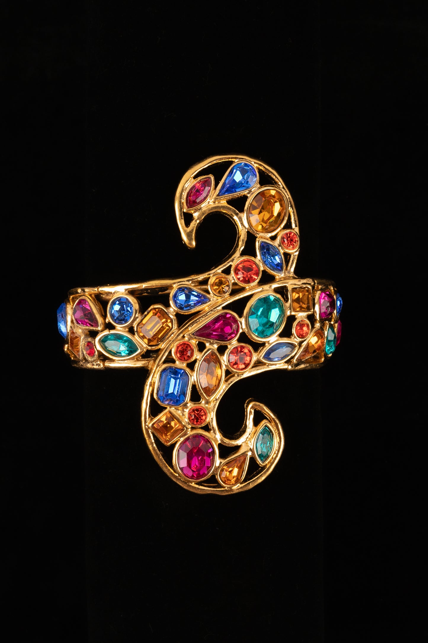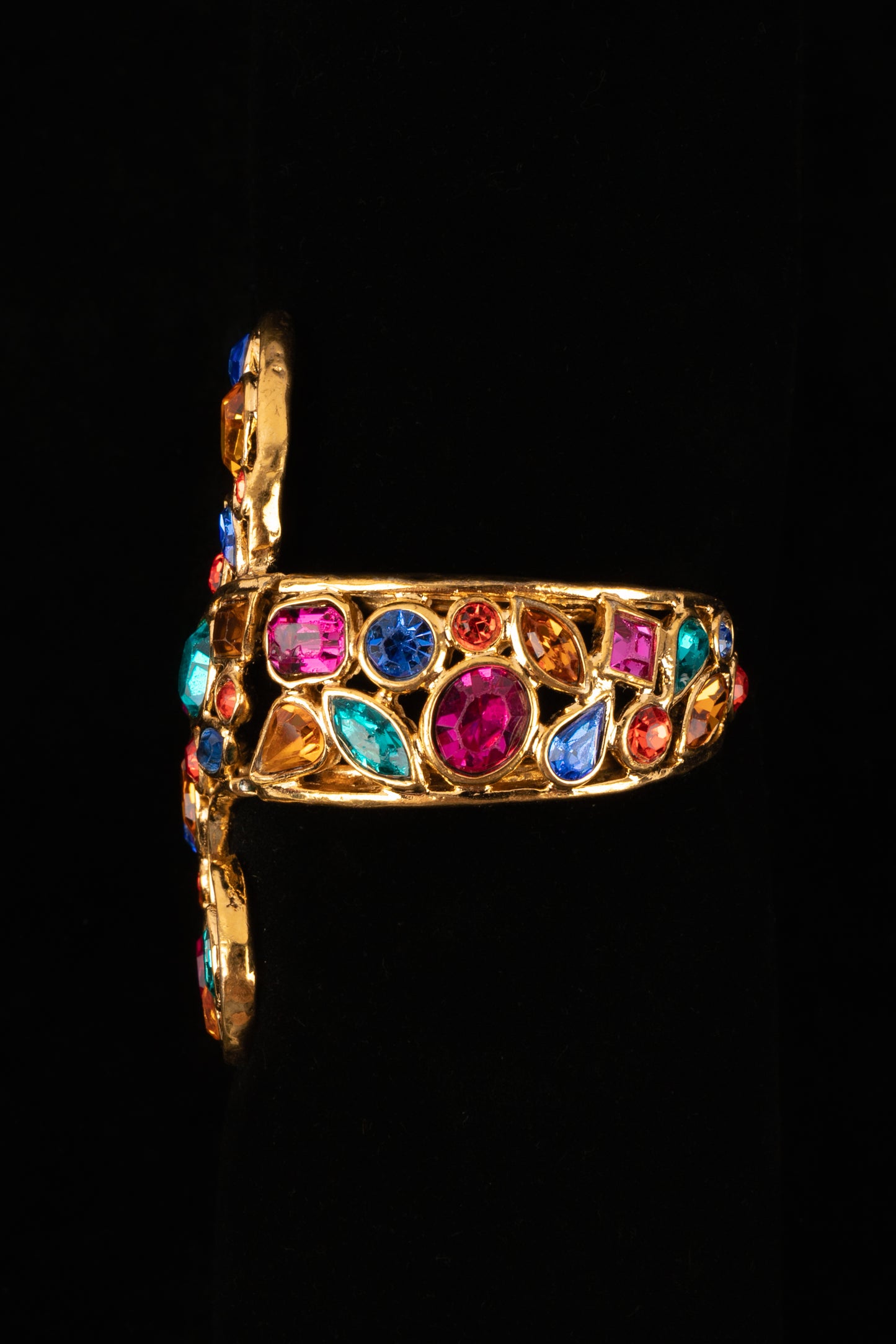 YVES SAINT LAURENT -(Made in France) Bracelet en métal doré ajouré et strass multicolores.