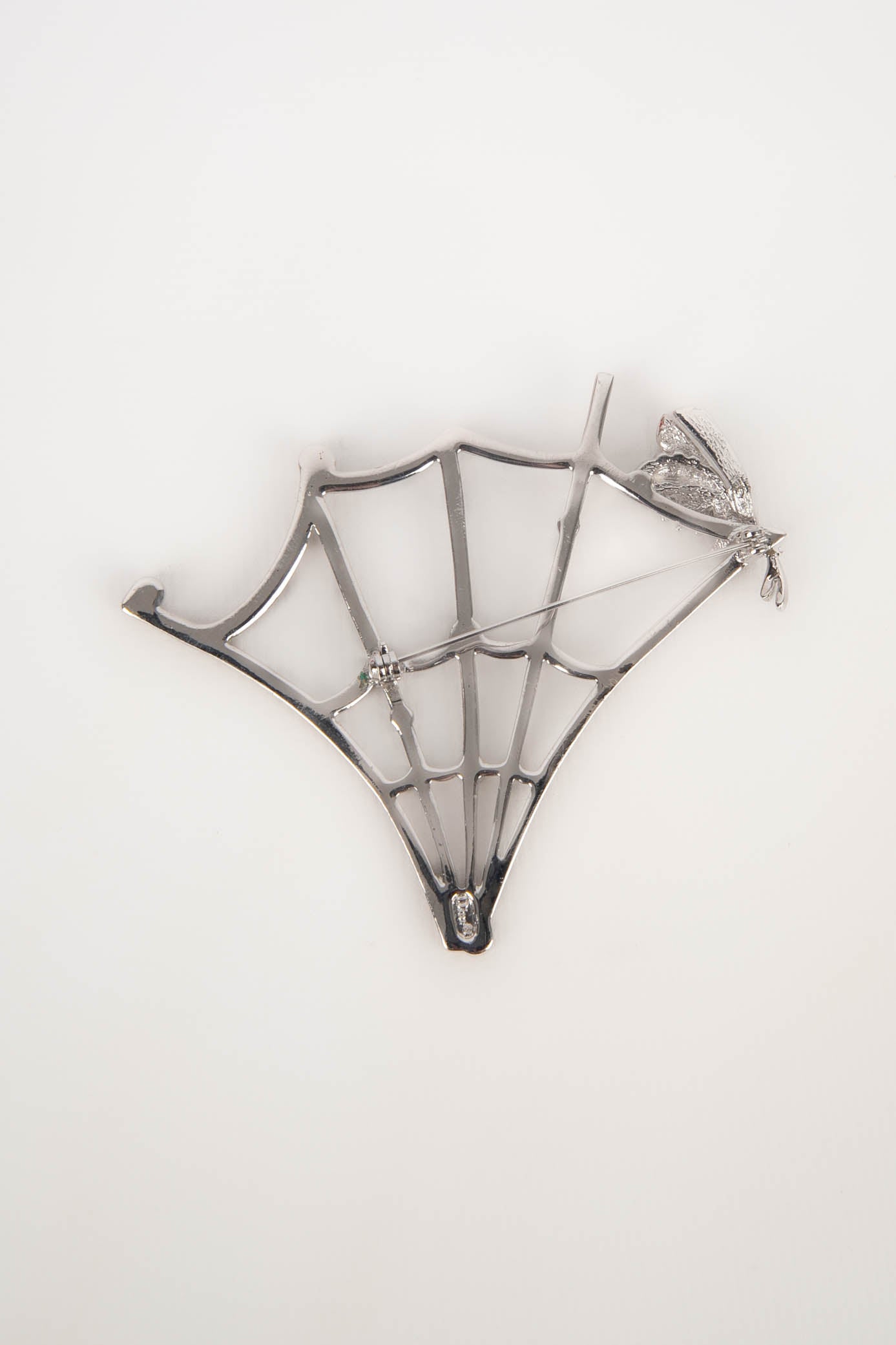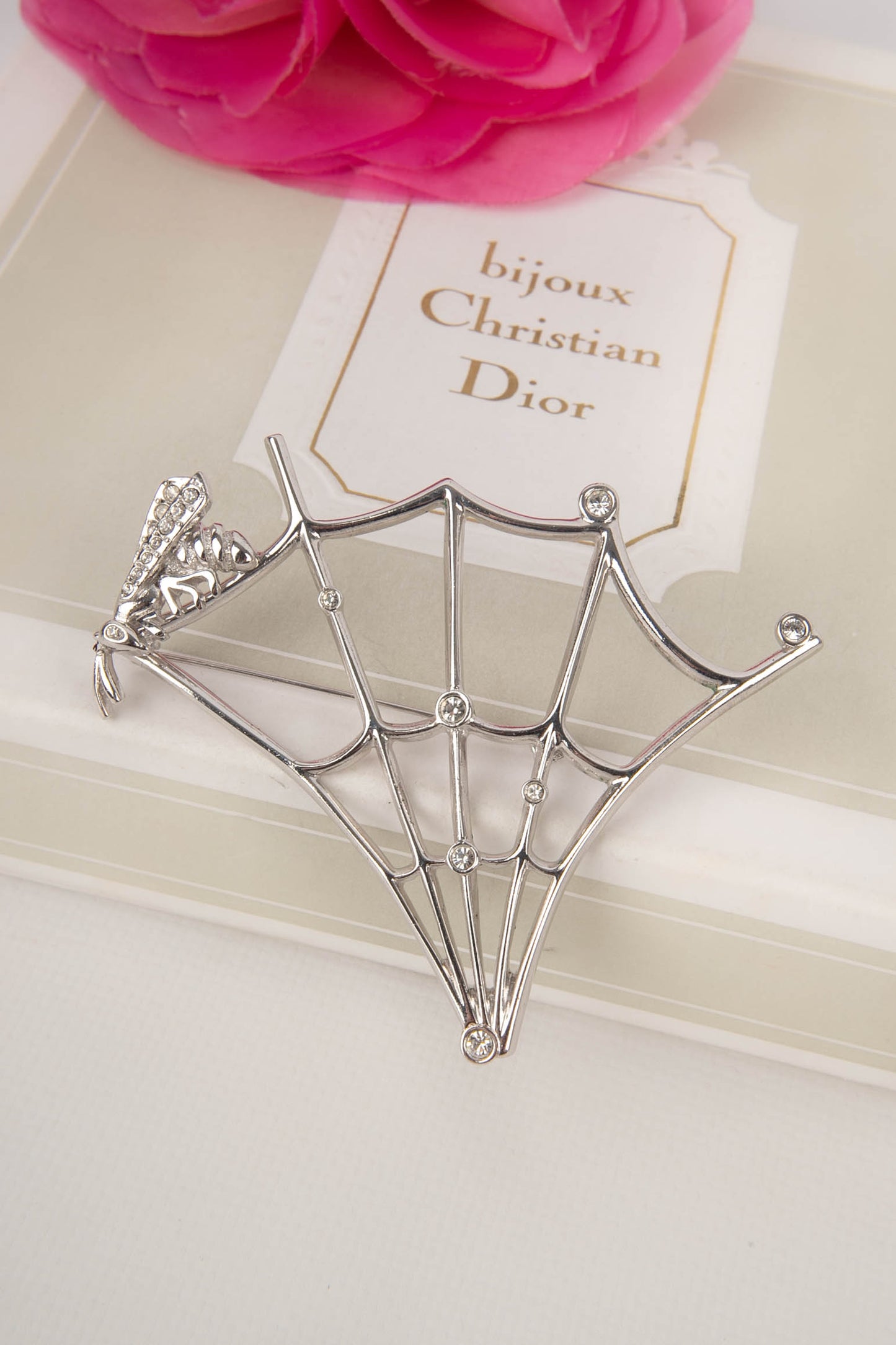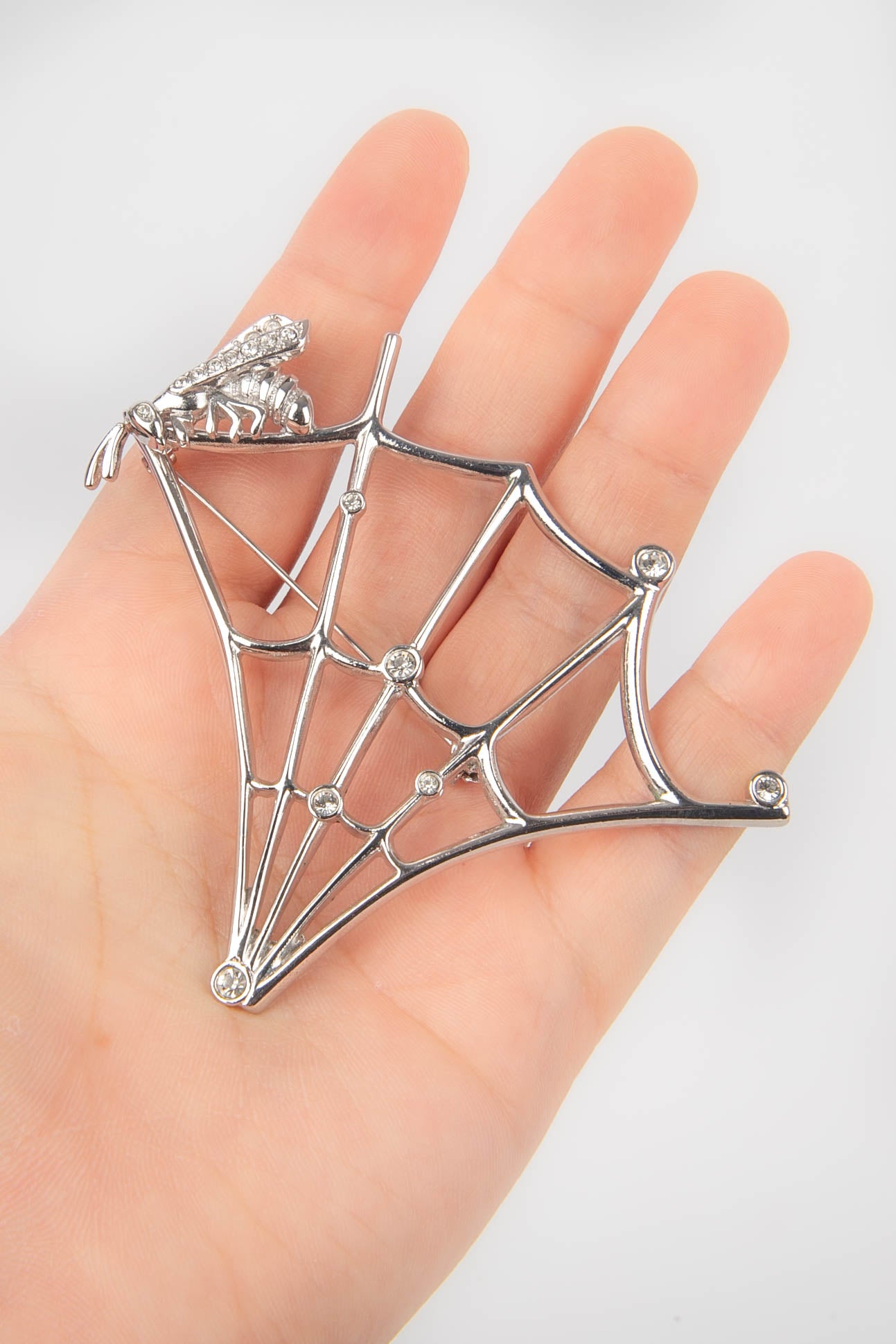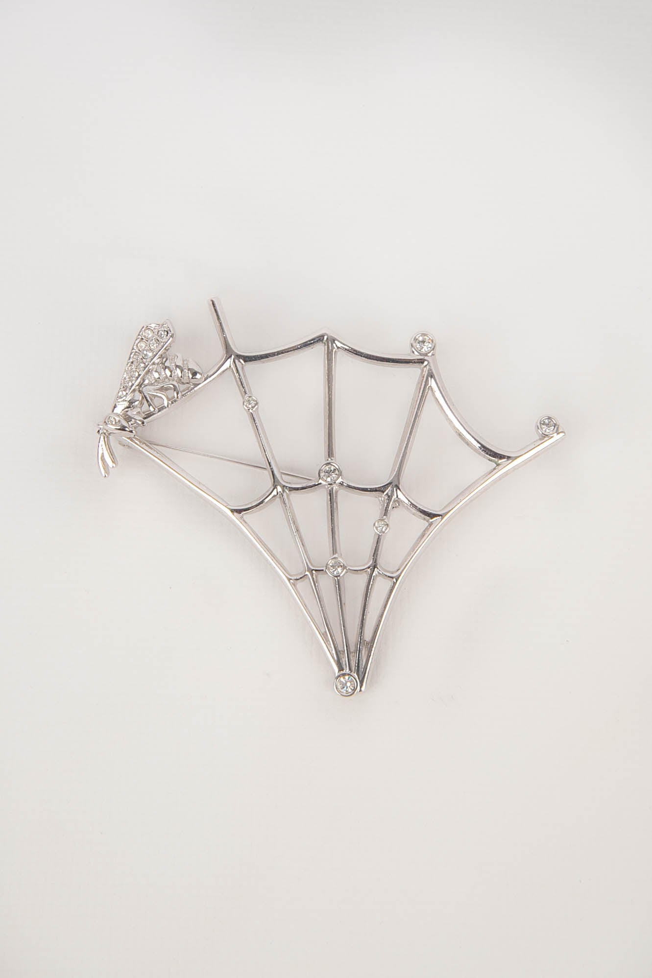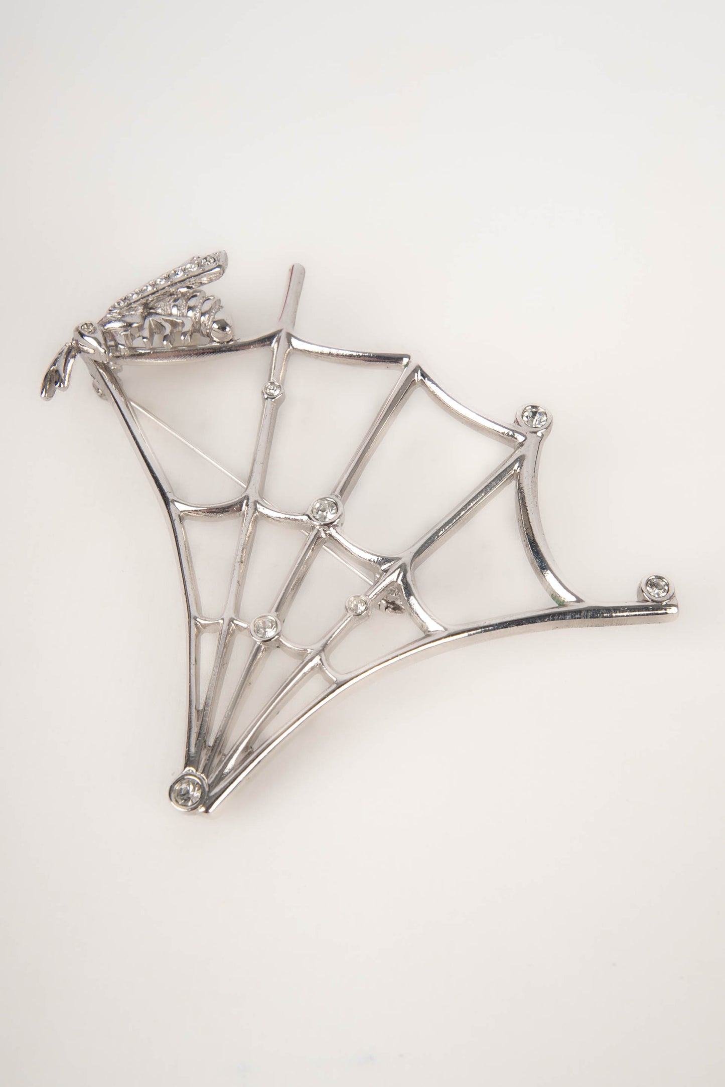 DIOR -(Made in France) Broche en métal argenté et strass de Swarovski figurant une toile d'araignée et une abeille. Pièce réalisée sous la direction artistique de John Galliano.