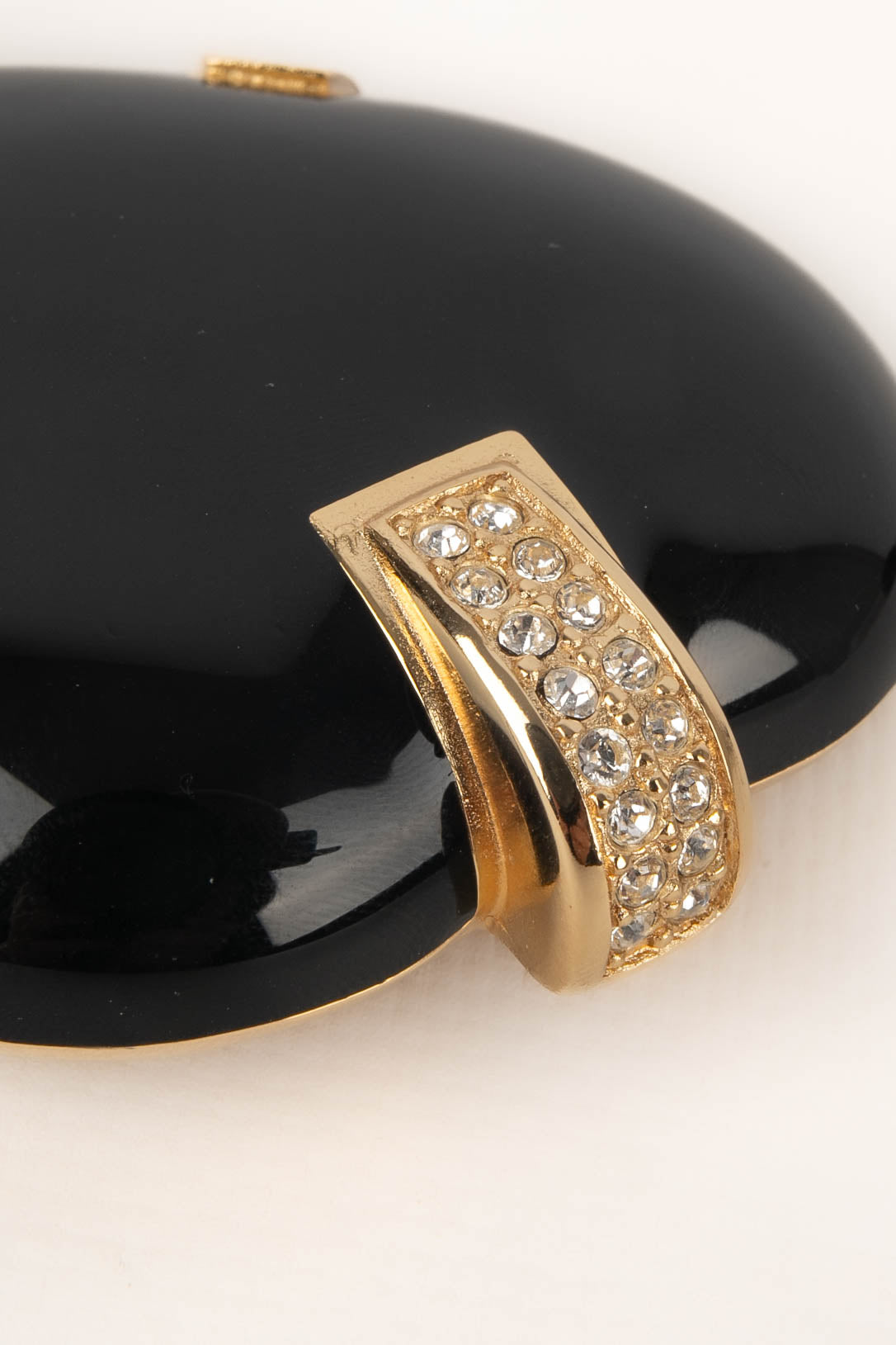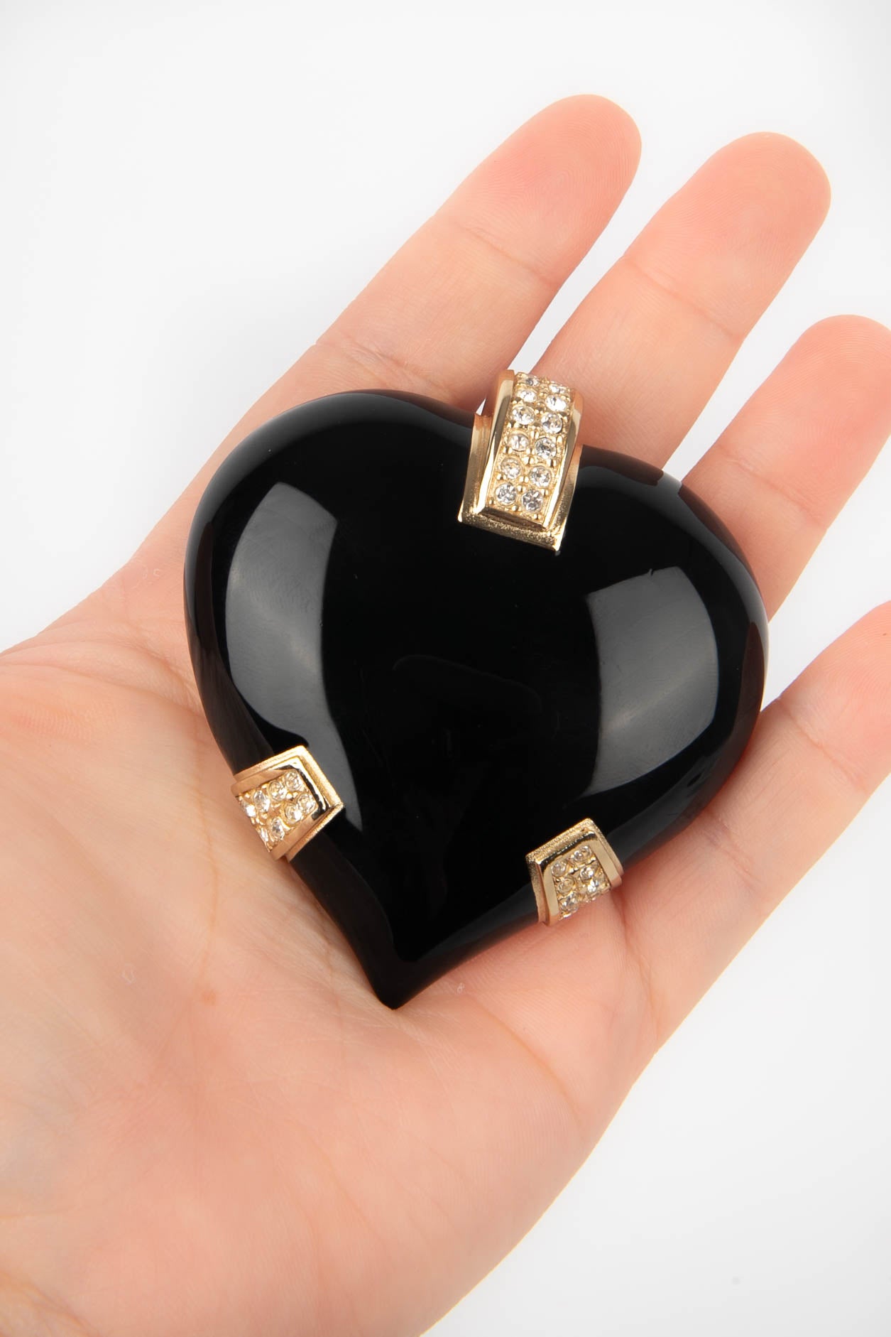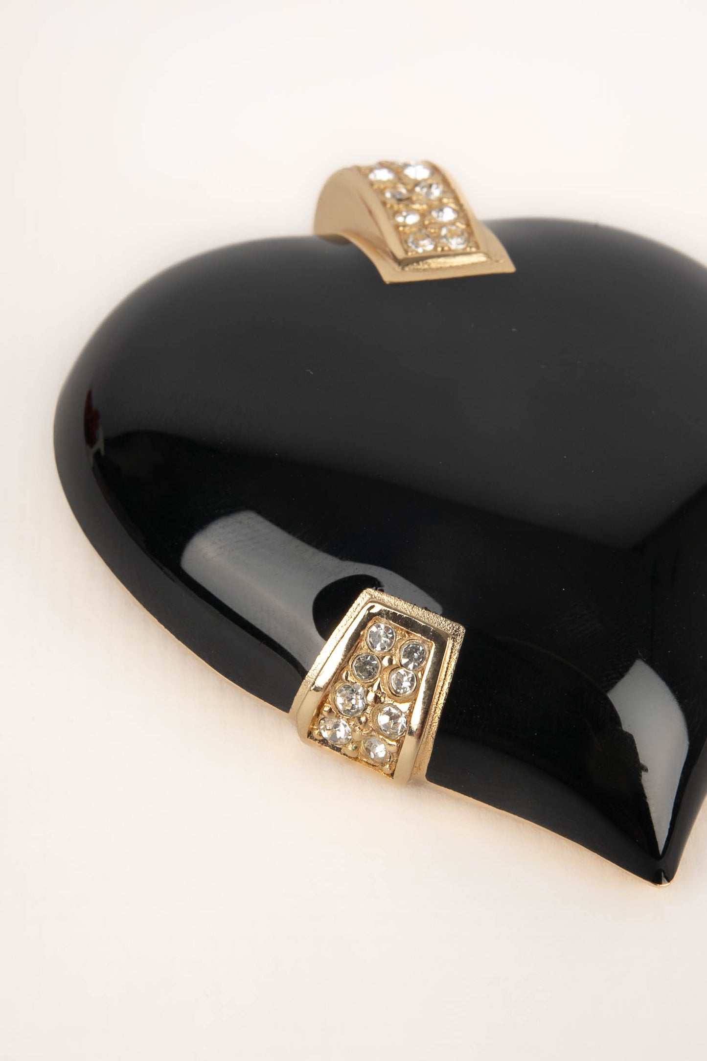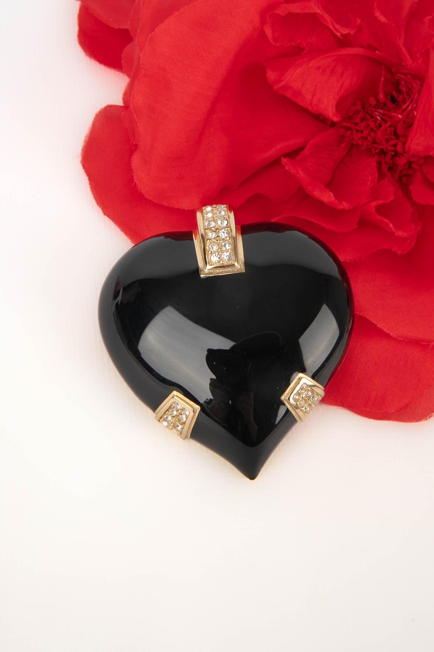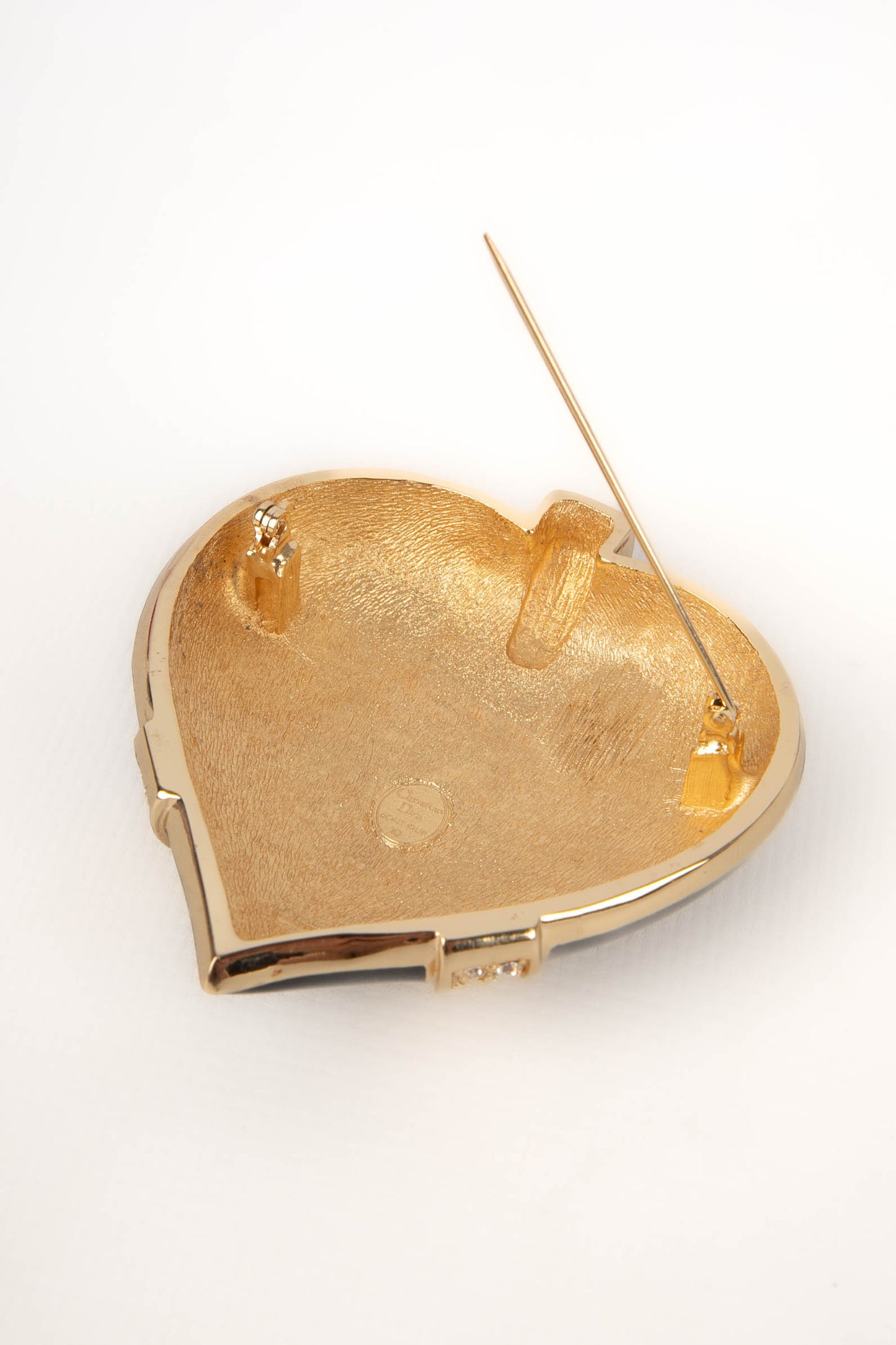 DIOR -(Made in France) Broche en métal doré émaillé de noir figurant un coeur orné de strass.