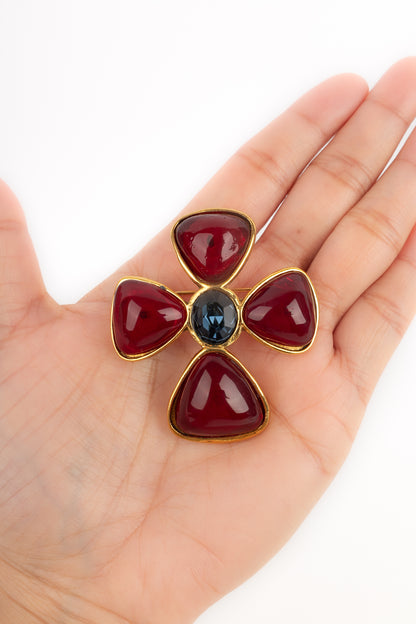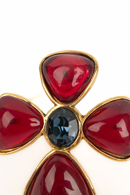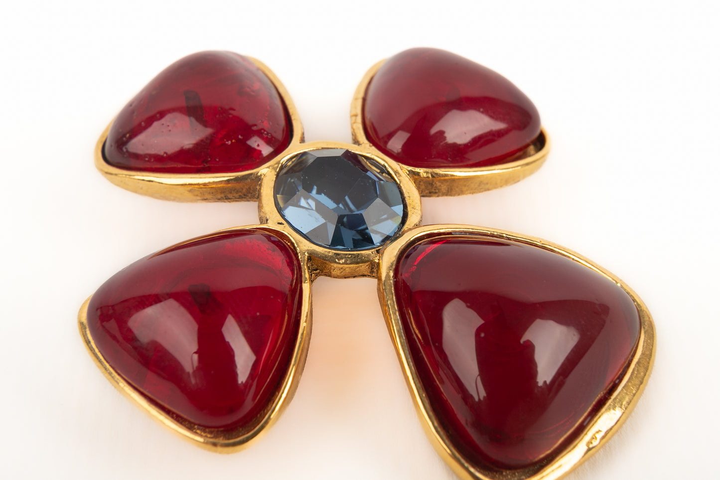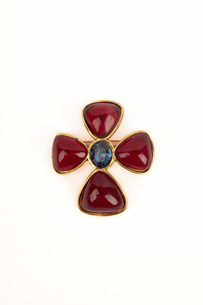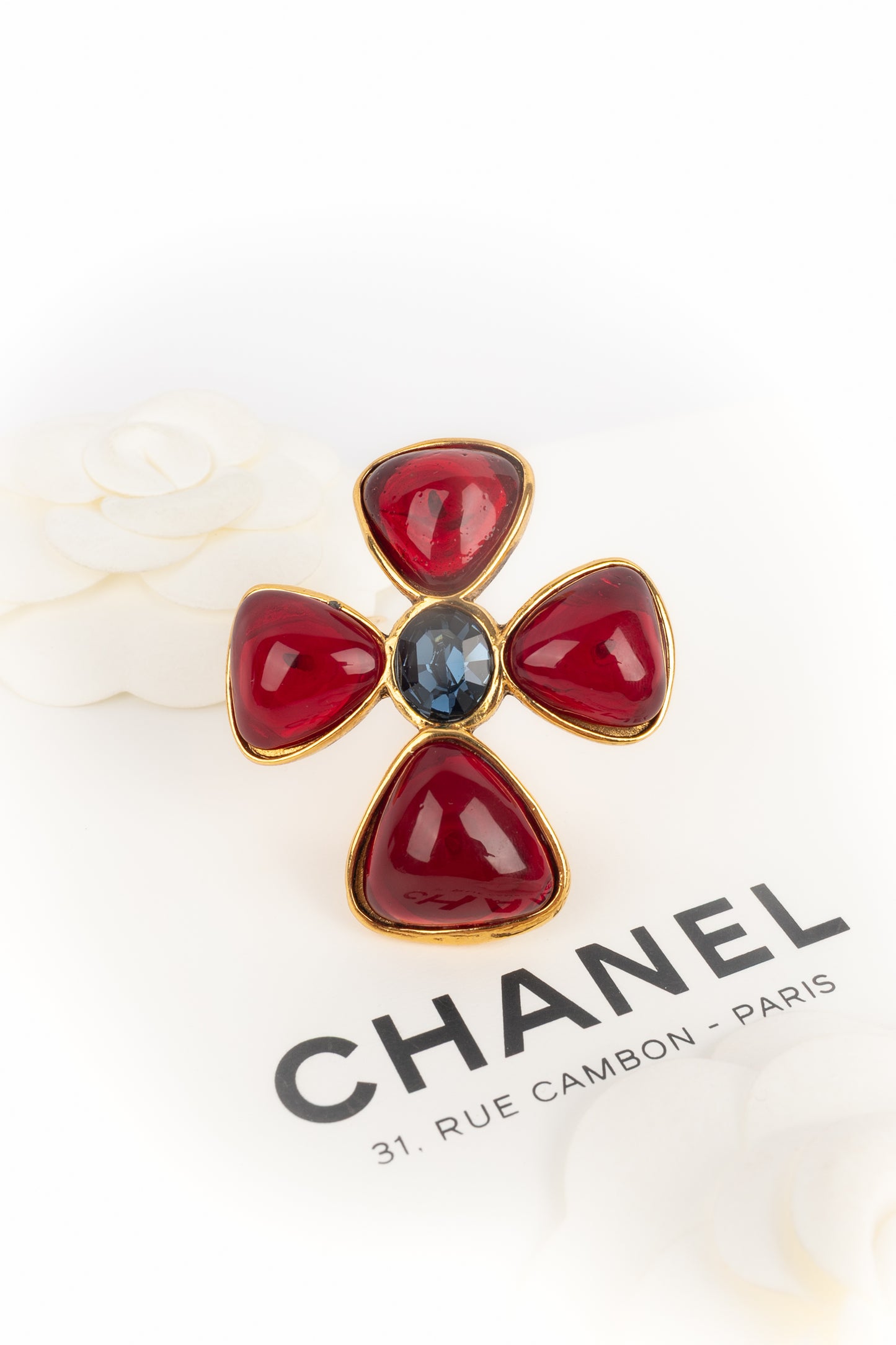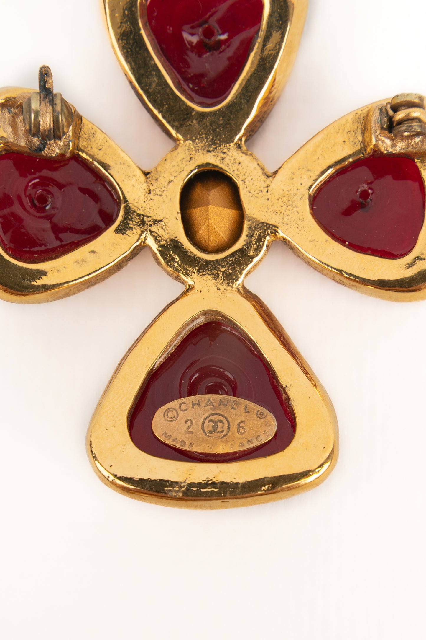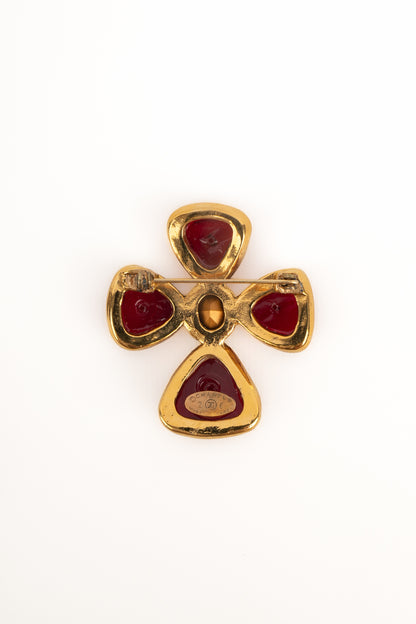 CHANEL -(Made in France) Broche en métal doré et cabochons en pâte de verre figurant une croix. Collection 2cc6 - bijou datant des années 1990.