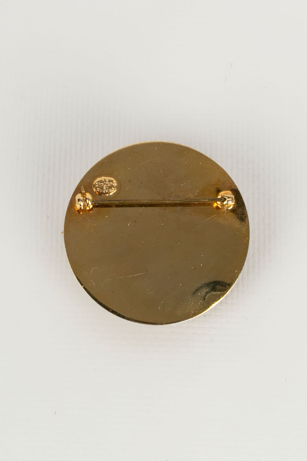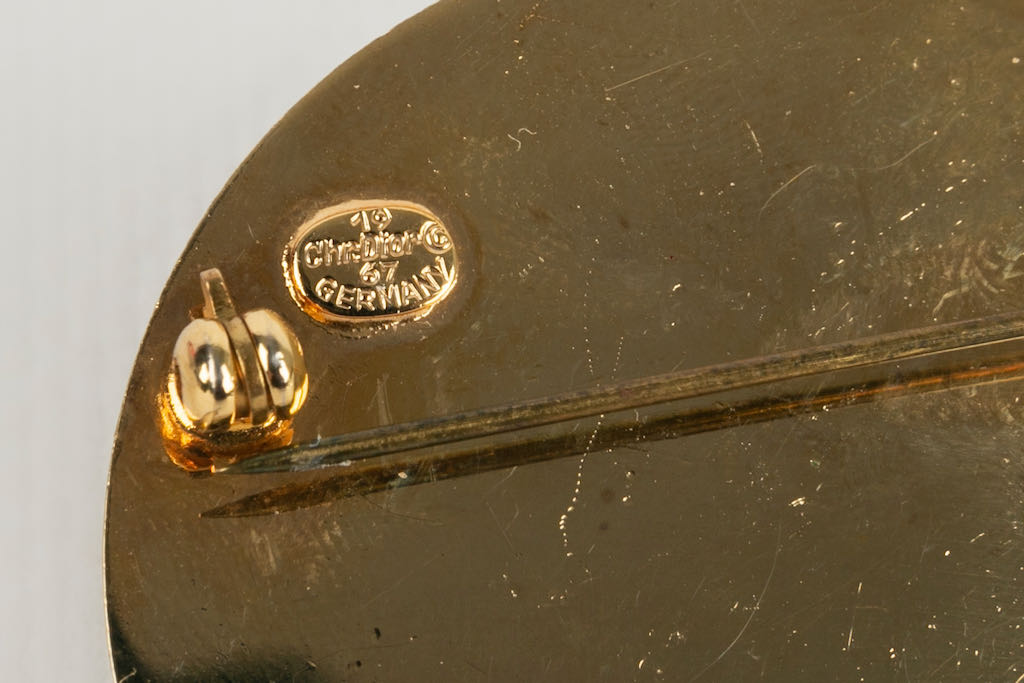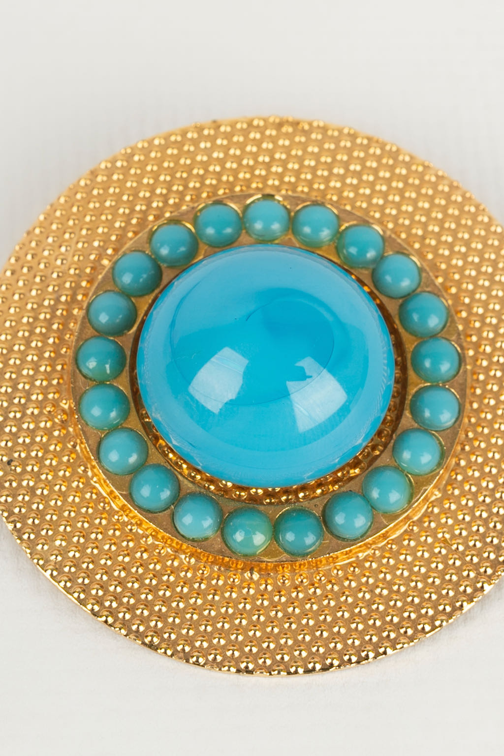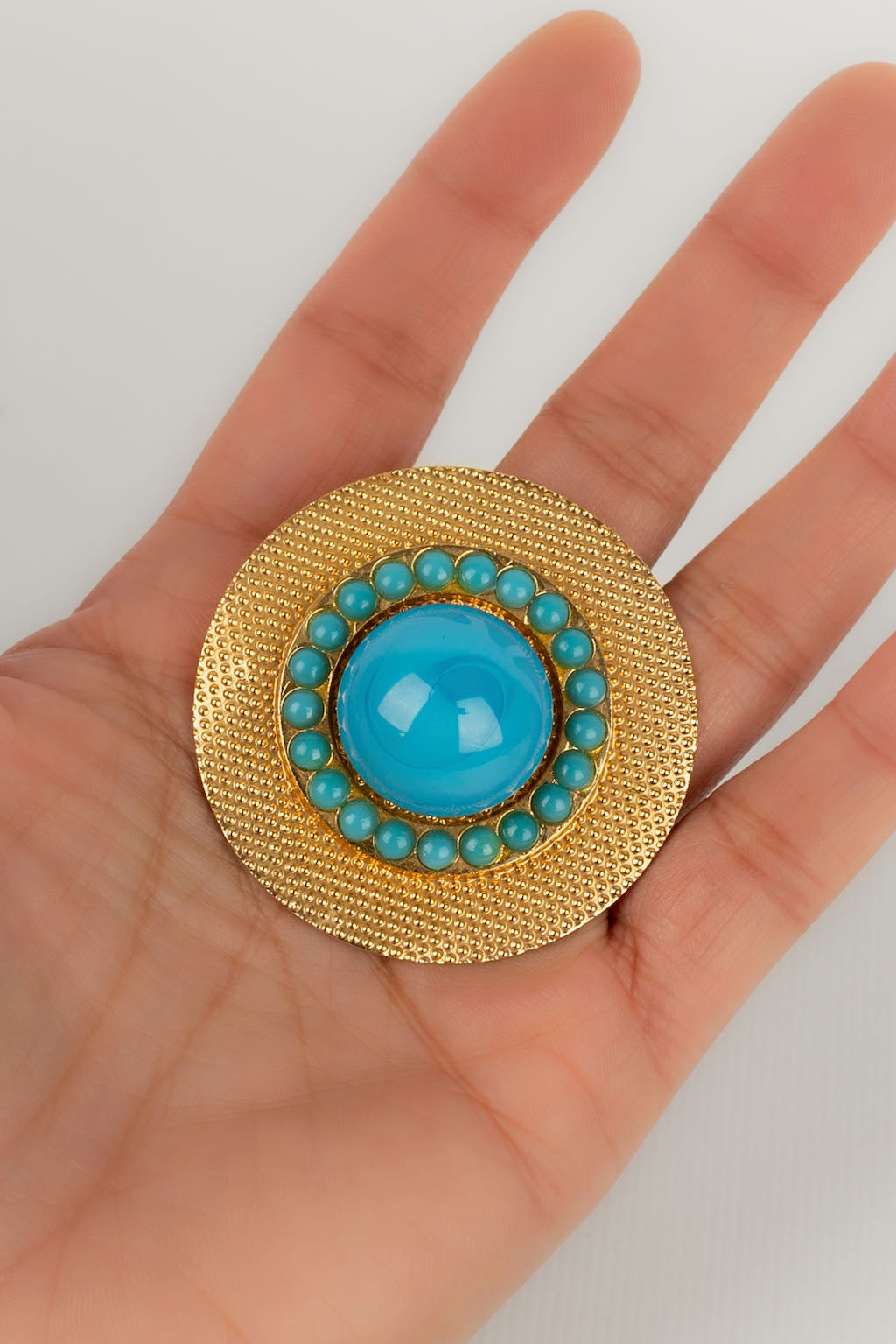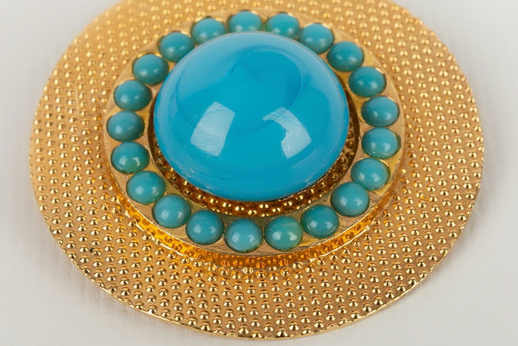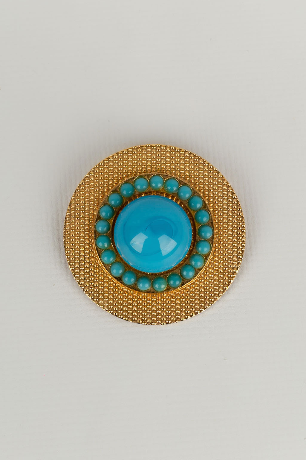 DIOR -(Made in Germany) Broche ronde en métal doré et cabochons turquoises en pâte de verre. Collection 1967.