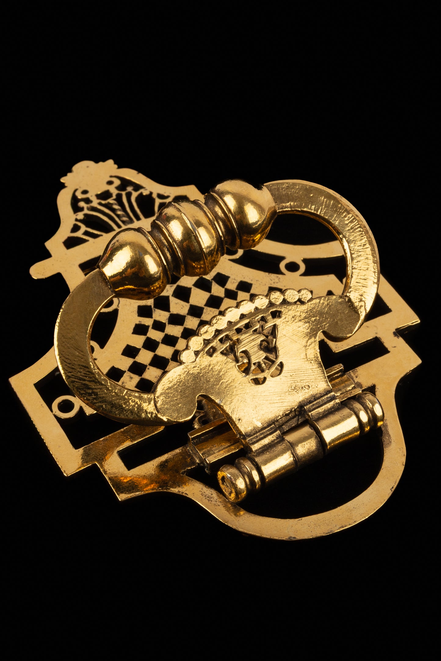 CHANEL -Broche heurtoir de porte en métal doré ajouré. Collection Automne-Hiver 1989 sous la direction artistique de Karl Lagerfeld.