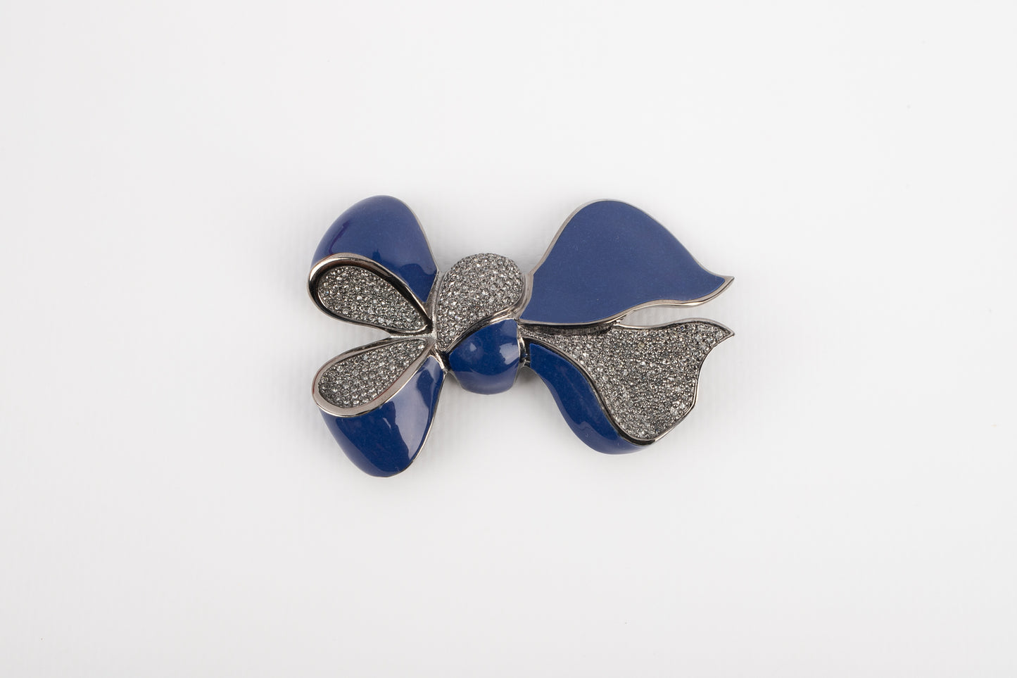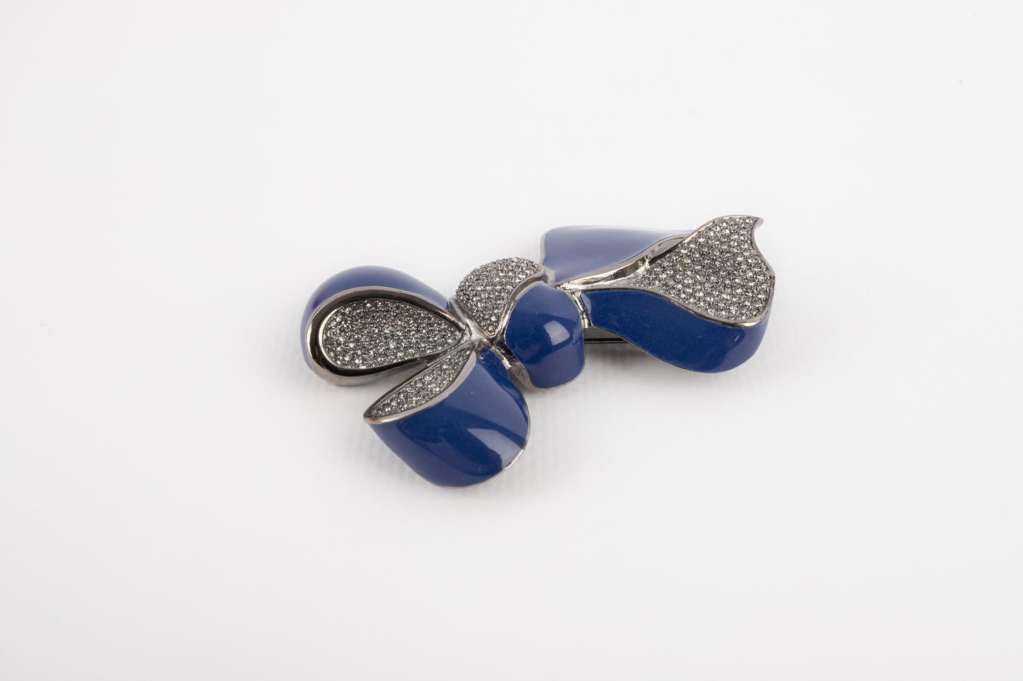 DIOR -Broche en métal argenté foncé figurant un noeud émaillé de bleu et de strass. Bijou datant des années 2000.