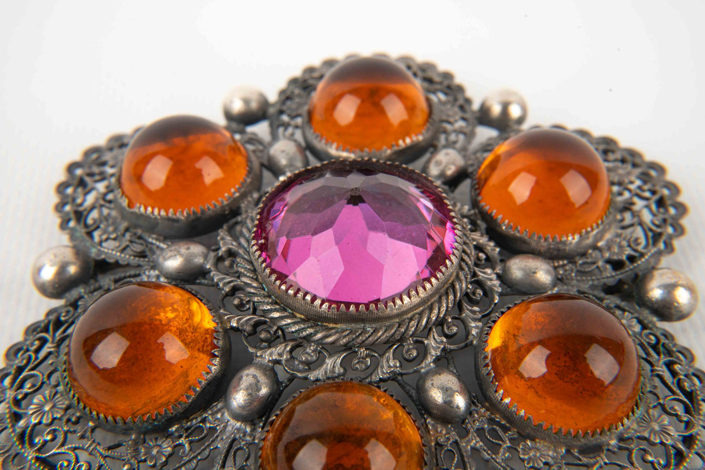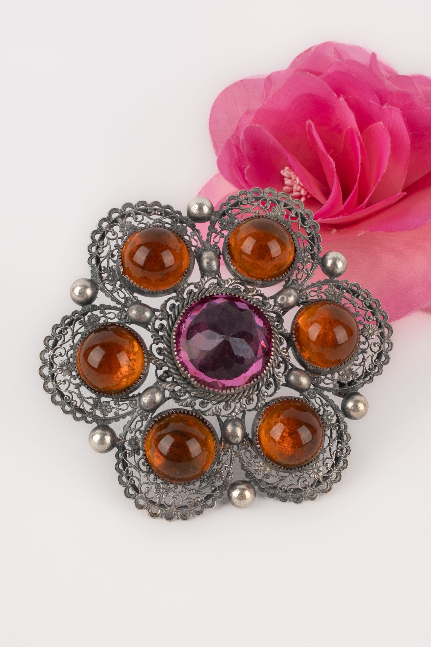THÉÂTRE - Broche en métal argenté ajouré et cabochons de verre surmontée d'un strass violet.