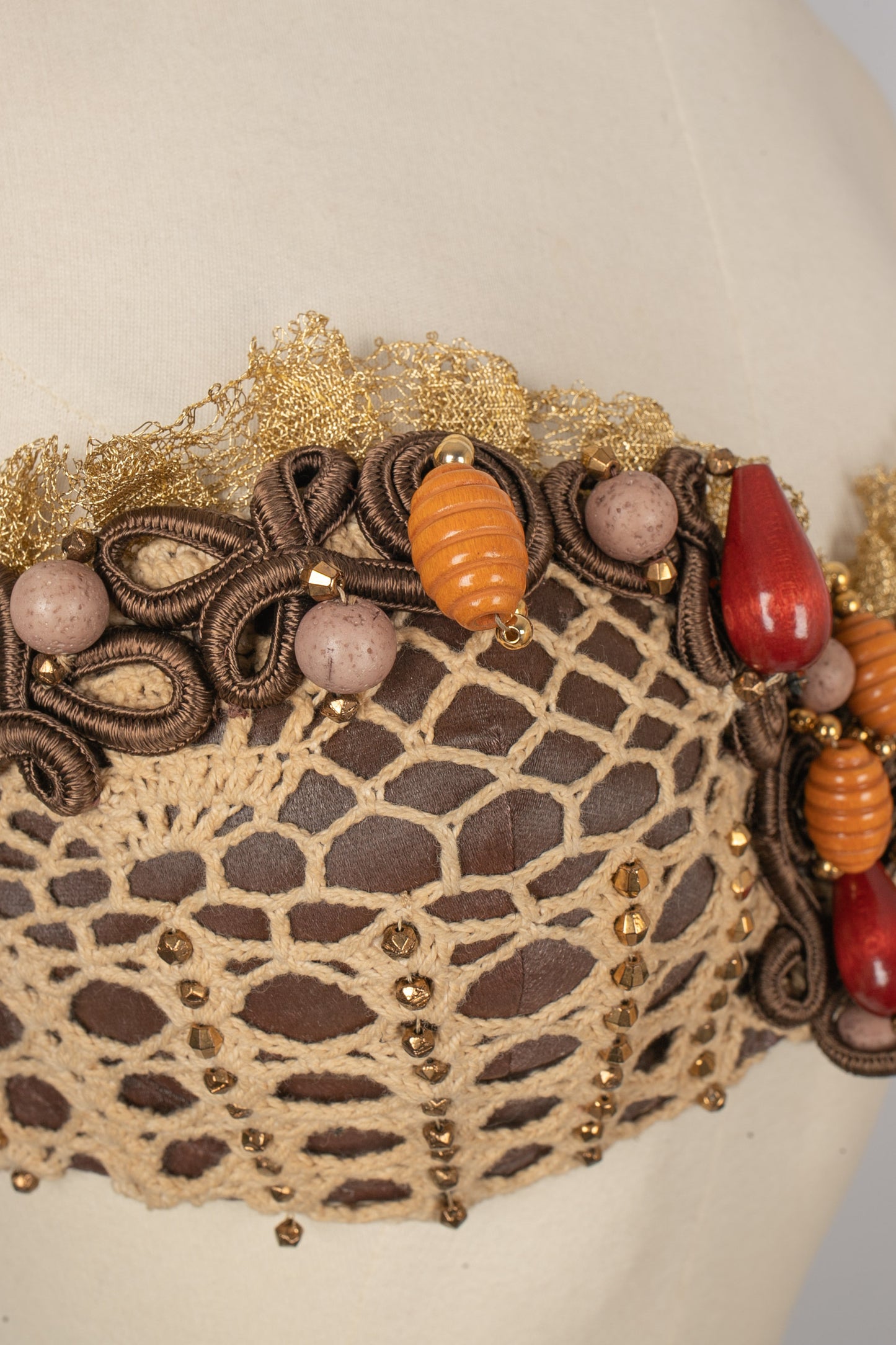 TORRENTE - Top bustier court en toile marron recouvert d'un dessin au crochet, passementerie, dentelle dorée et perles. Pas de taille indiquée, il convient à un 34/36FR.