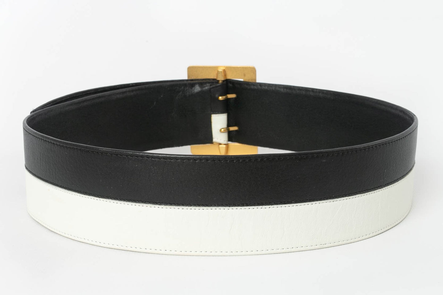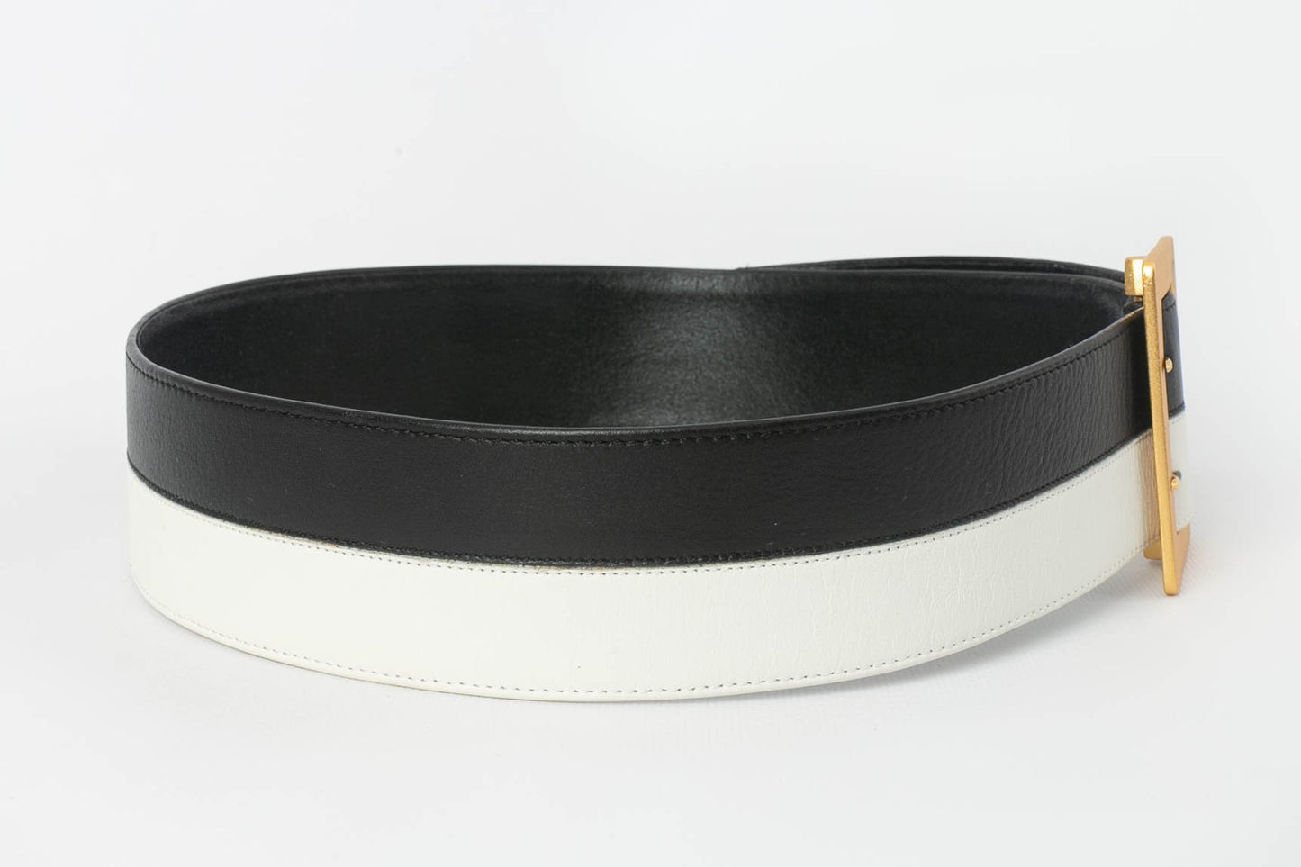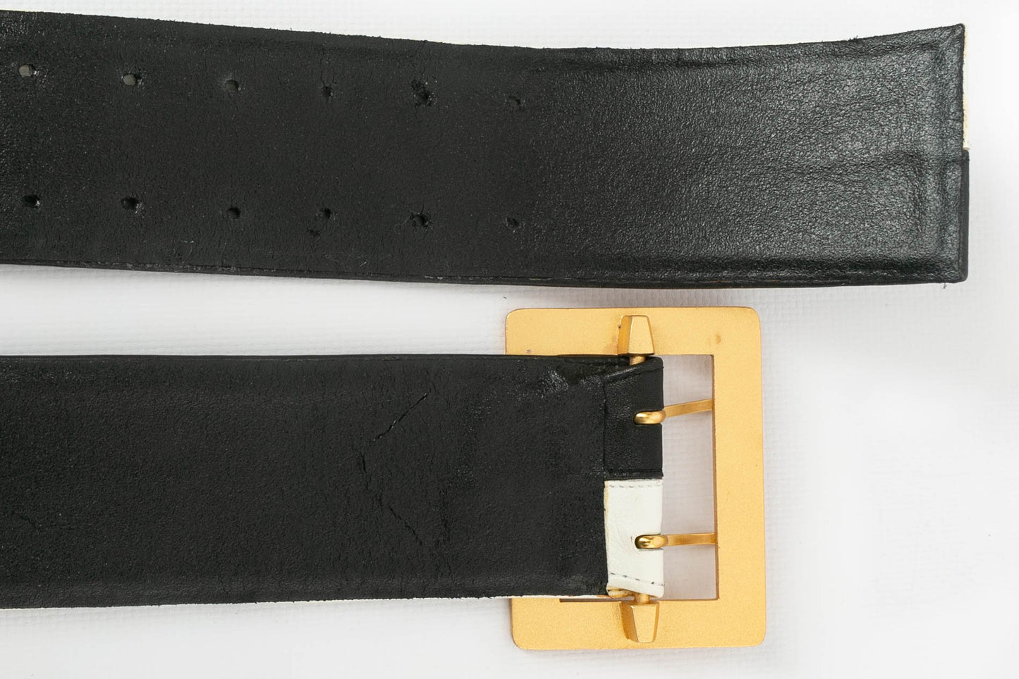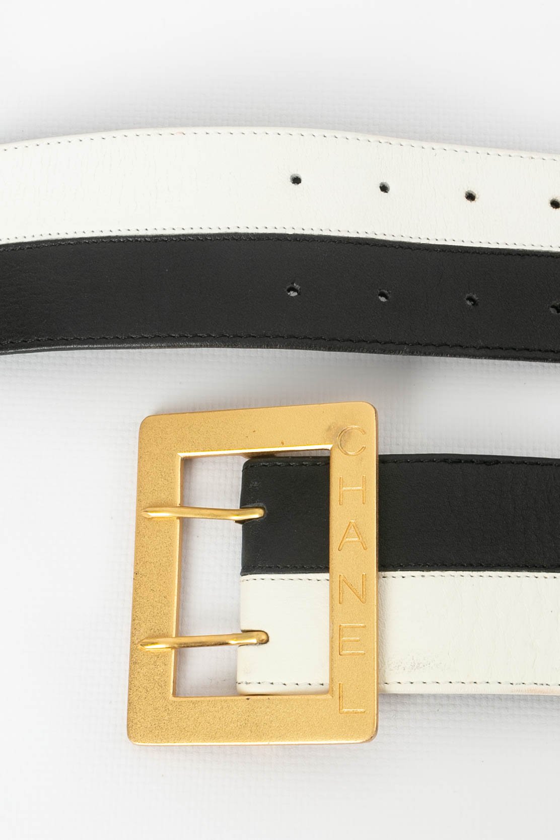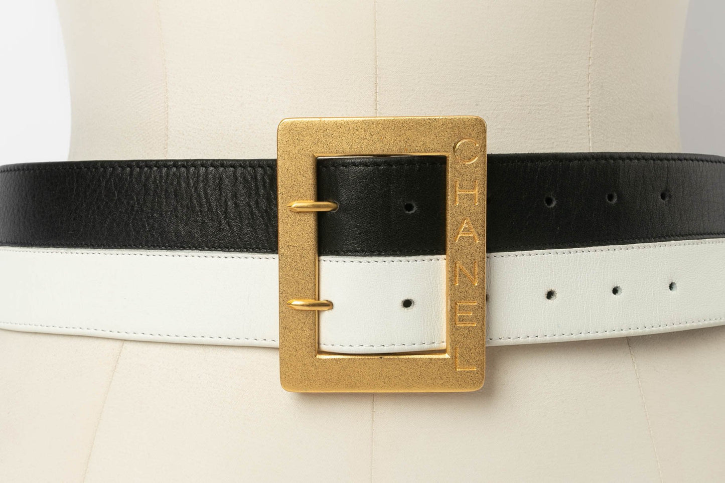 CHANEL -(Made in France) Ceinture en cuir noir et blanc, ornée d'une boucle en métal doré gravée Chanel. Taille 80. Collection Printemps-Eté 1995 sous la direction artistique de Karl Lagerfeld.