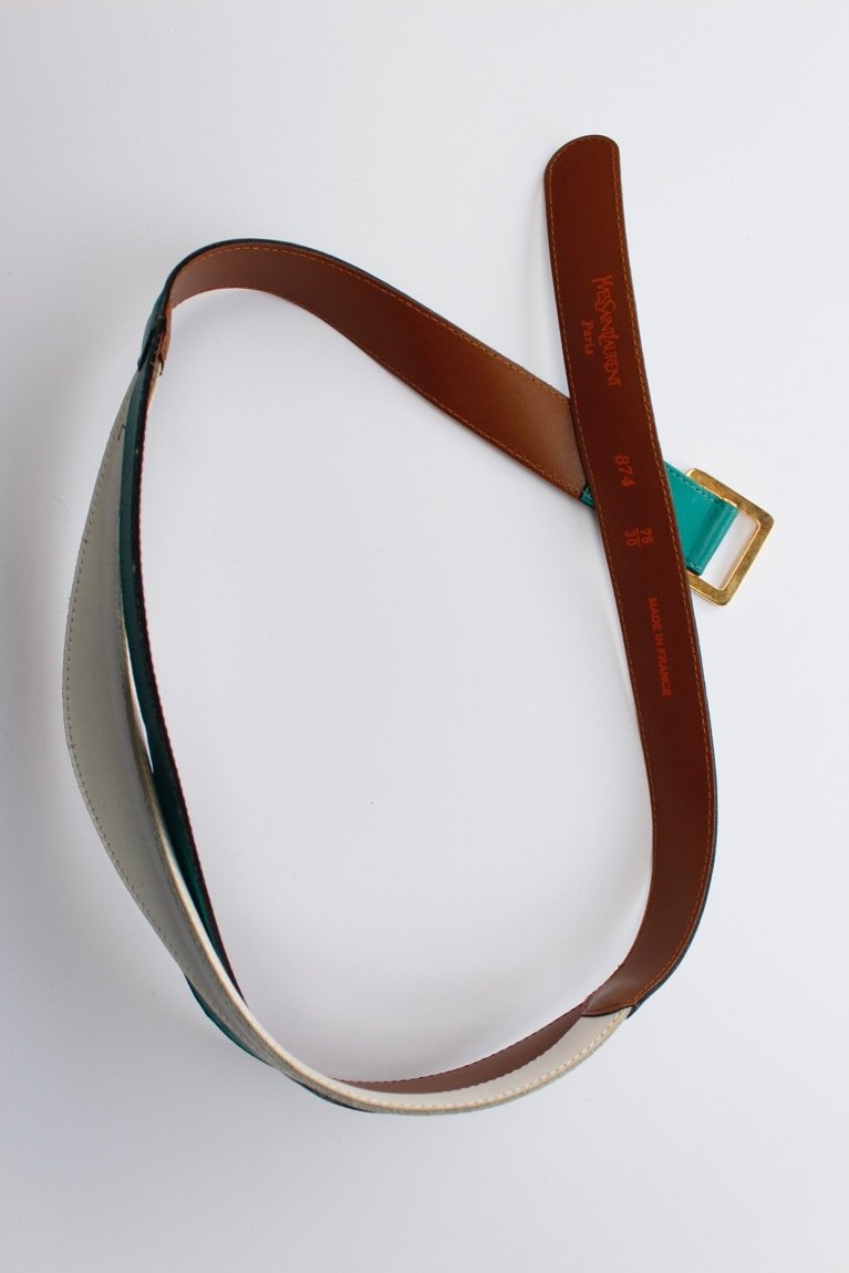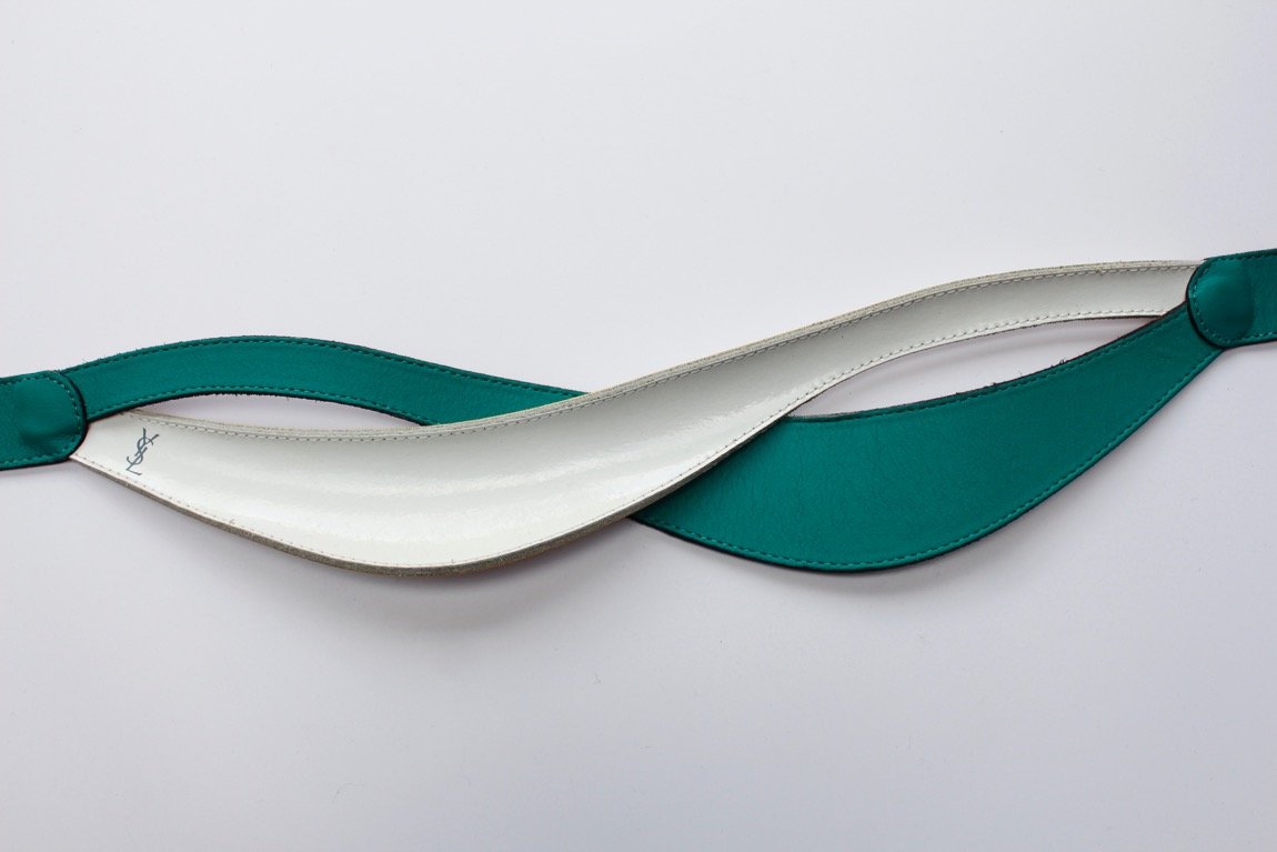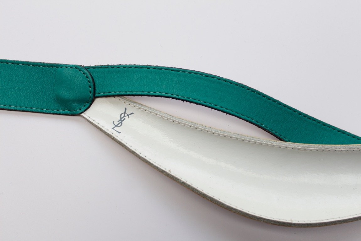 YVES SAINT LAURENT -(Made in France) Ceinture en cuir blanc et vert. Taille 75. A signaler, quelques légères tâches sur le cuir.