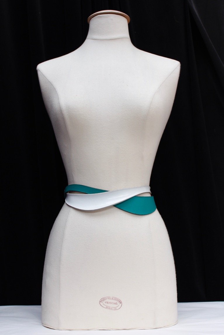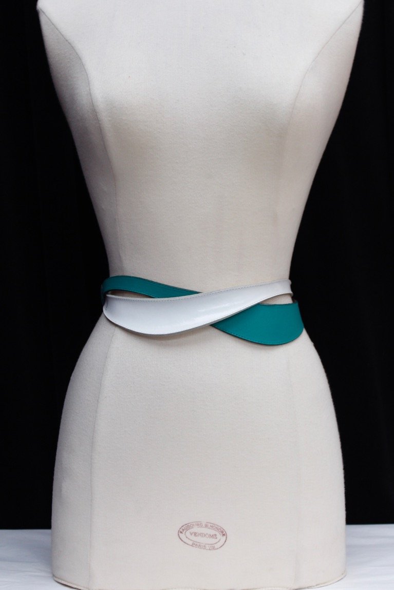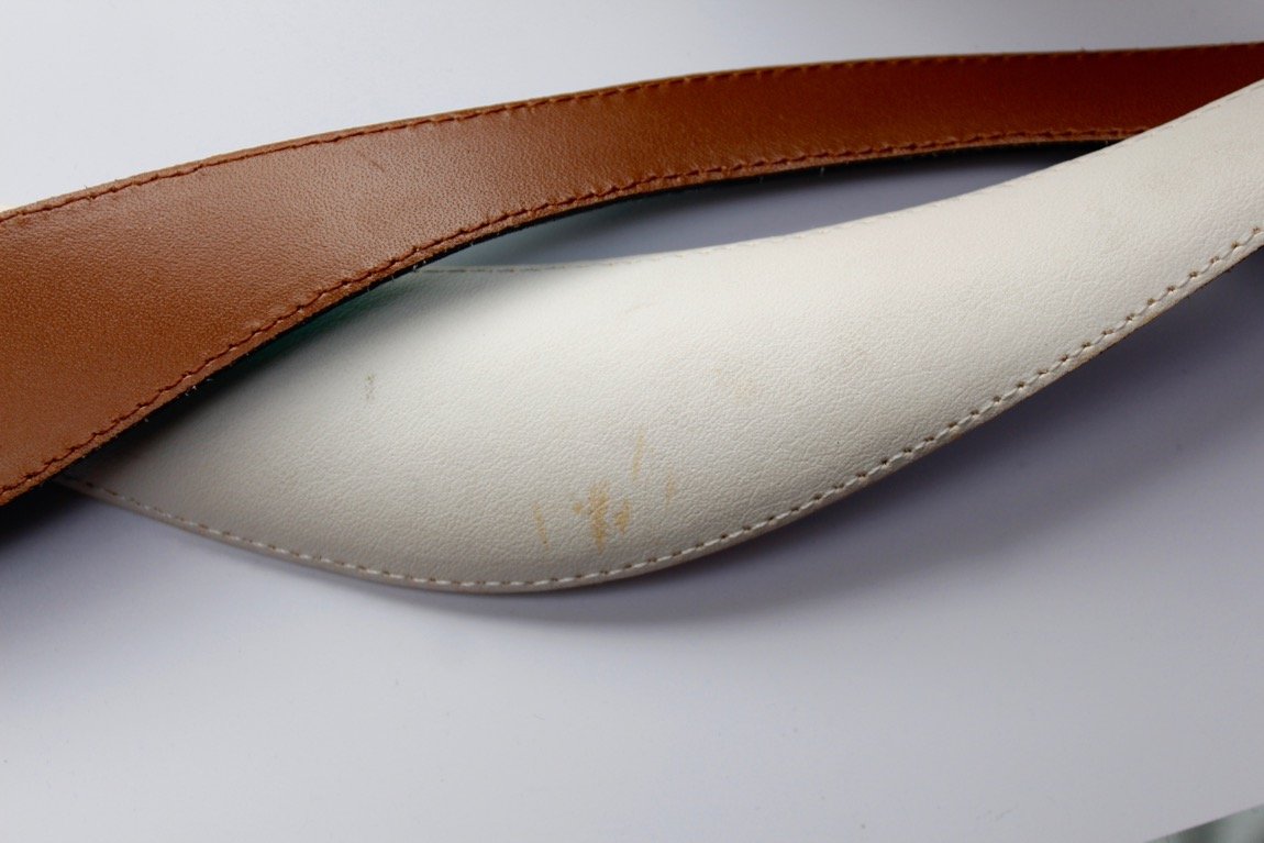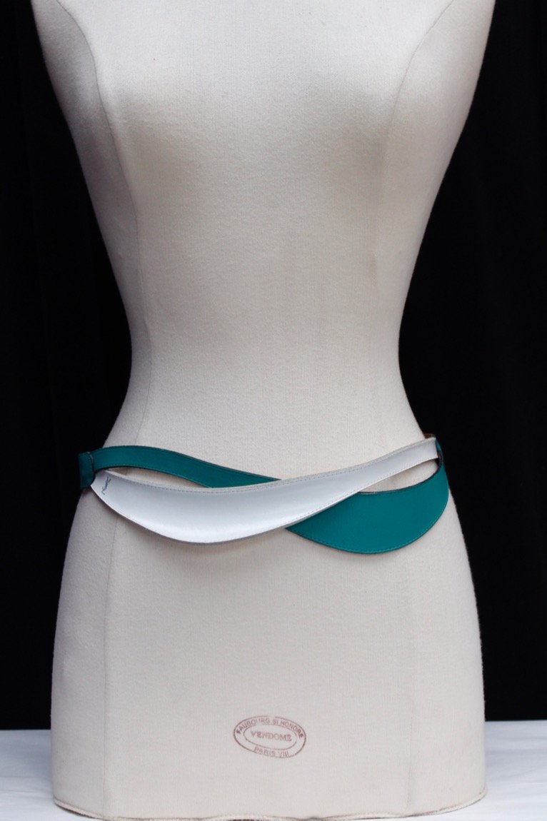 YVES SAINT LAURENT -(Made in France) Ceinture en cuir blanc et vert. Taille 75. A signaler, quelques légères tâches sur le cuir.