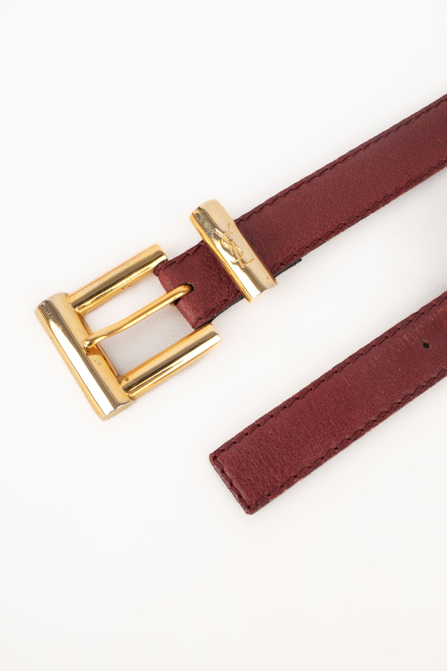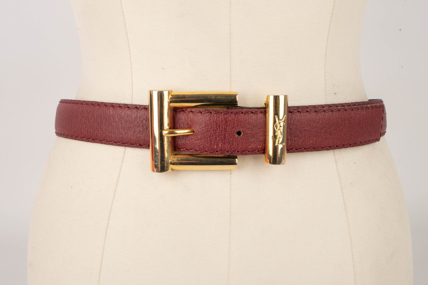 YVES SAINT LAURENT -(Made in France) Ceinture en cuir couleur bordeaux et métal doré.