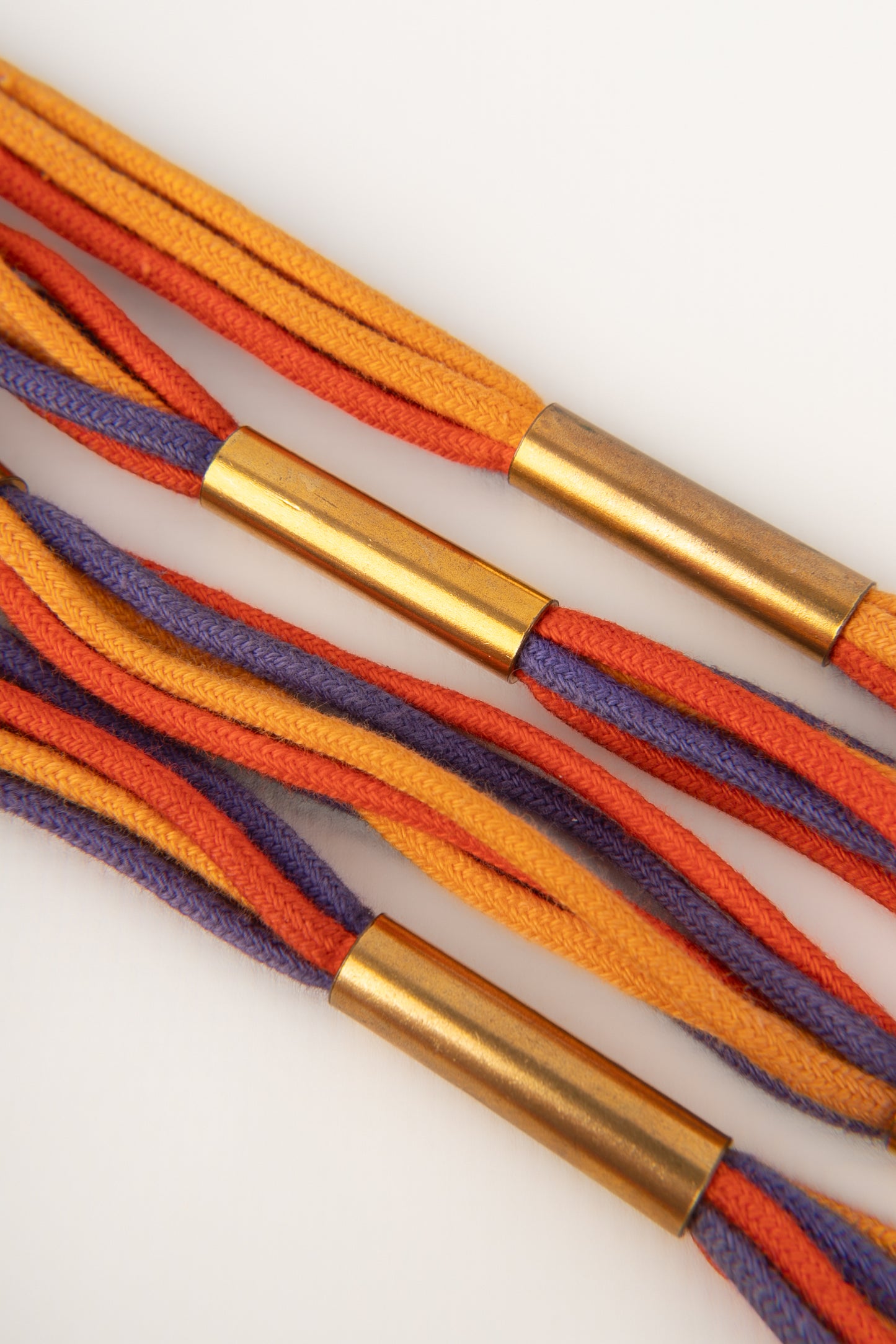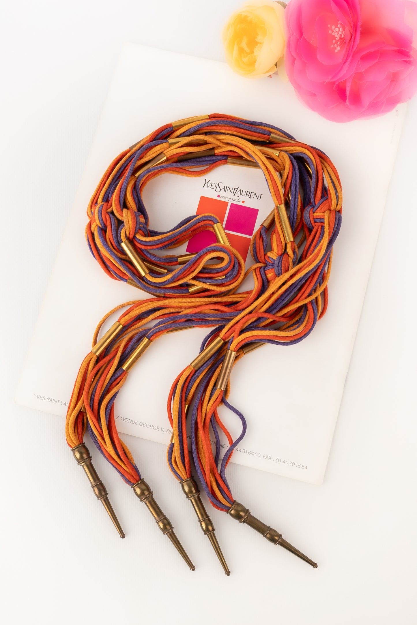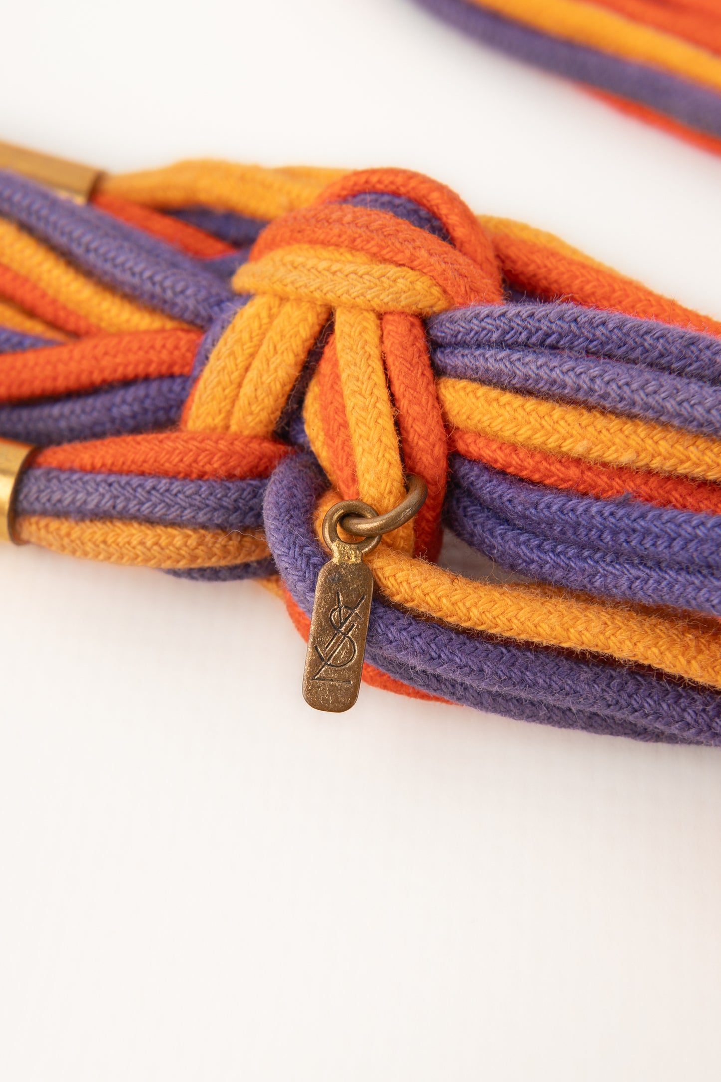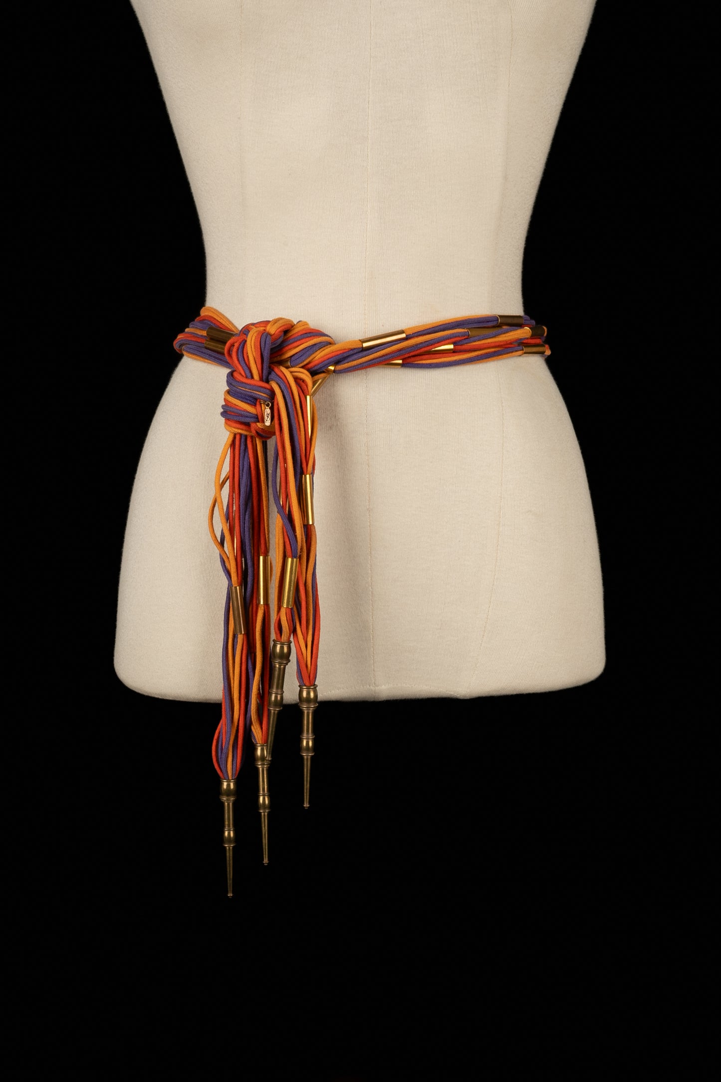 YVES SAINT LAURENT -Ancienne ceinture en cordons de coton coloré et éléments en métal doré. Non signée.