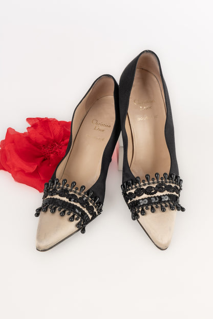 DIOR - (Made in Italy) Escarpins en satin noir et crème ornés de perles. Taille 38FR.