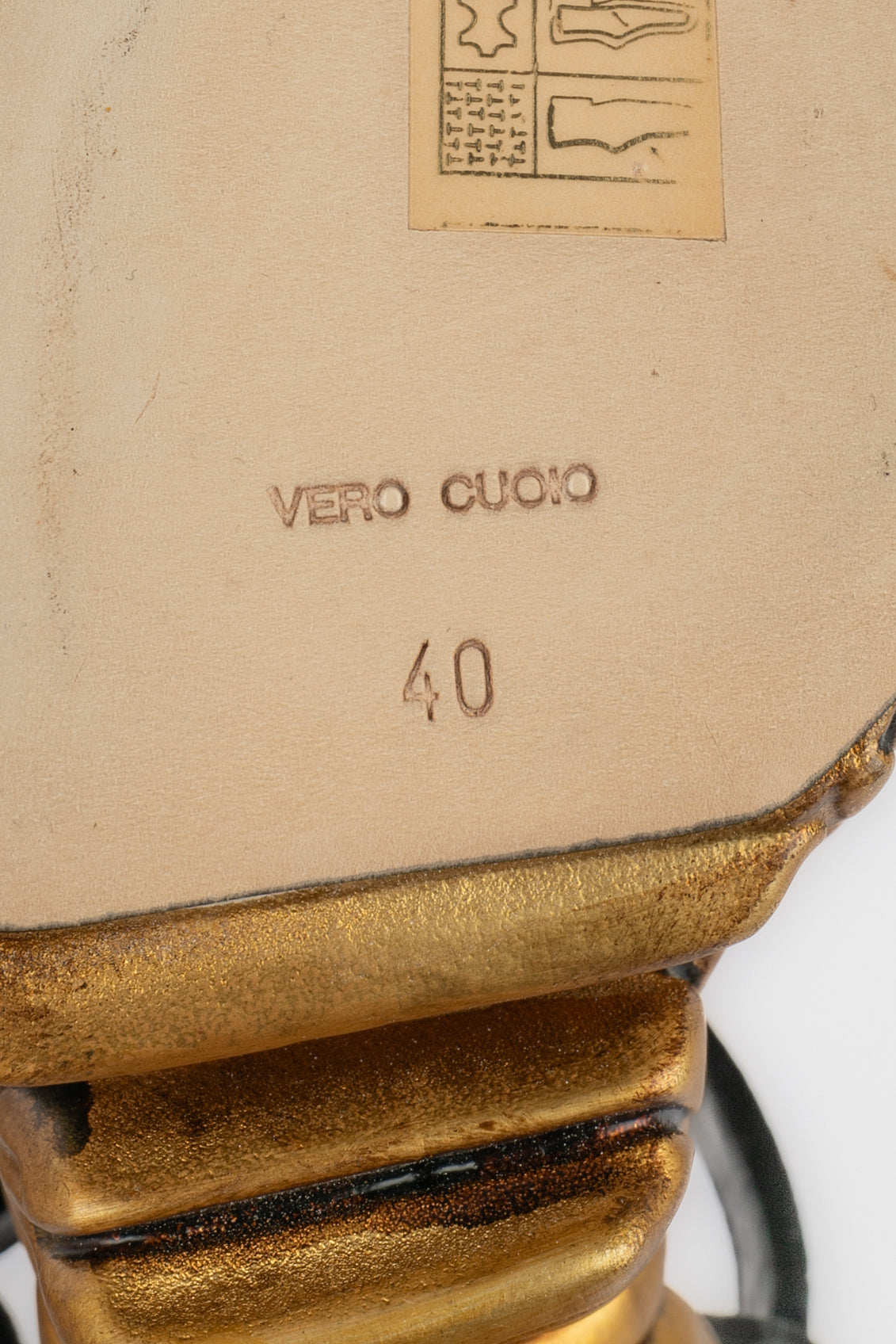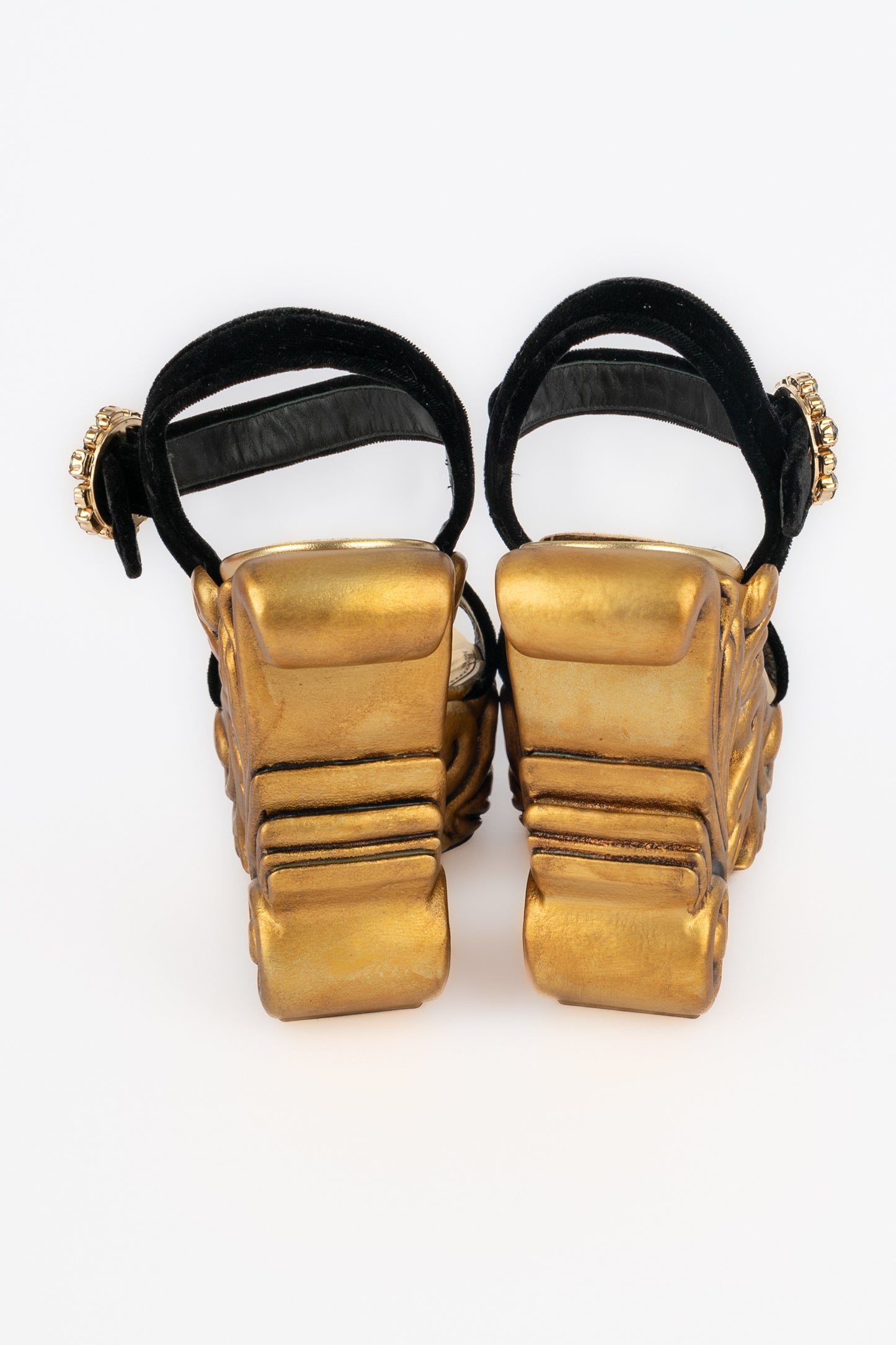DOLCE & GABBANA -(Made in Italy) Sandales à talons en cuir, velours noir et imposante plateforme d'inspiration baroque en résine dorée. Taille indiquée 40FR.