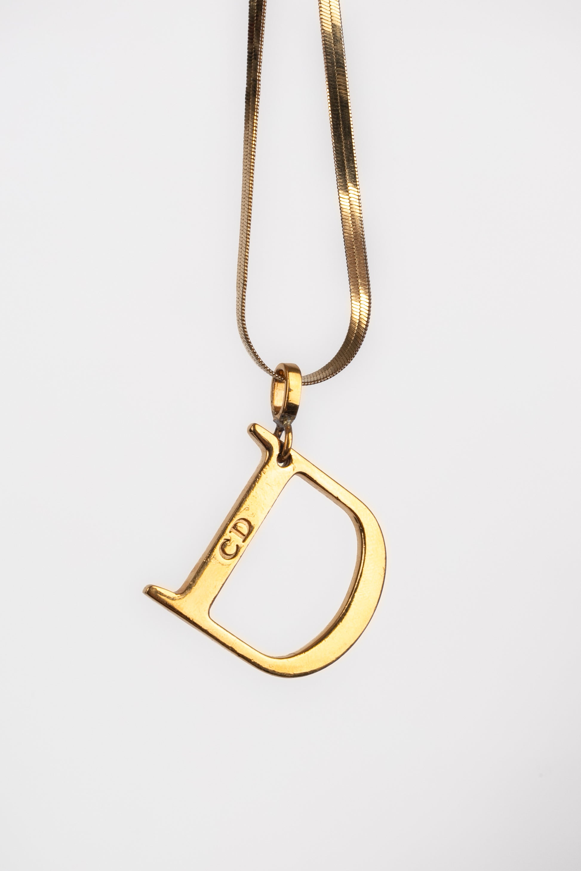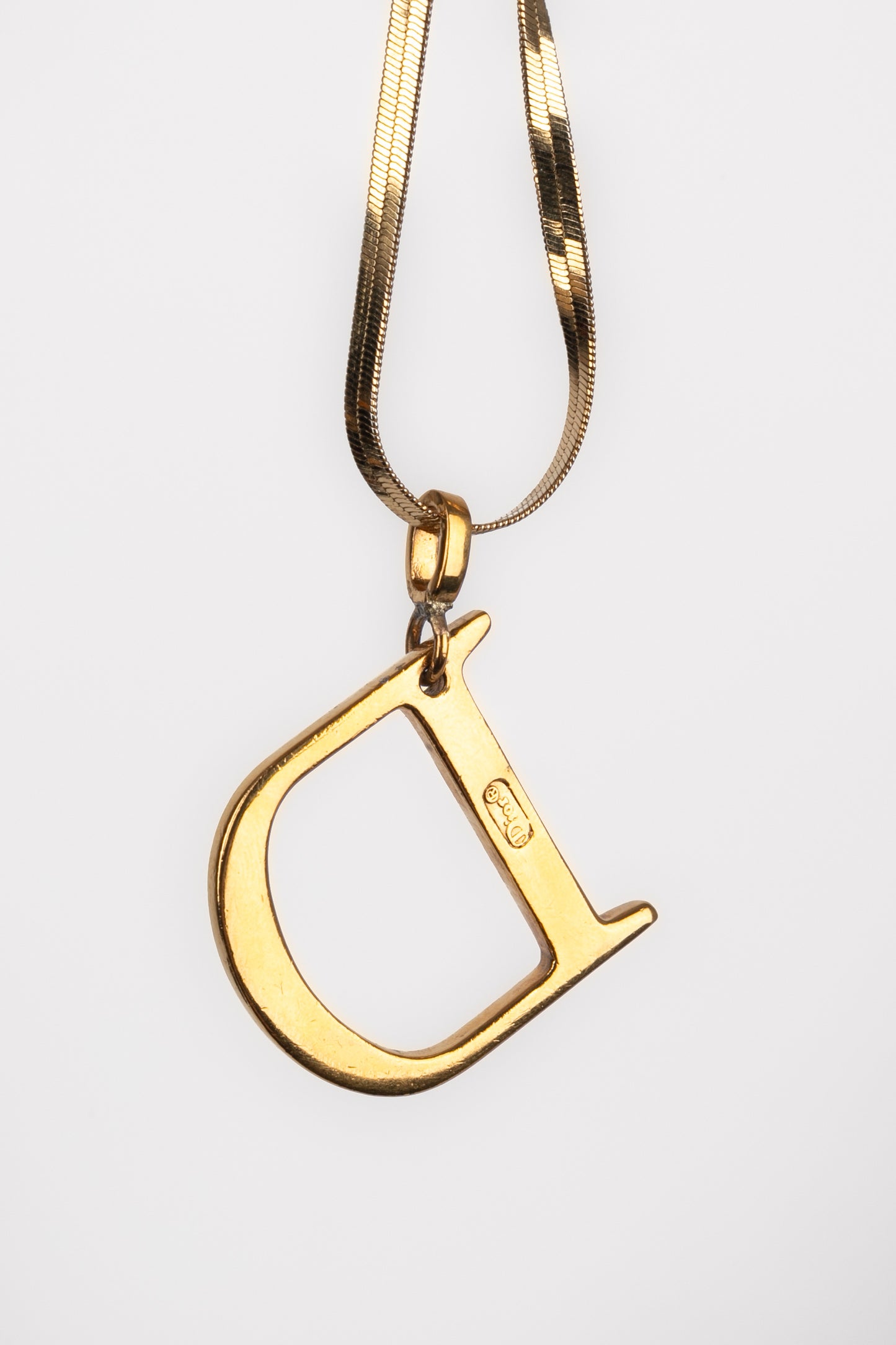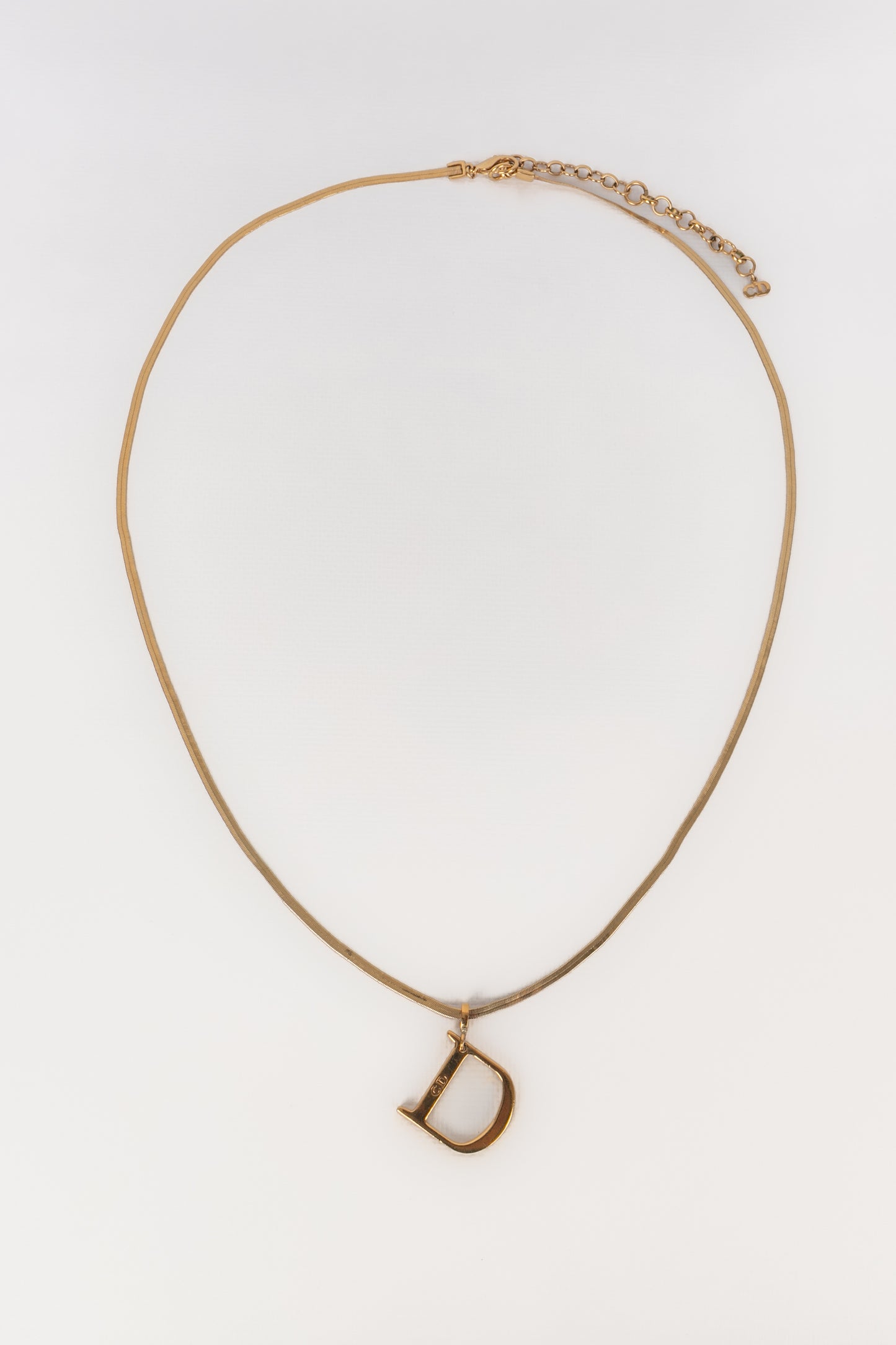 DIOR -Collier long en métal doré retenant un pendentif "D" en métal doré.