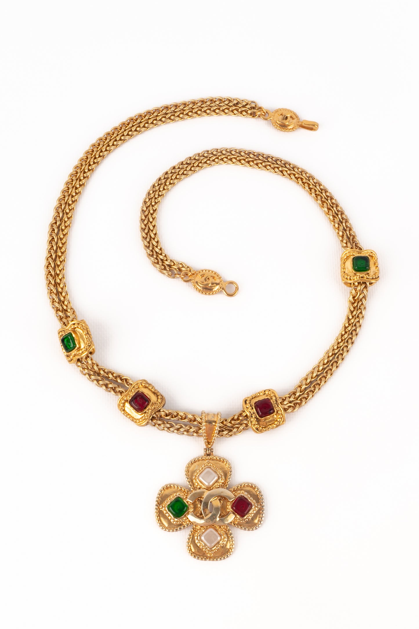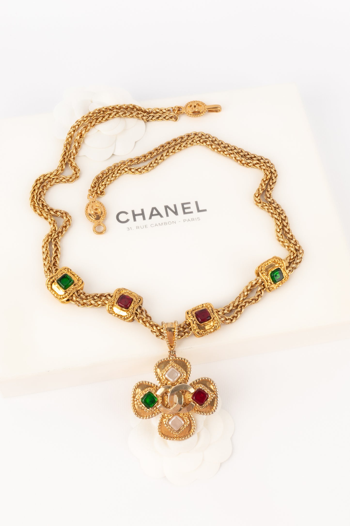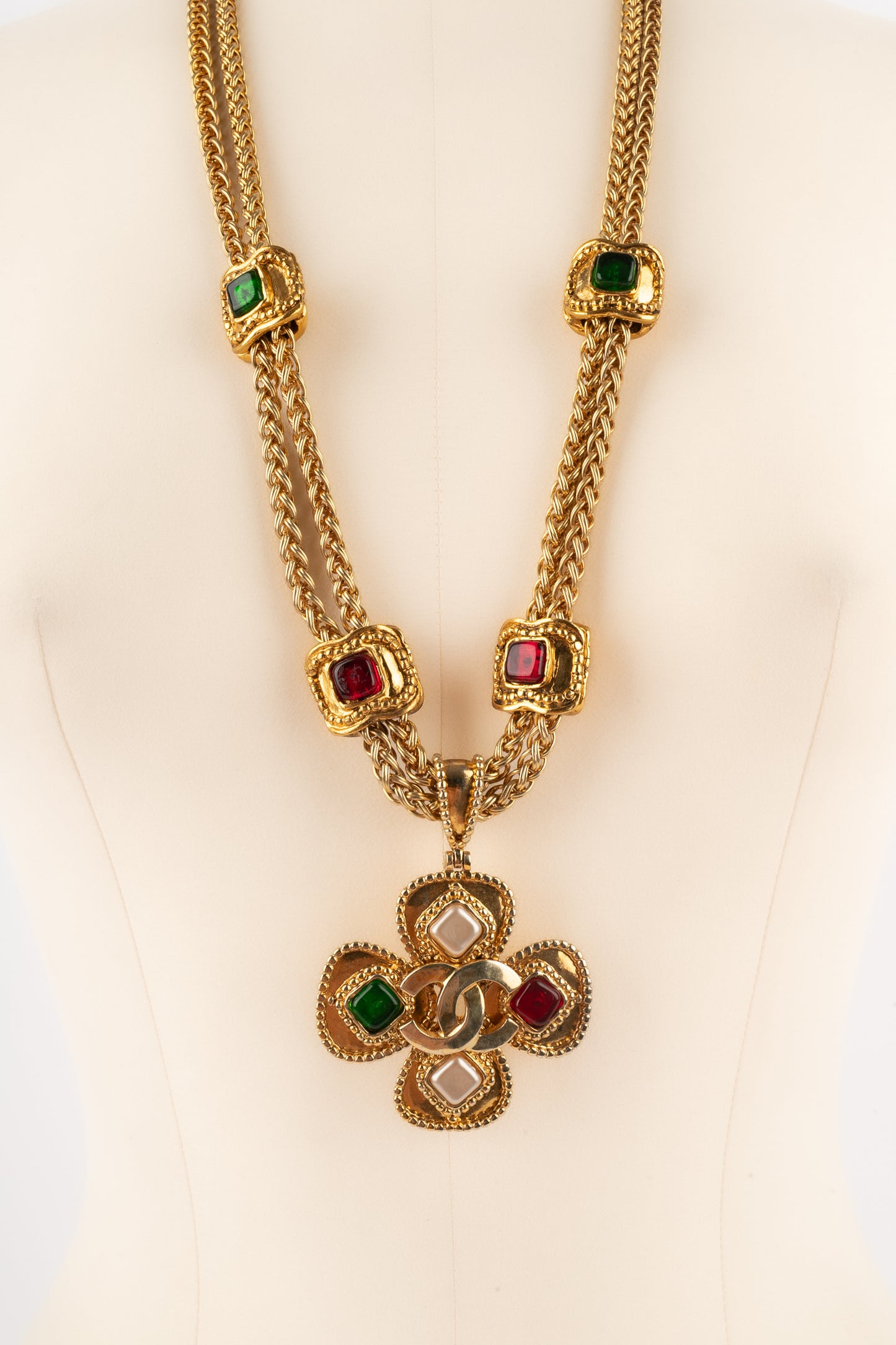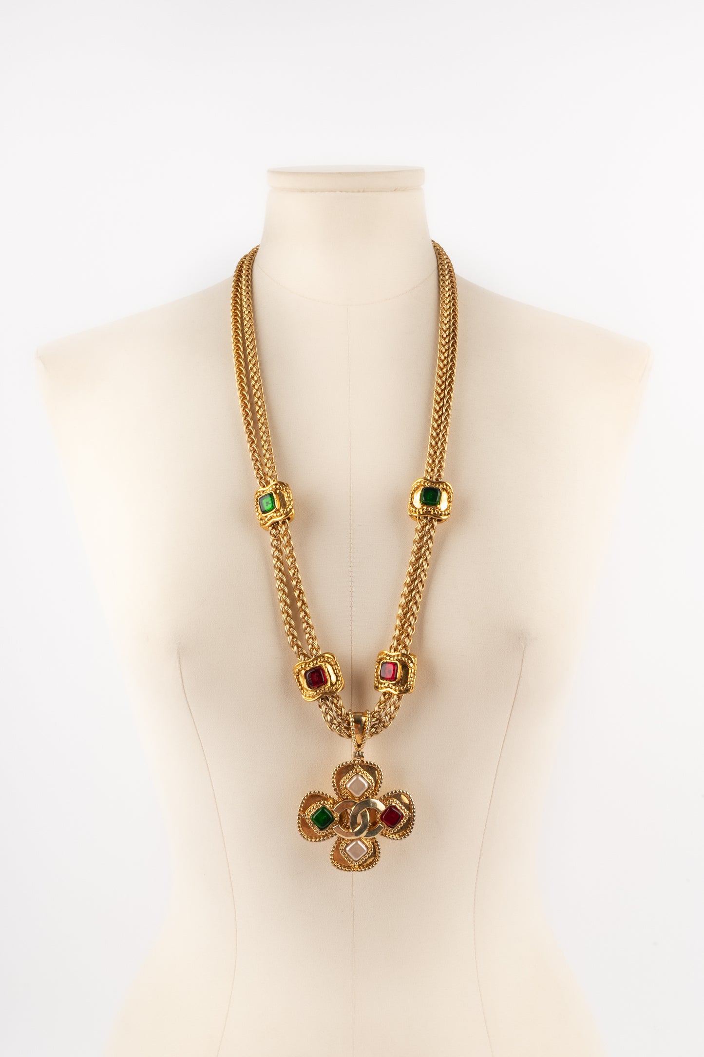 CHANEL -(Made in France) Collier doubles chaînes en métal doré, retenant un pendentif en métal doré et pâte de verre. Collection Printemps-Eté 1996 sous la direction de Karl Lagerfeld.