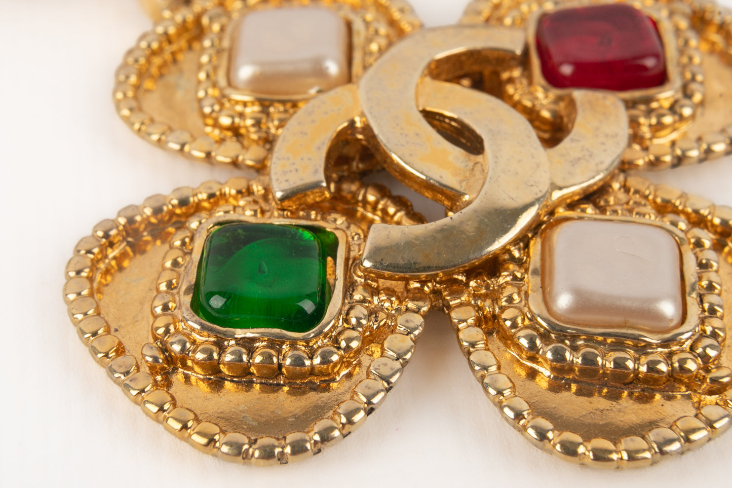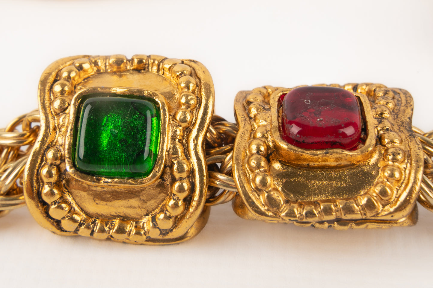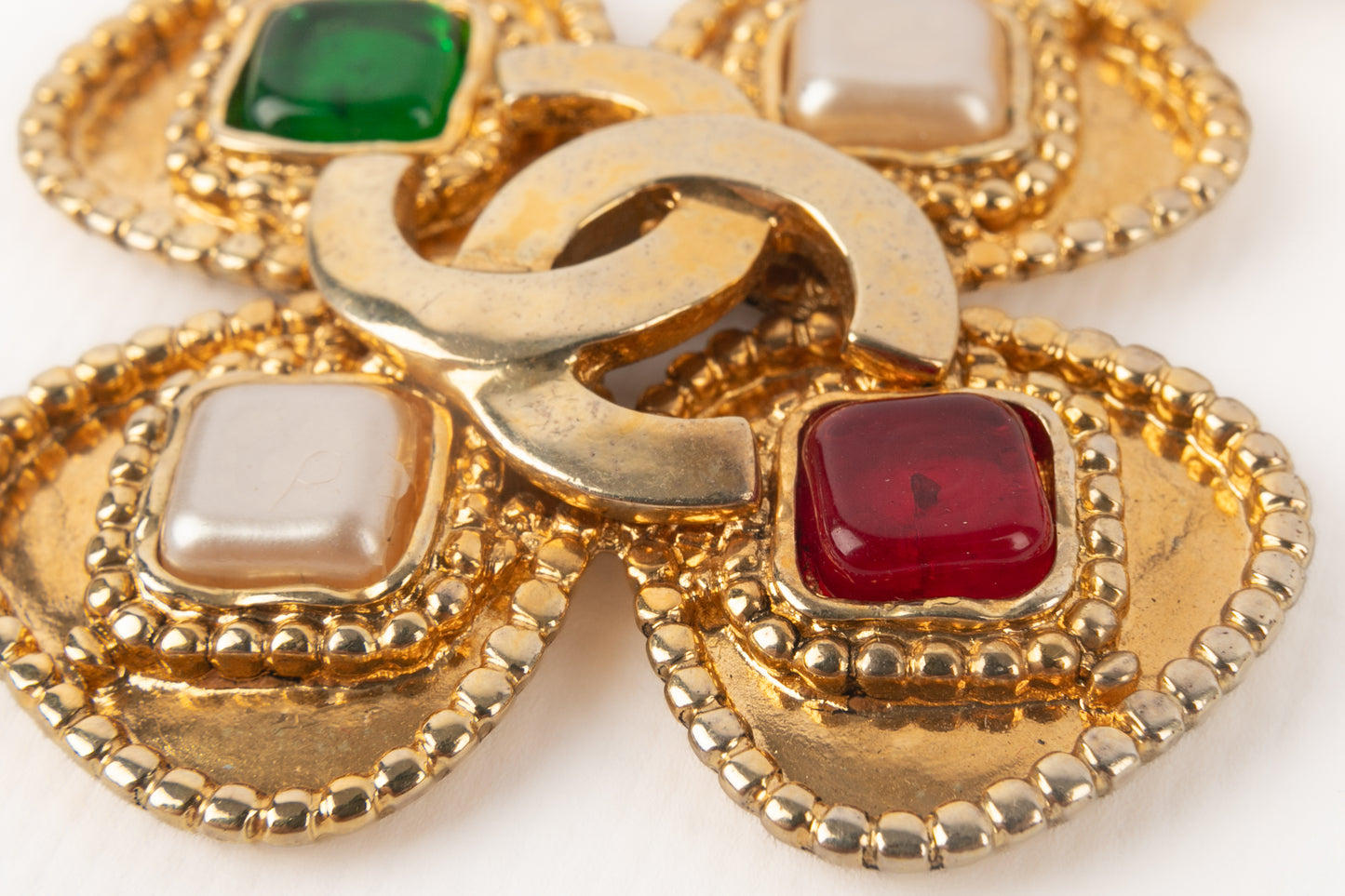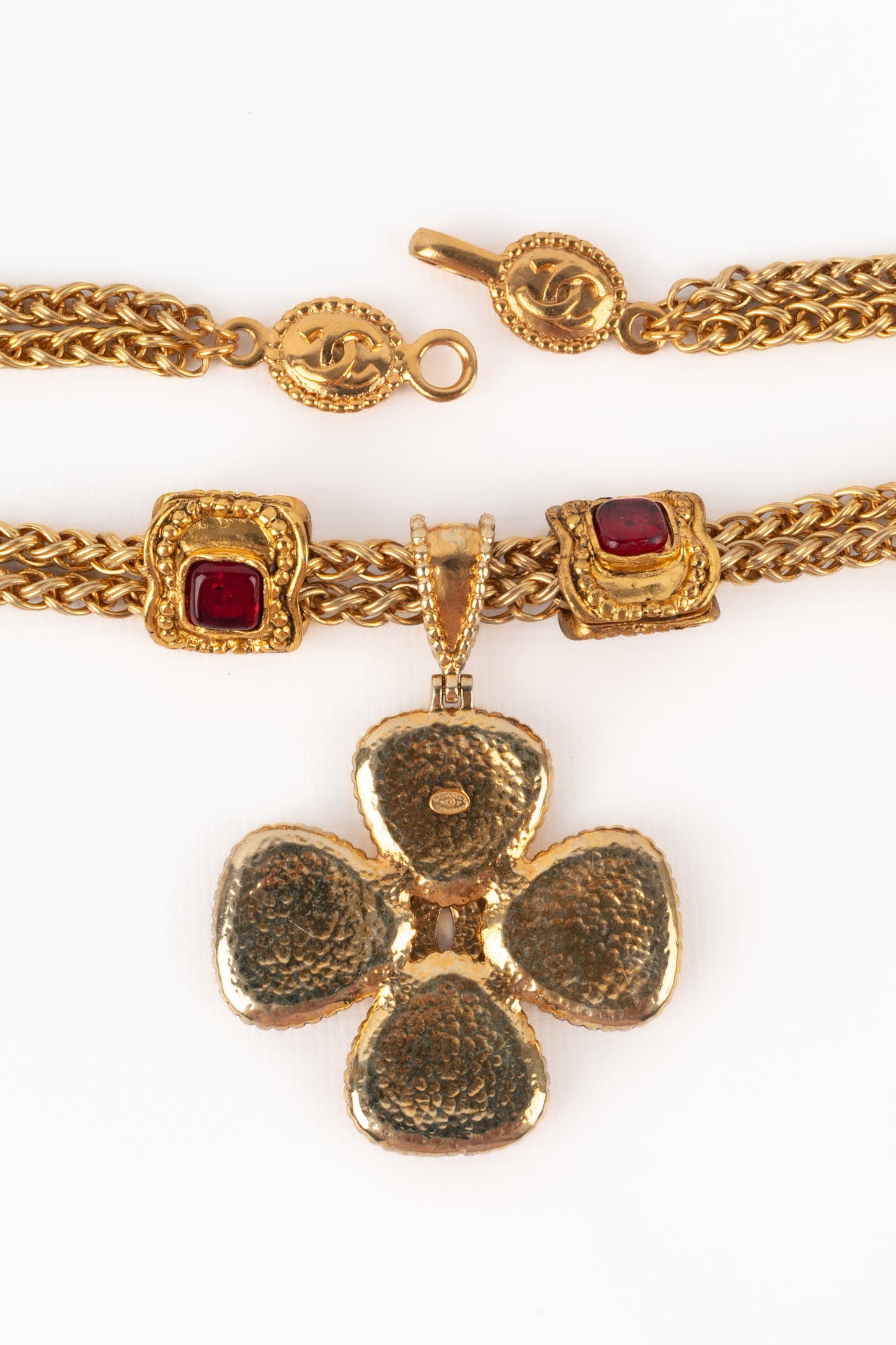 CHANEL -(Made in France) Collier doubles chaînes en métal doré, retenant un pendentif en métal doré et pâte de verre. Collection Printemps-Eté 1996 sous la direction de Karl Lagerfeld.