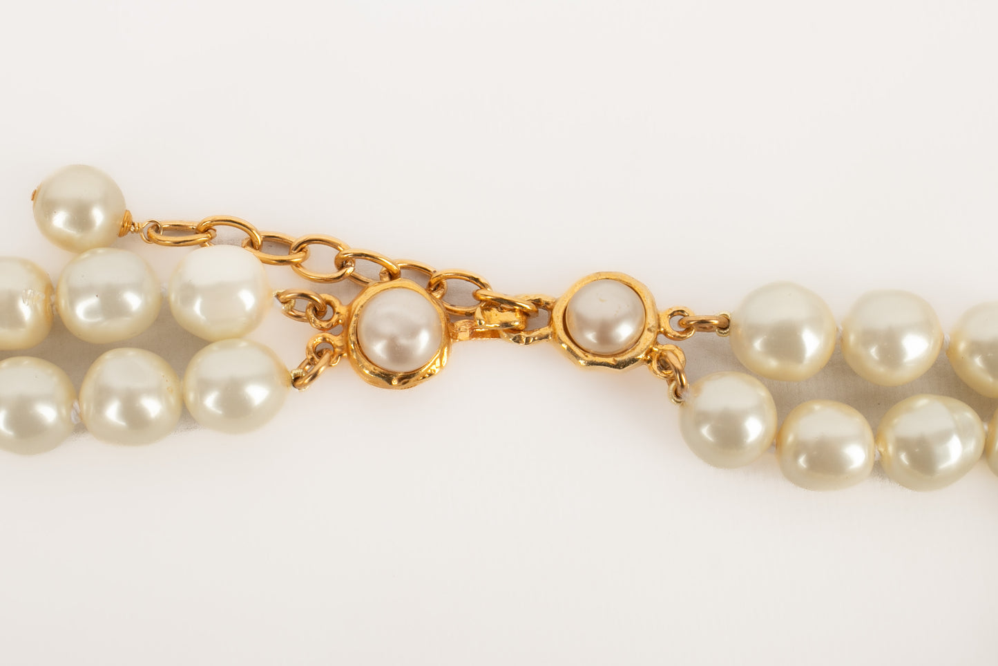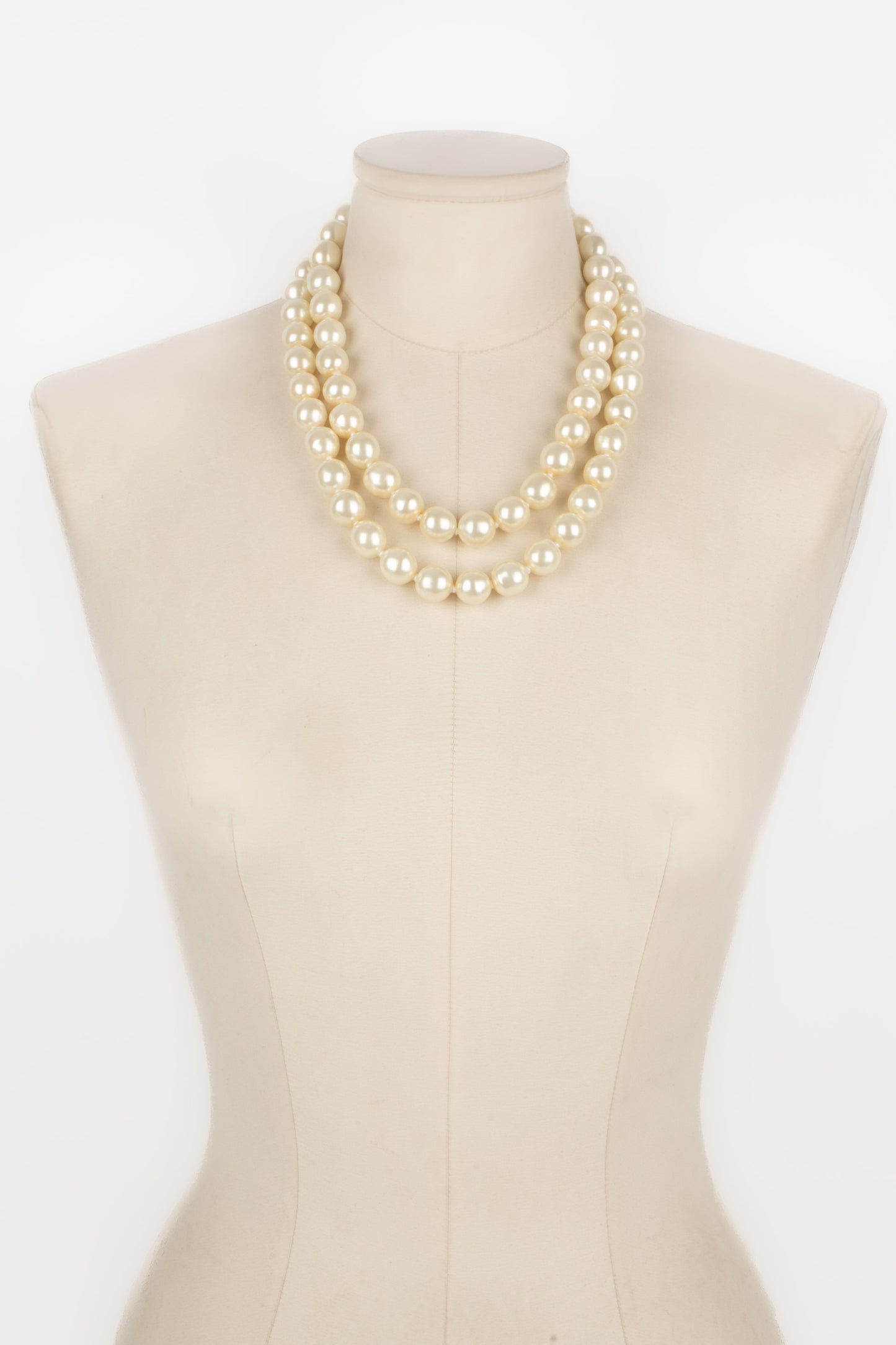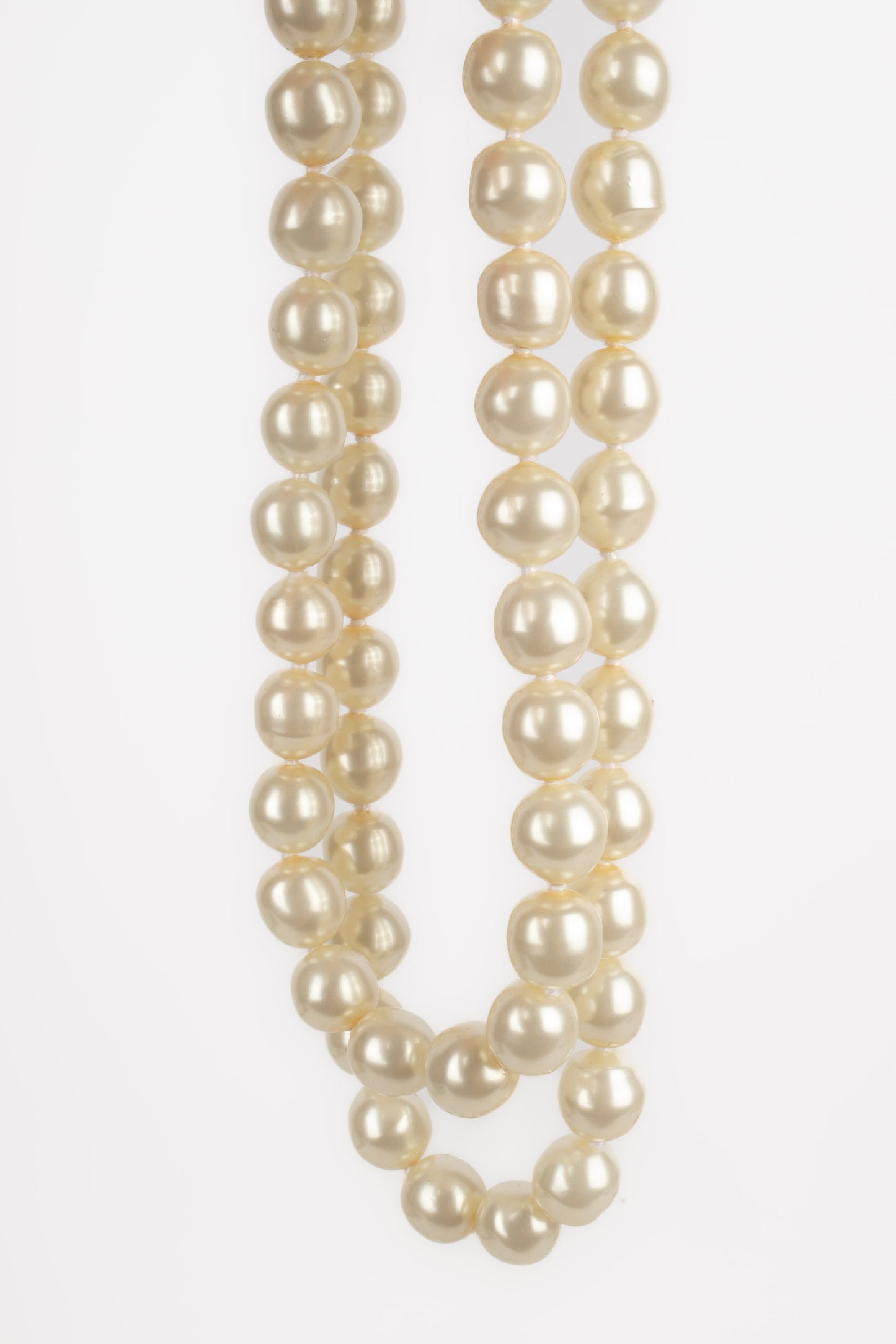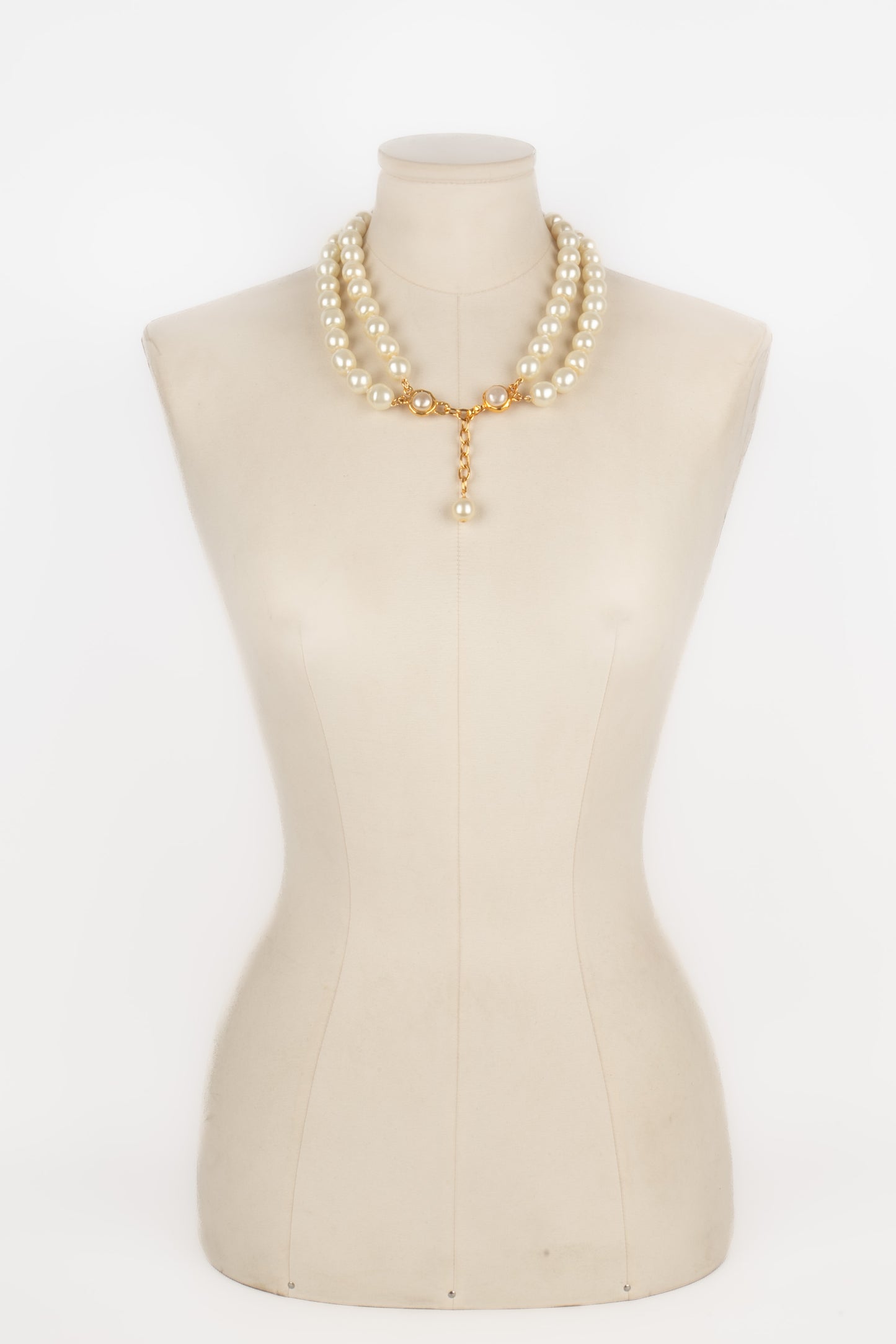 CHANEL -(Made in France) Collier deux rangs de perles nacrées fantaisies montées à noeuds. Fermoir en métal doré. Bijou datant des années 1990.
