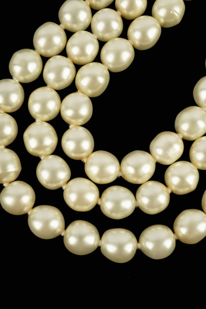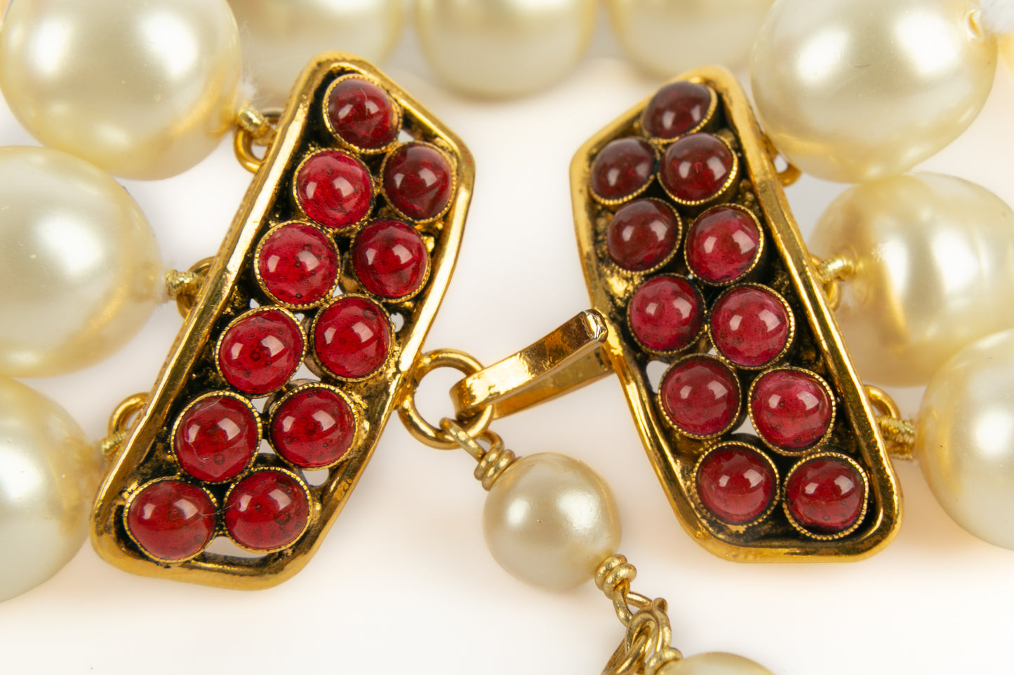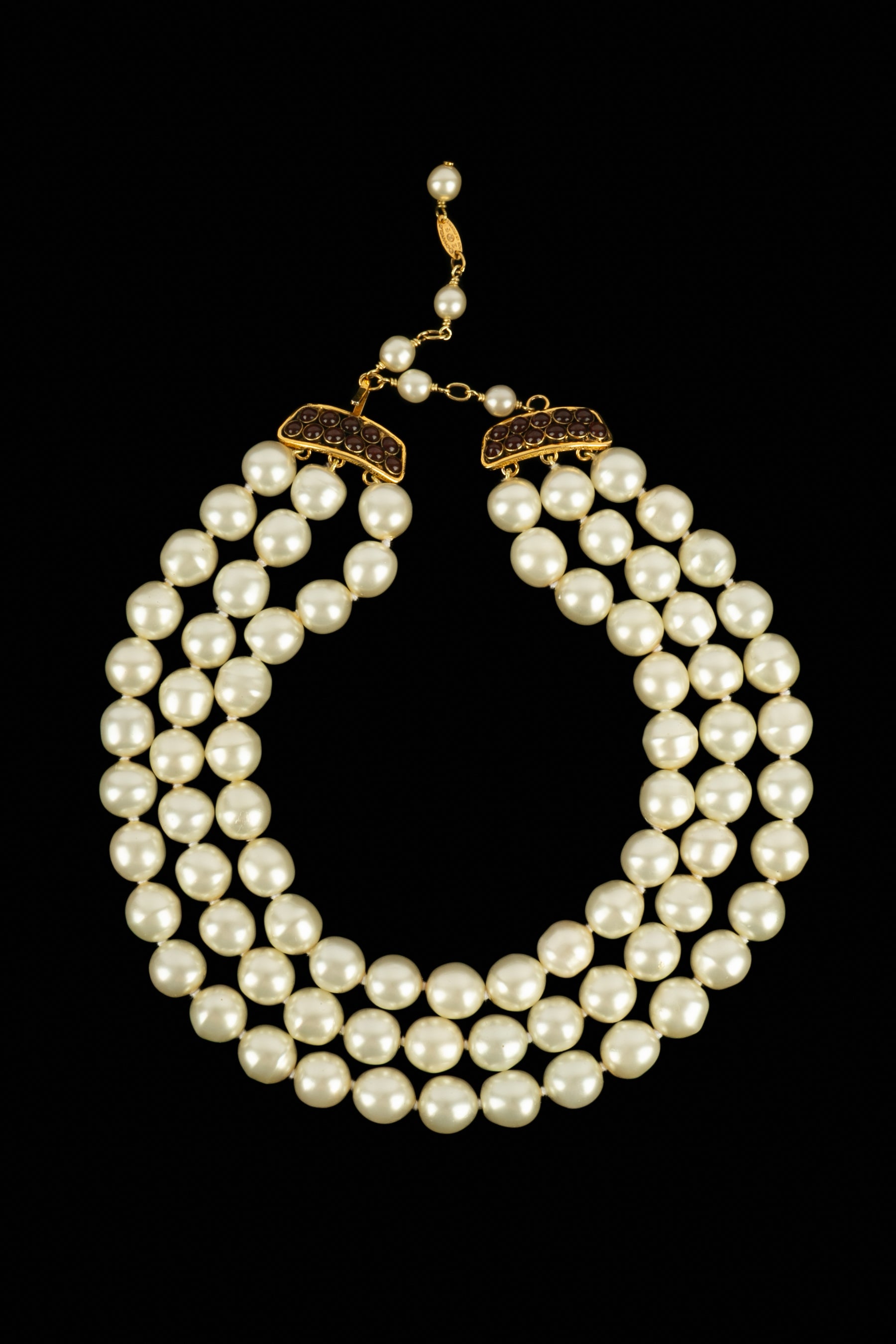 CHANEL - (Made in France) Collier composé de trois rangs de perles nacrées fantaisies et fermoir bijou en métal doré et pâte de verre rose. Collection 2cc5 sous la direction artistique de Karl Lagerfeld.