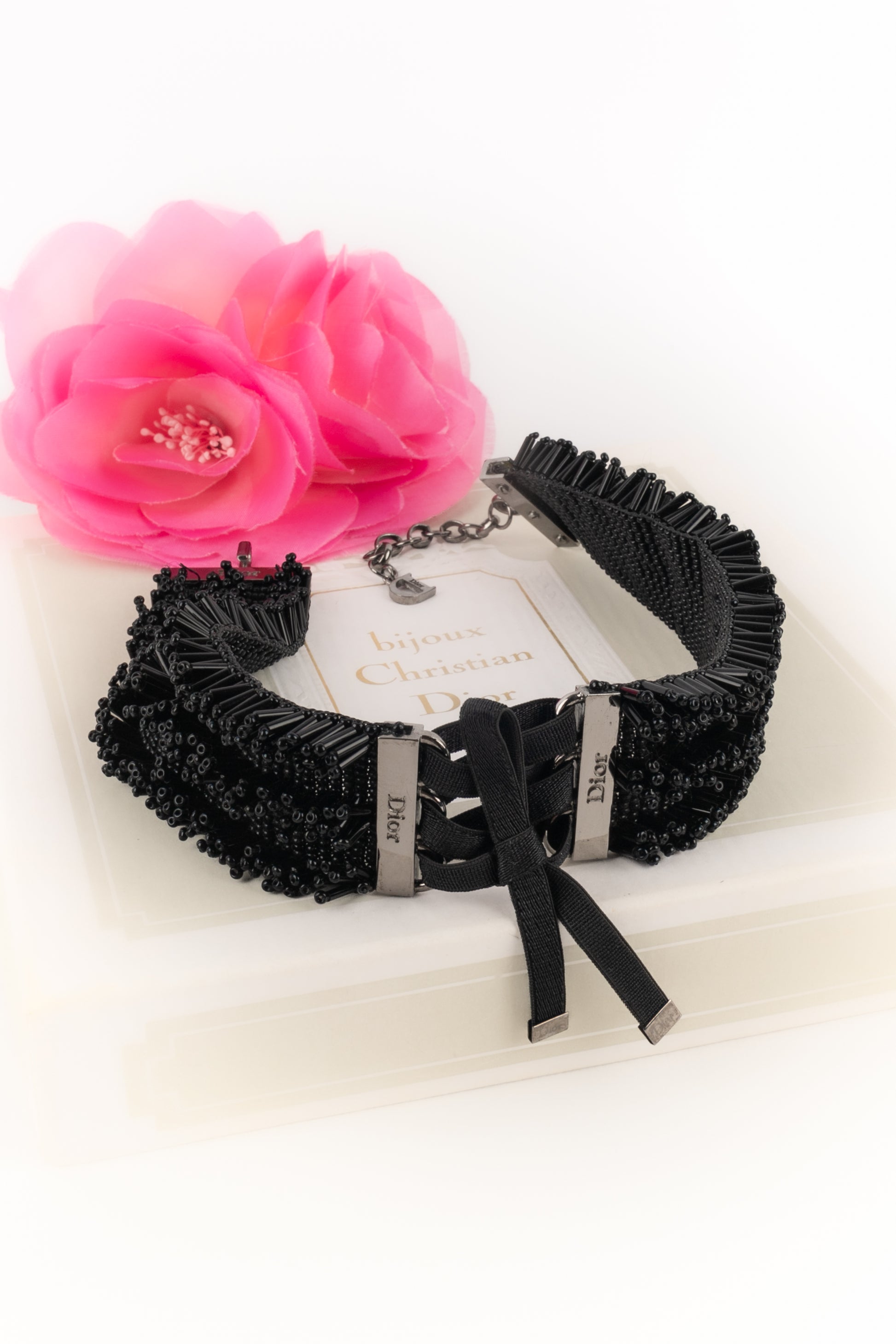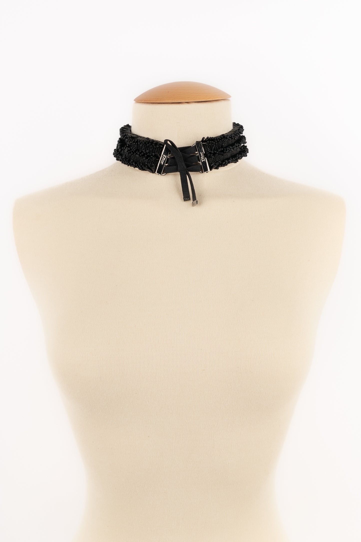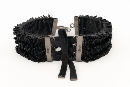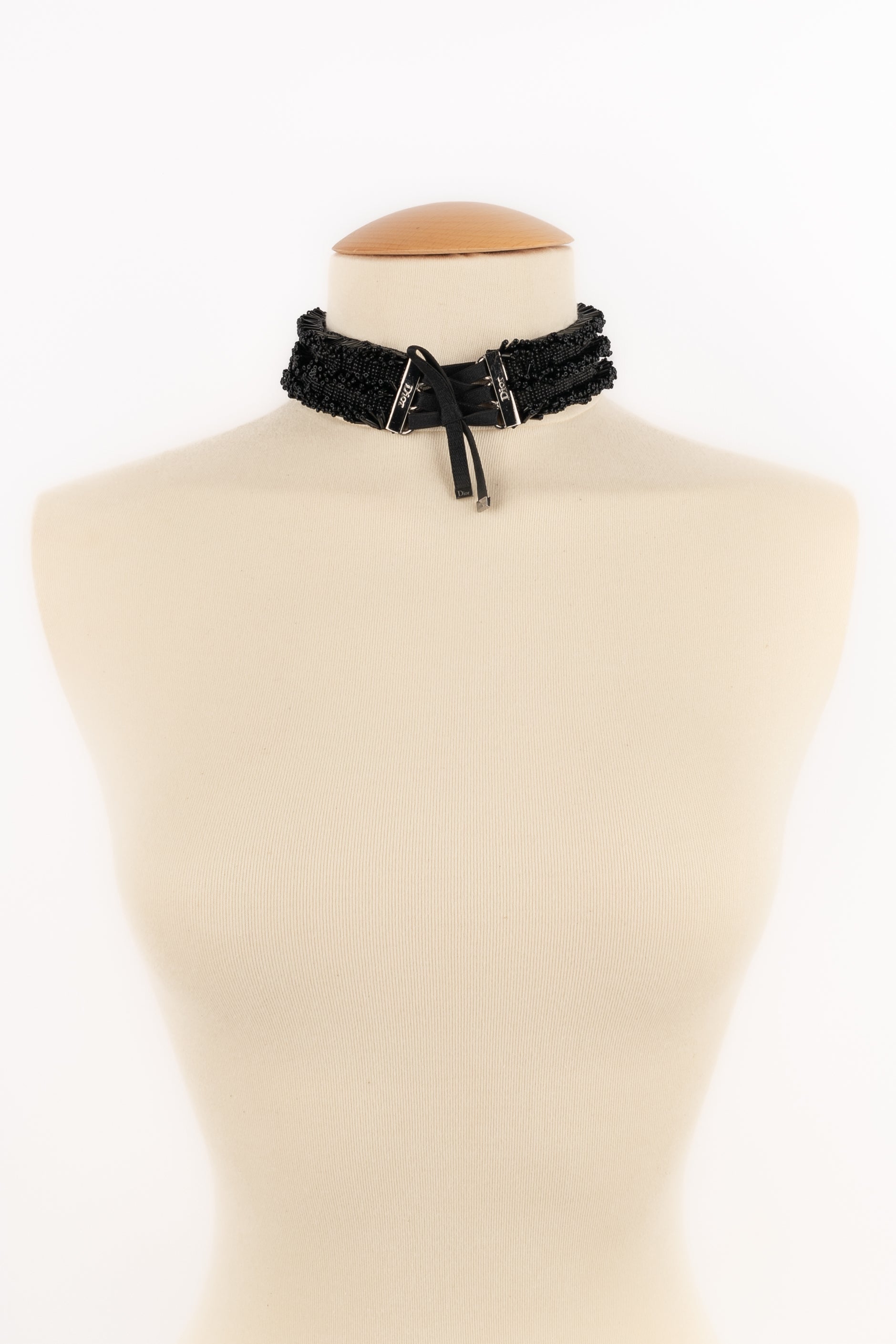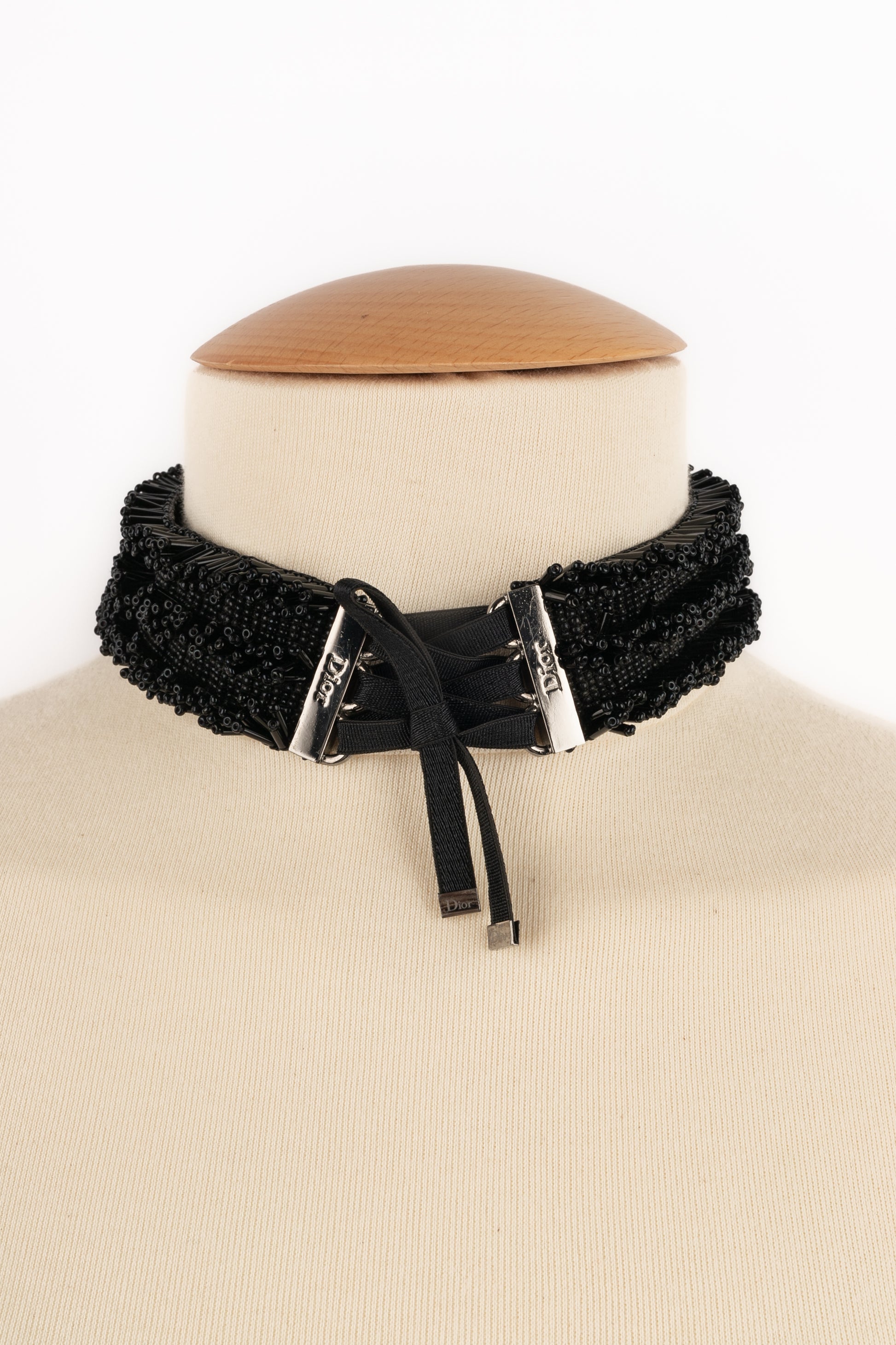 DIOR -(Made in France) Collier ras de cou en perles noires et métal argenté.