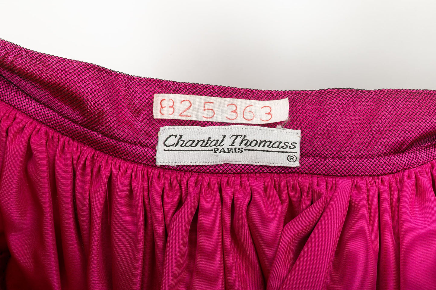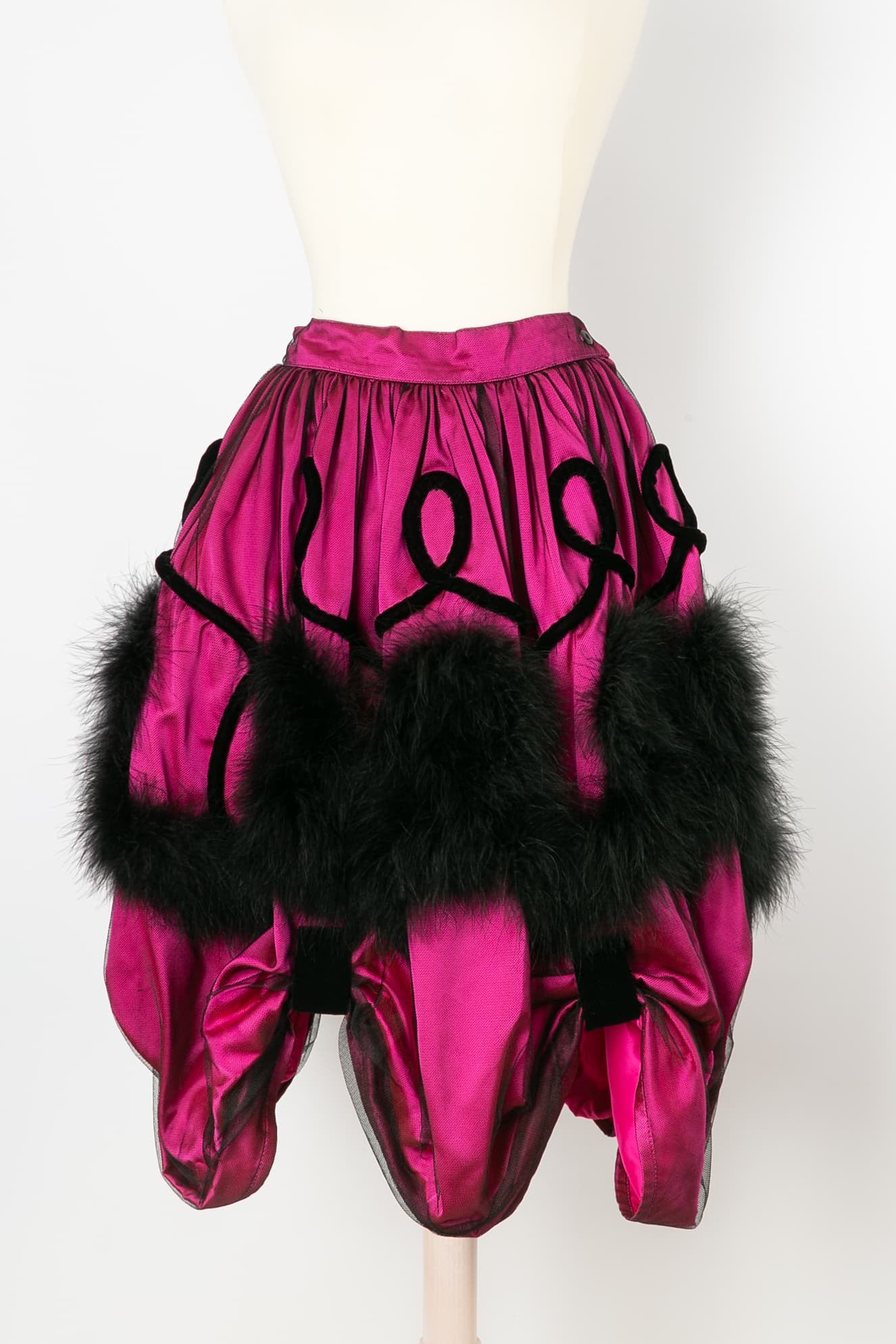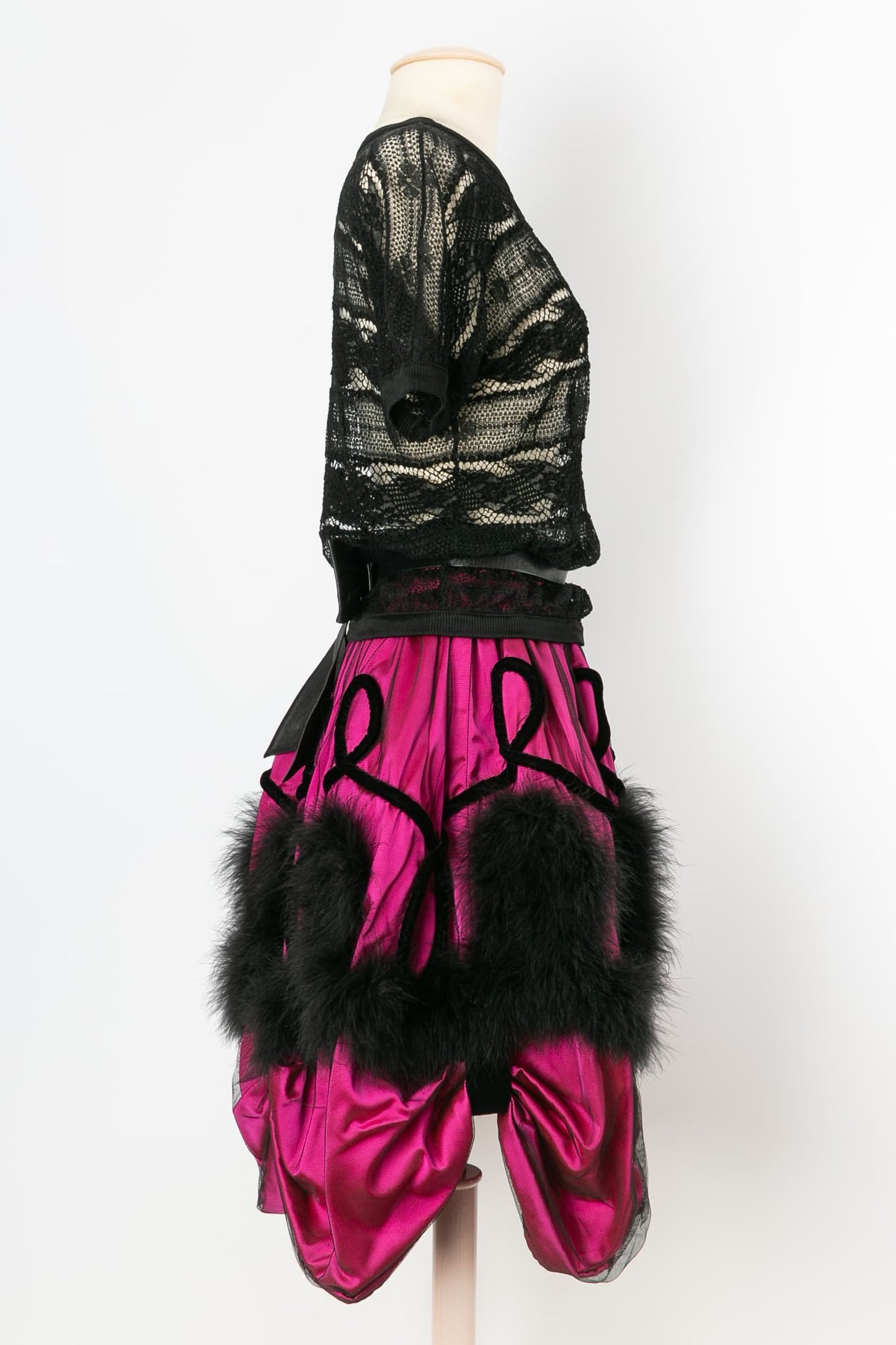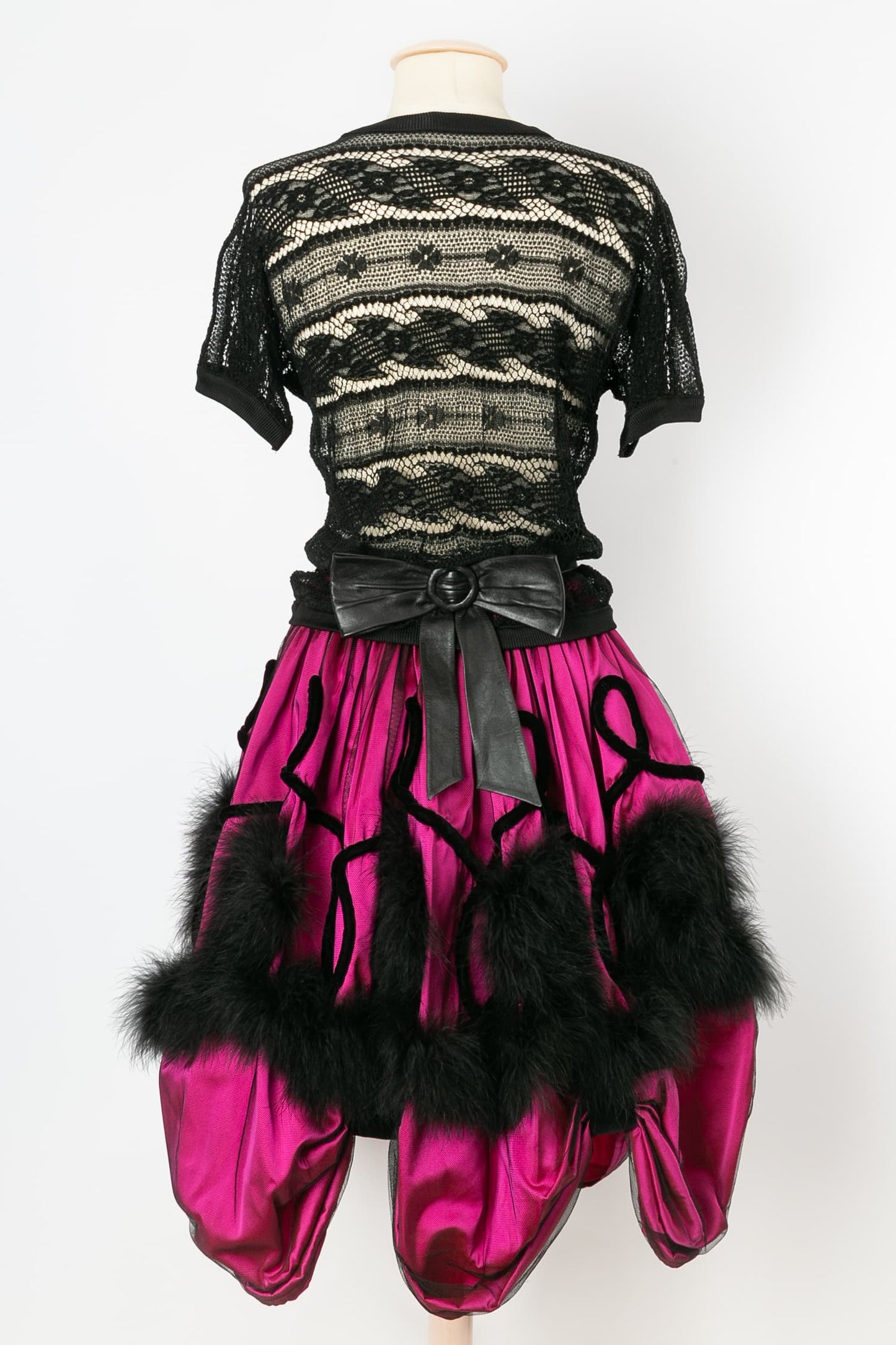 CHANTAL THOMASS -Jupon en taffetas fuchsia orné de marabout et de dentelle noire. Le top est en dentelle stretch noire et la ceinture est en cuir. Collection Automne/Hiver 1988. Numéro bolduc : Jupon : 825363 - Top : 376