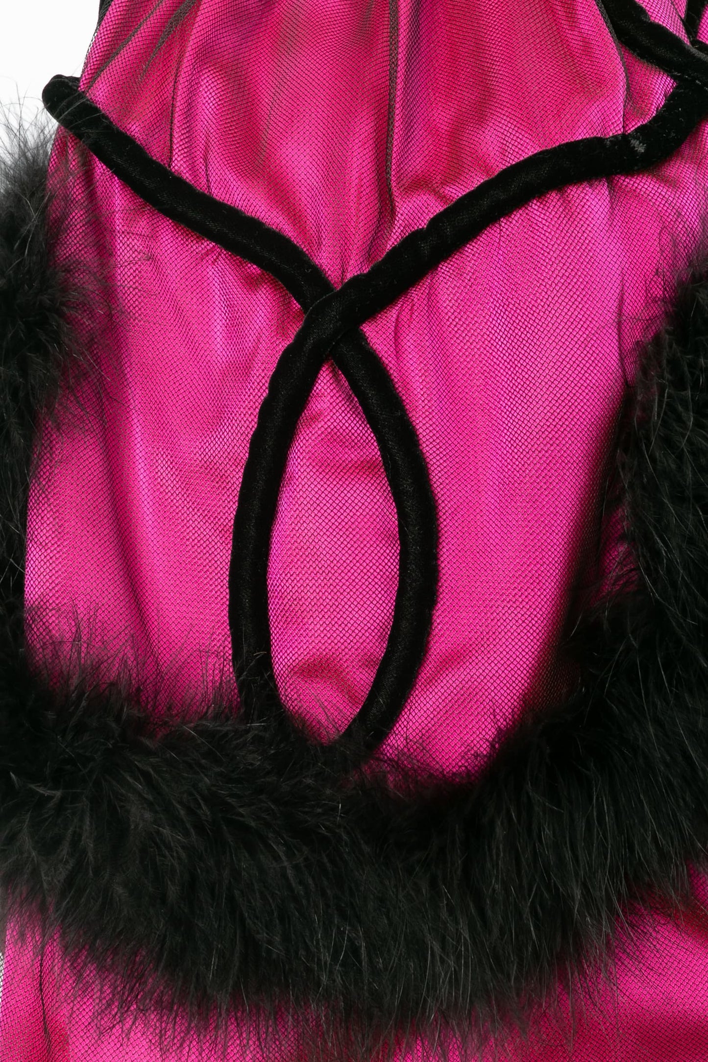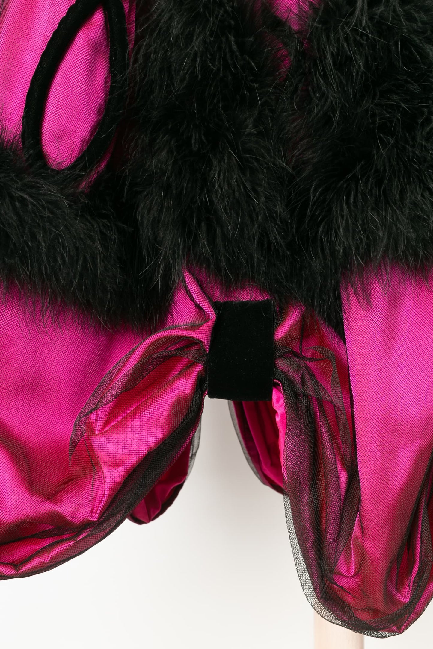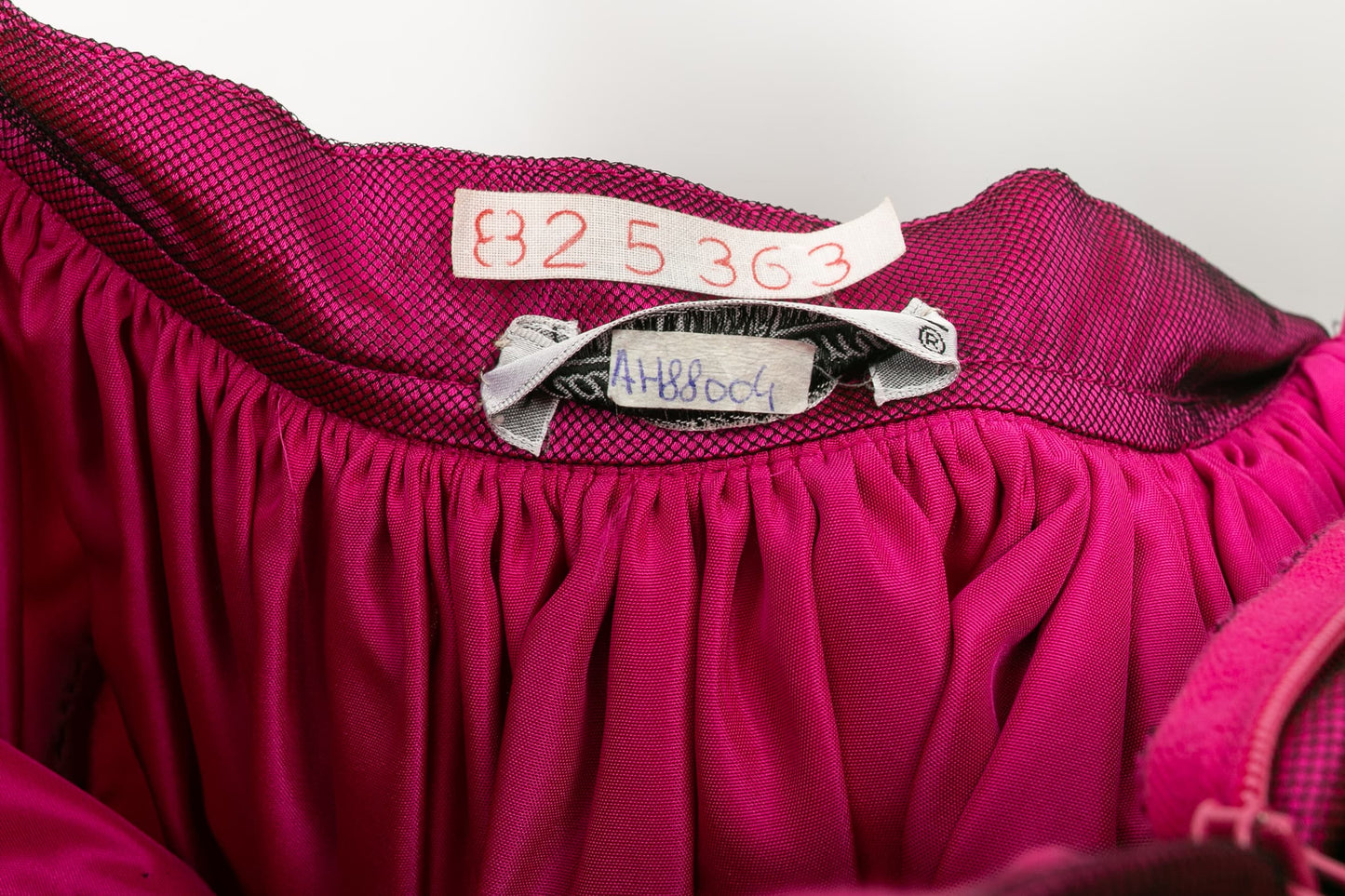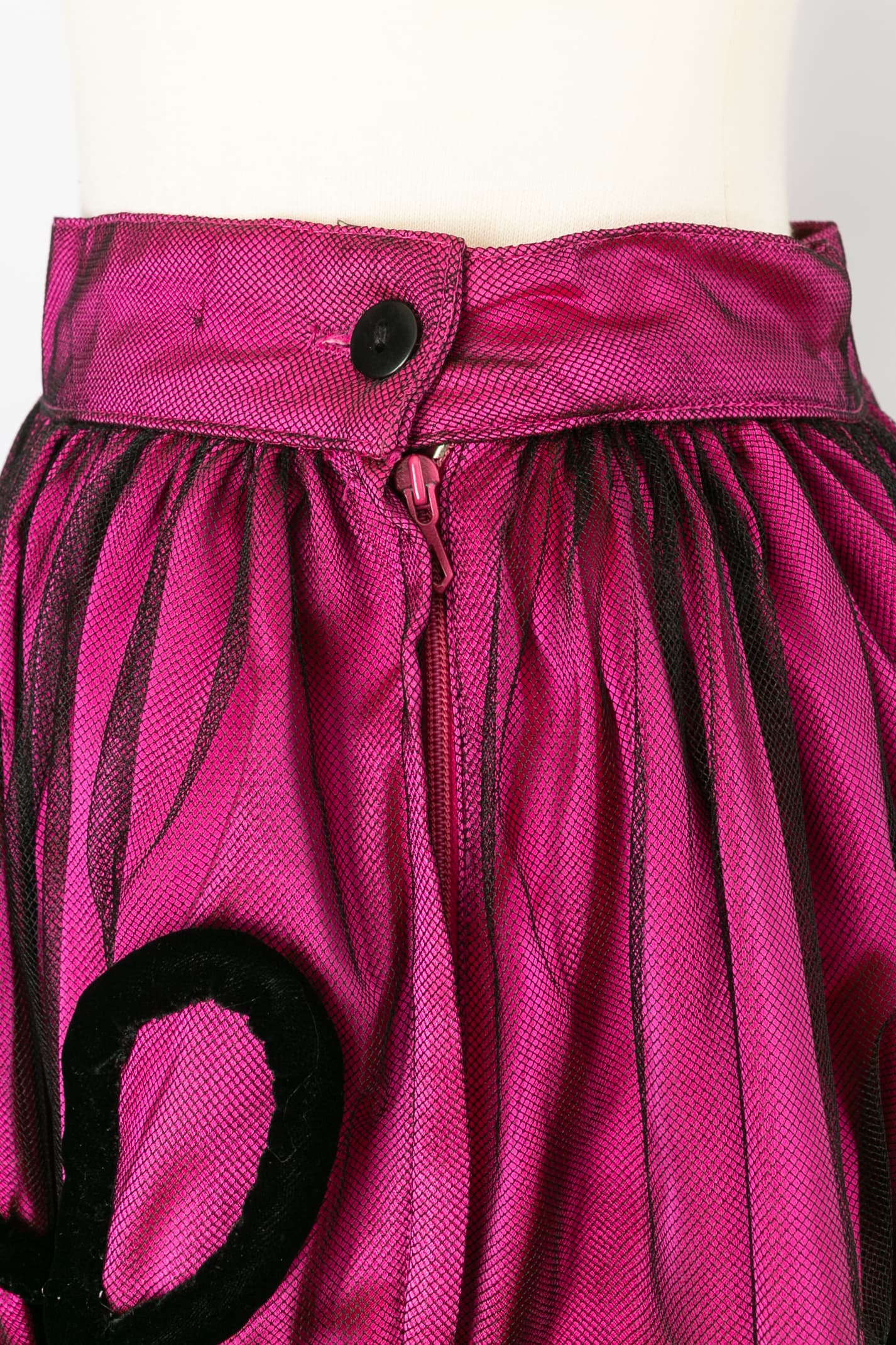 CHANTAL THOMASS -Jupon en taffetas fuchsia orné de marabout et de dentelle noire. Le top est en dentelle stretch noire et la ceinture est en cuir. Collection Automne/Hiver 1988. Numéro bolduc : Jupon : 825363 - Top : 376