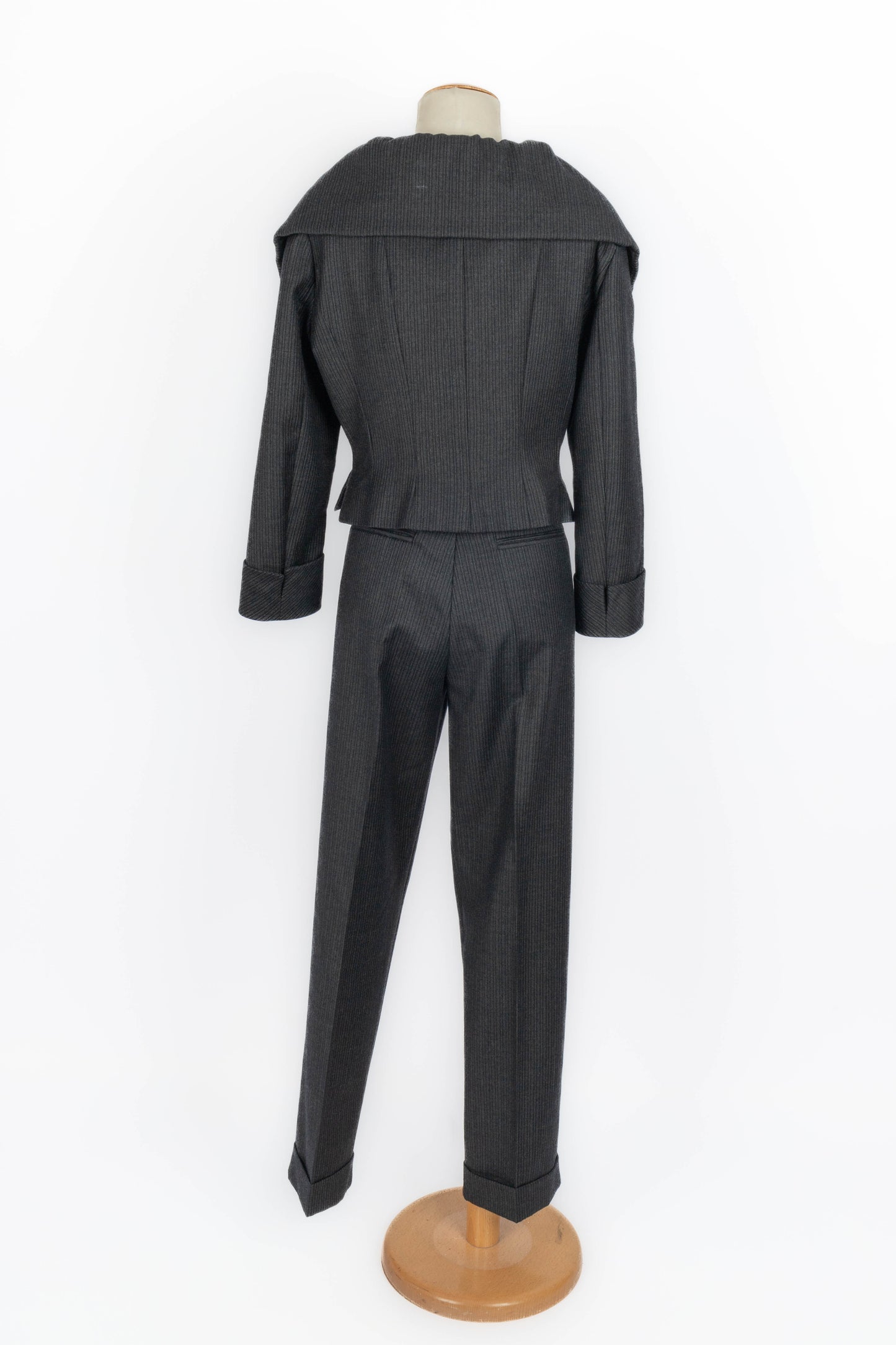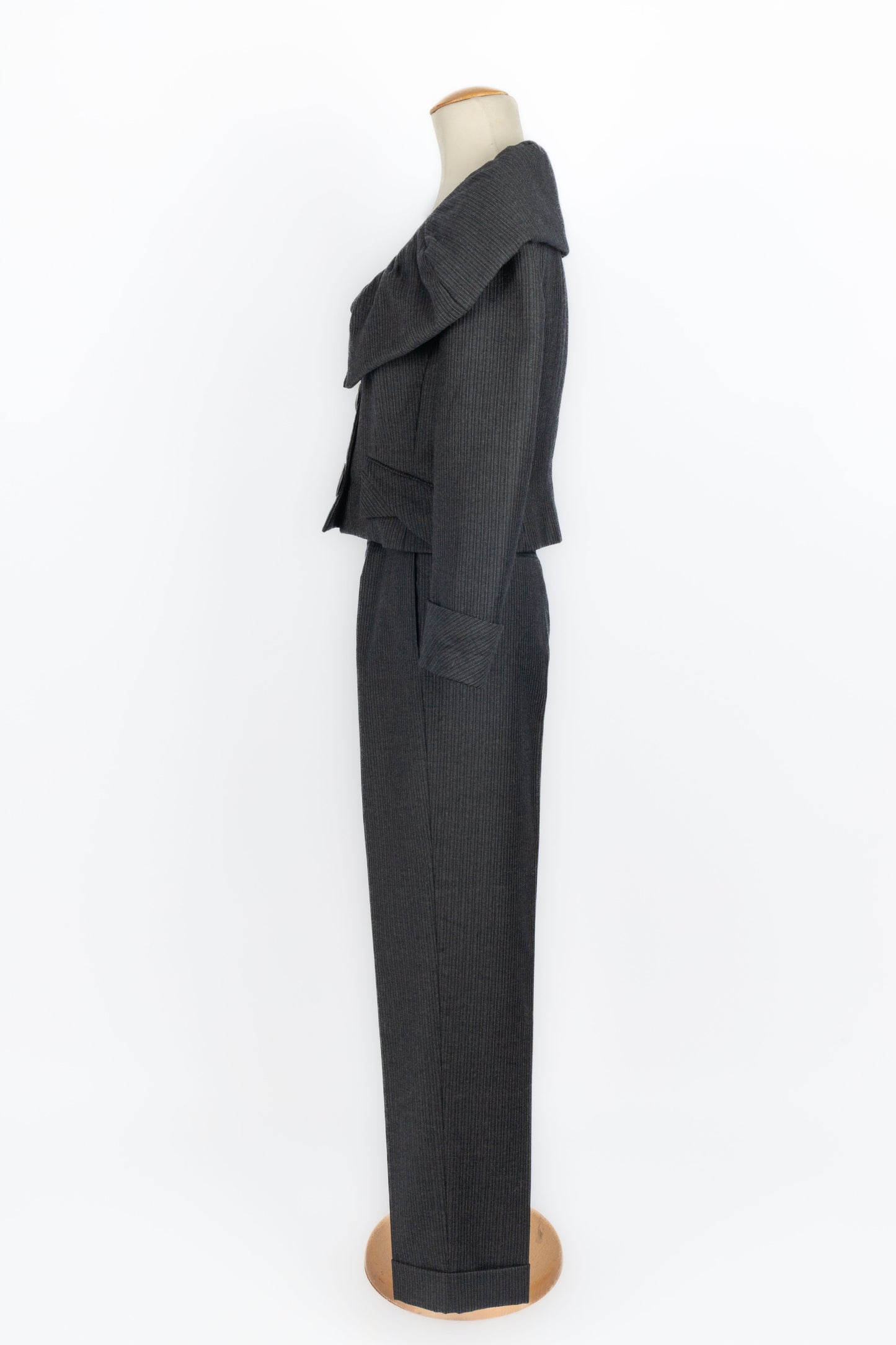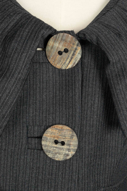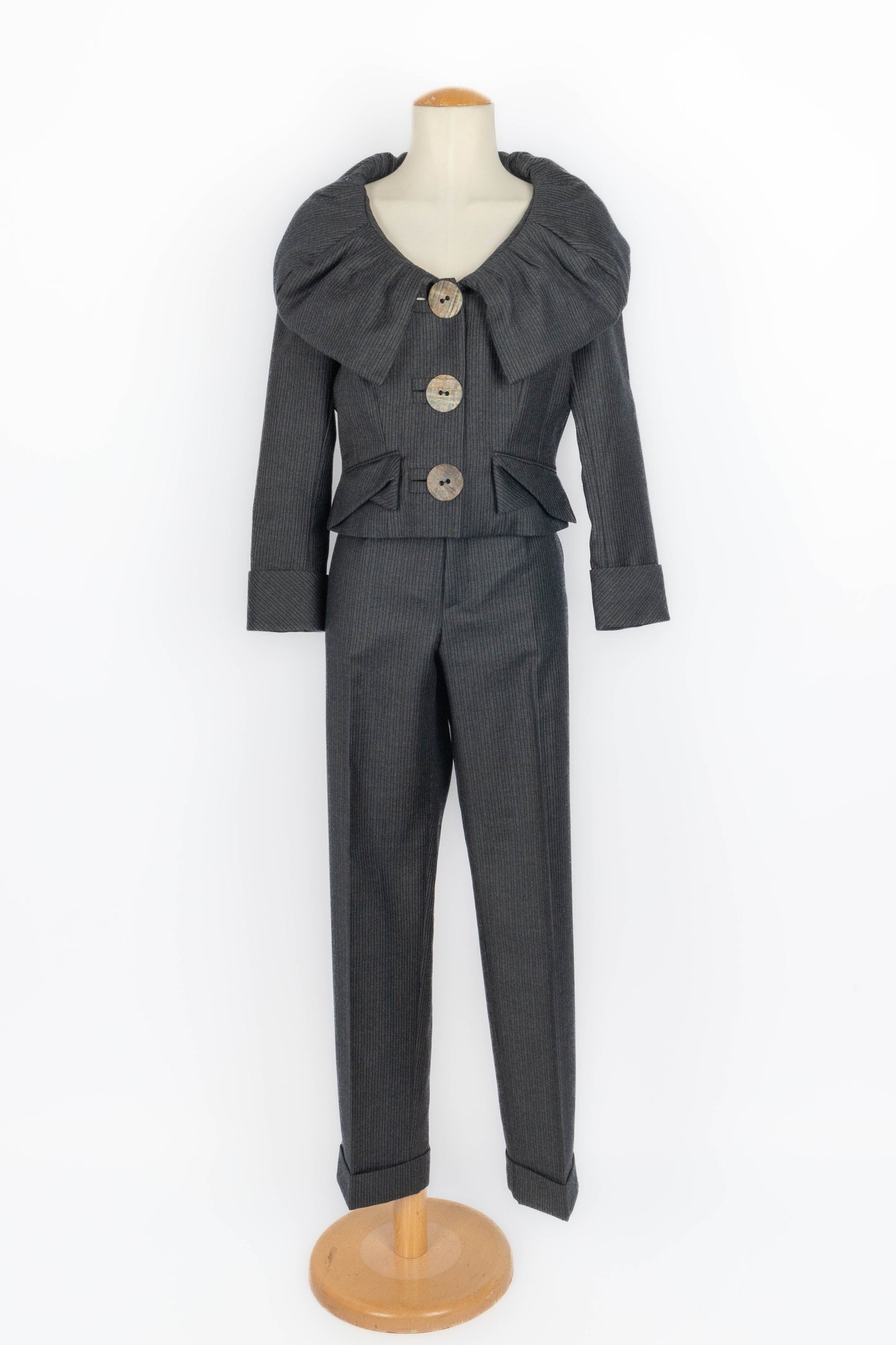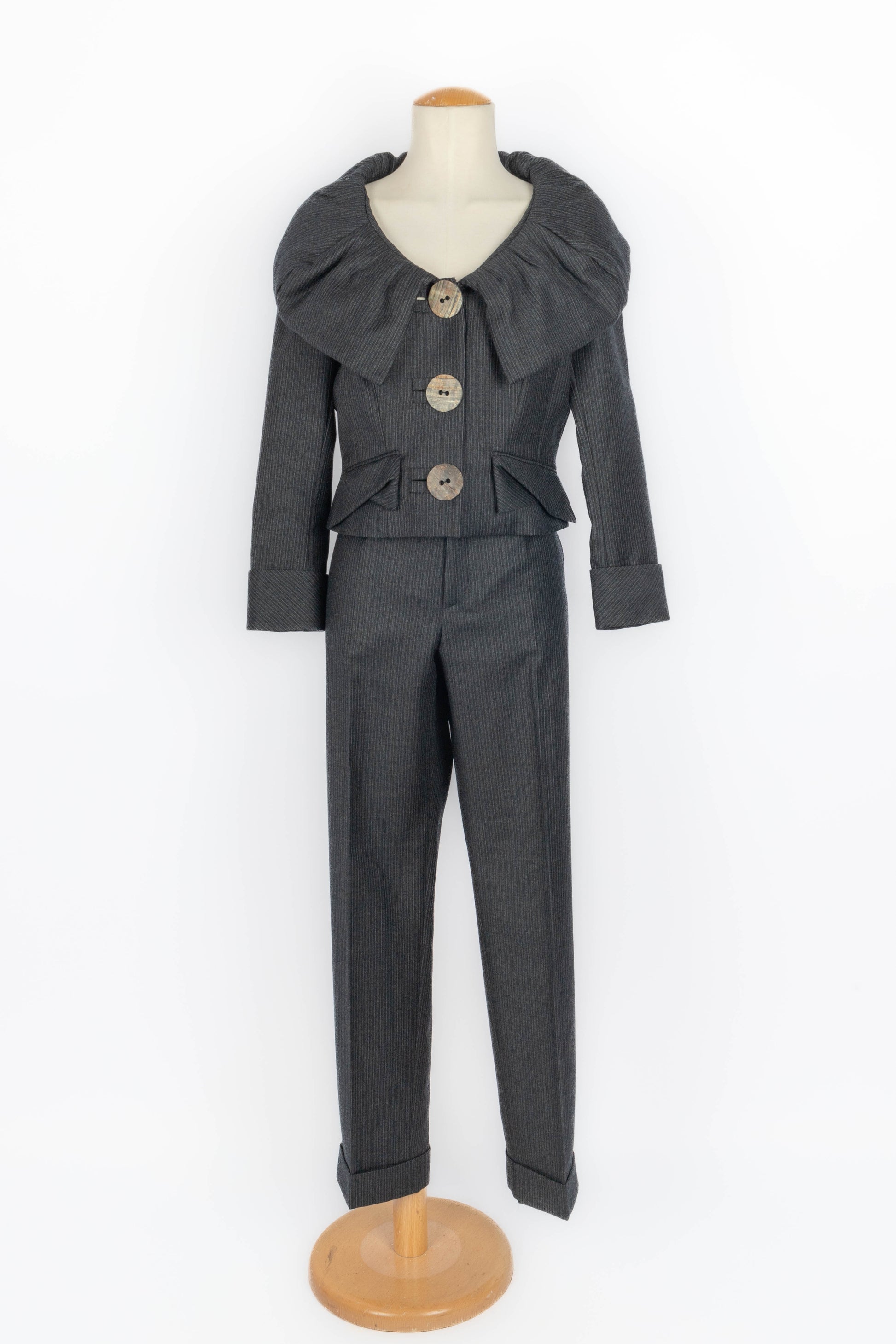 GALLIANO - (Made in France) Ensemble veste et pantalon en laine à rayures. Imposants boutons en bois. Taille indiquée 42FR.