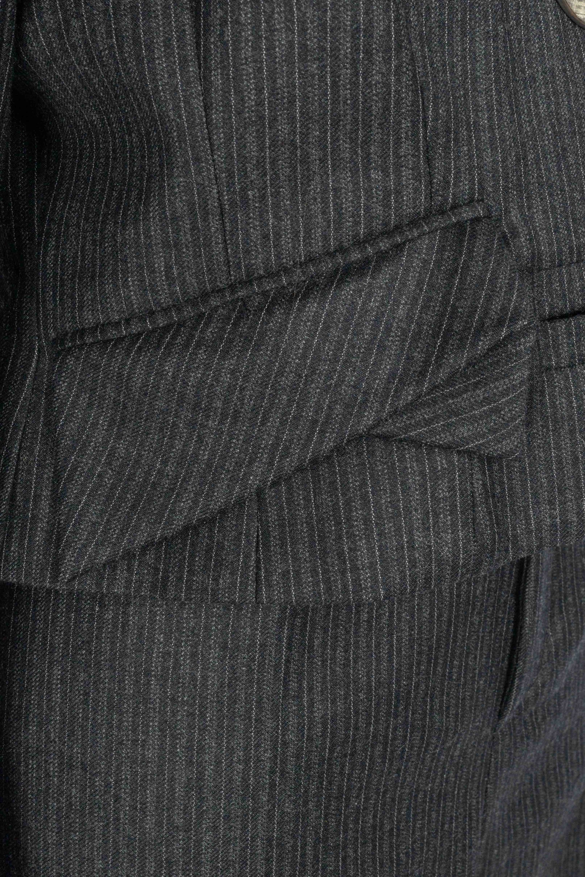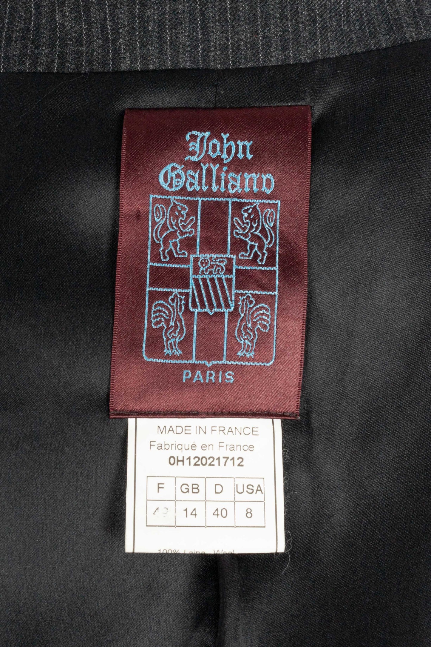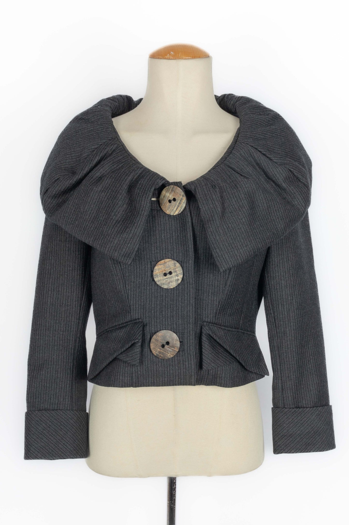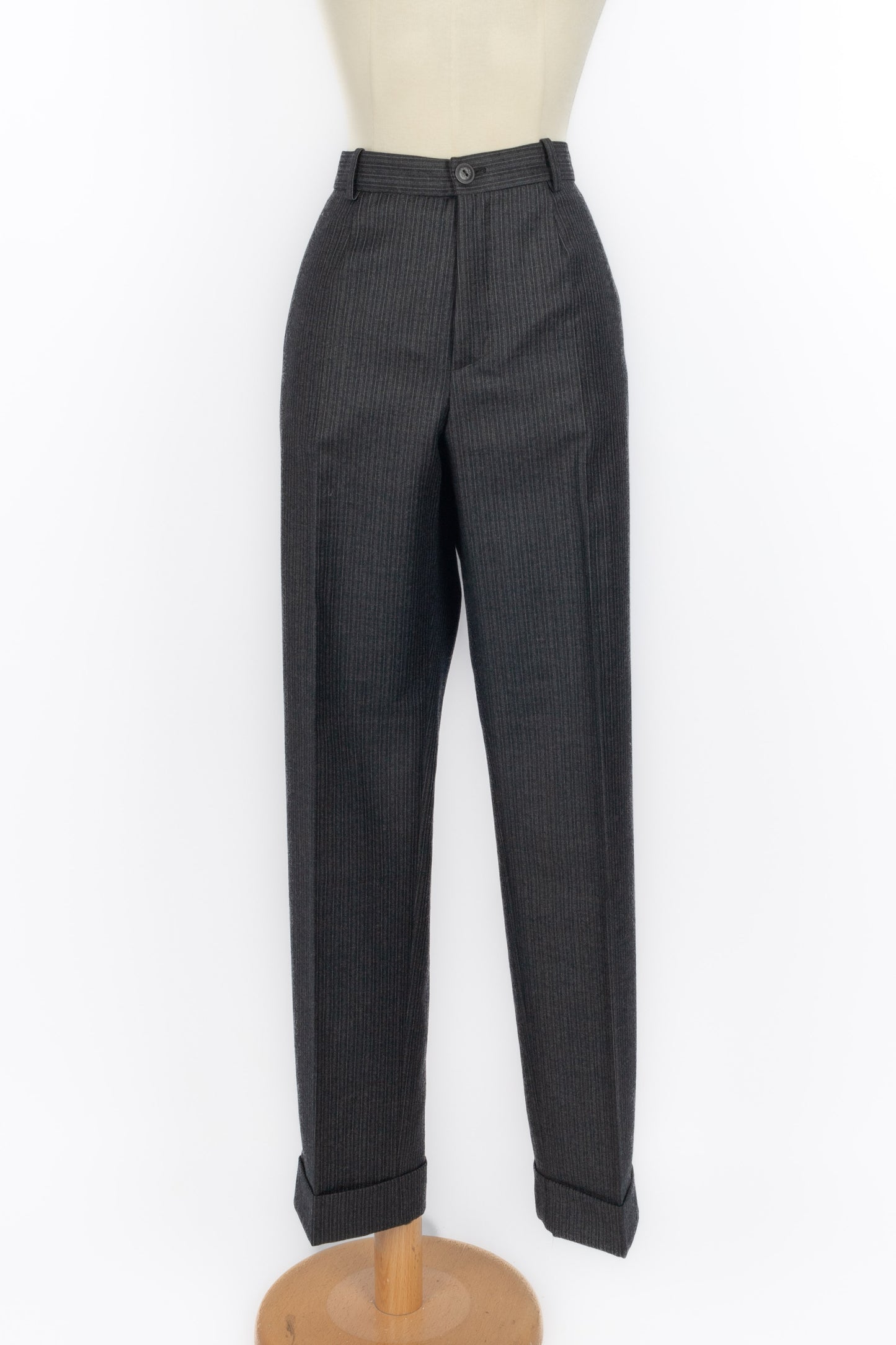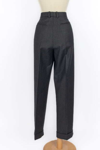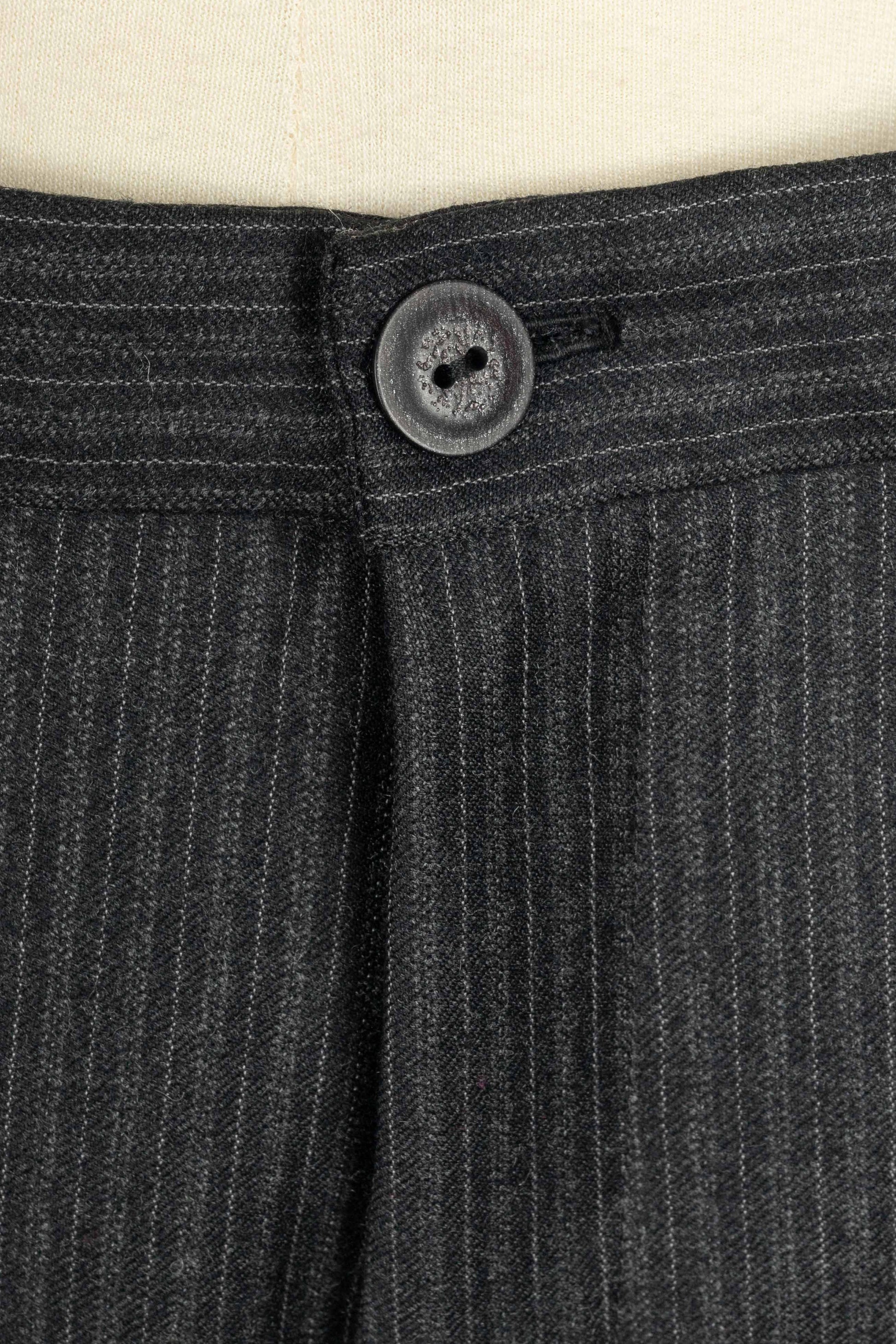 GALLIANO - (Made in France) Ensemble veste et pantalon en laine à rayures. Imposants boutons en bois. Taille indiquée 42FR.