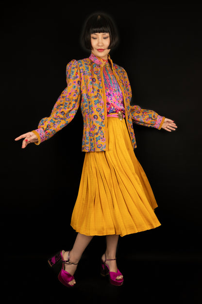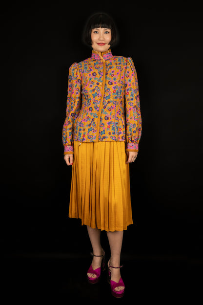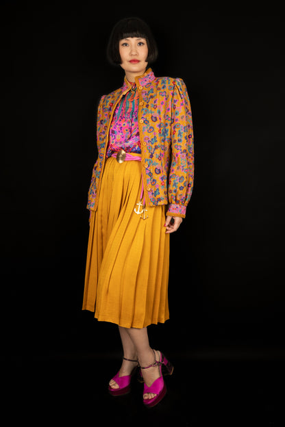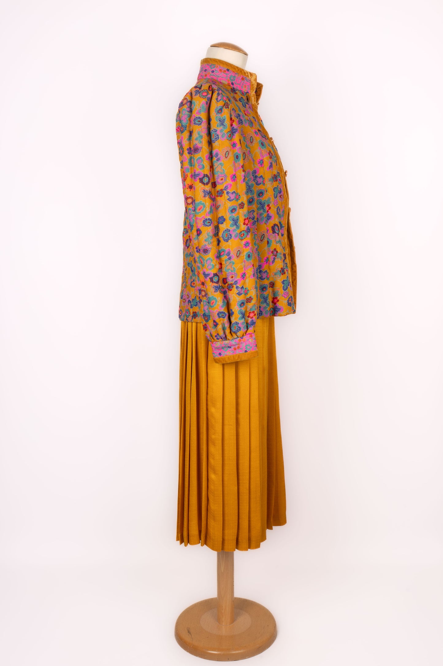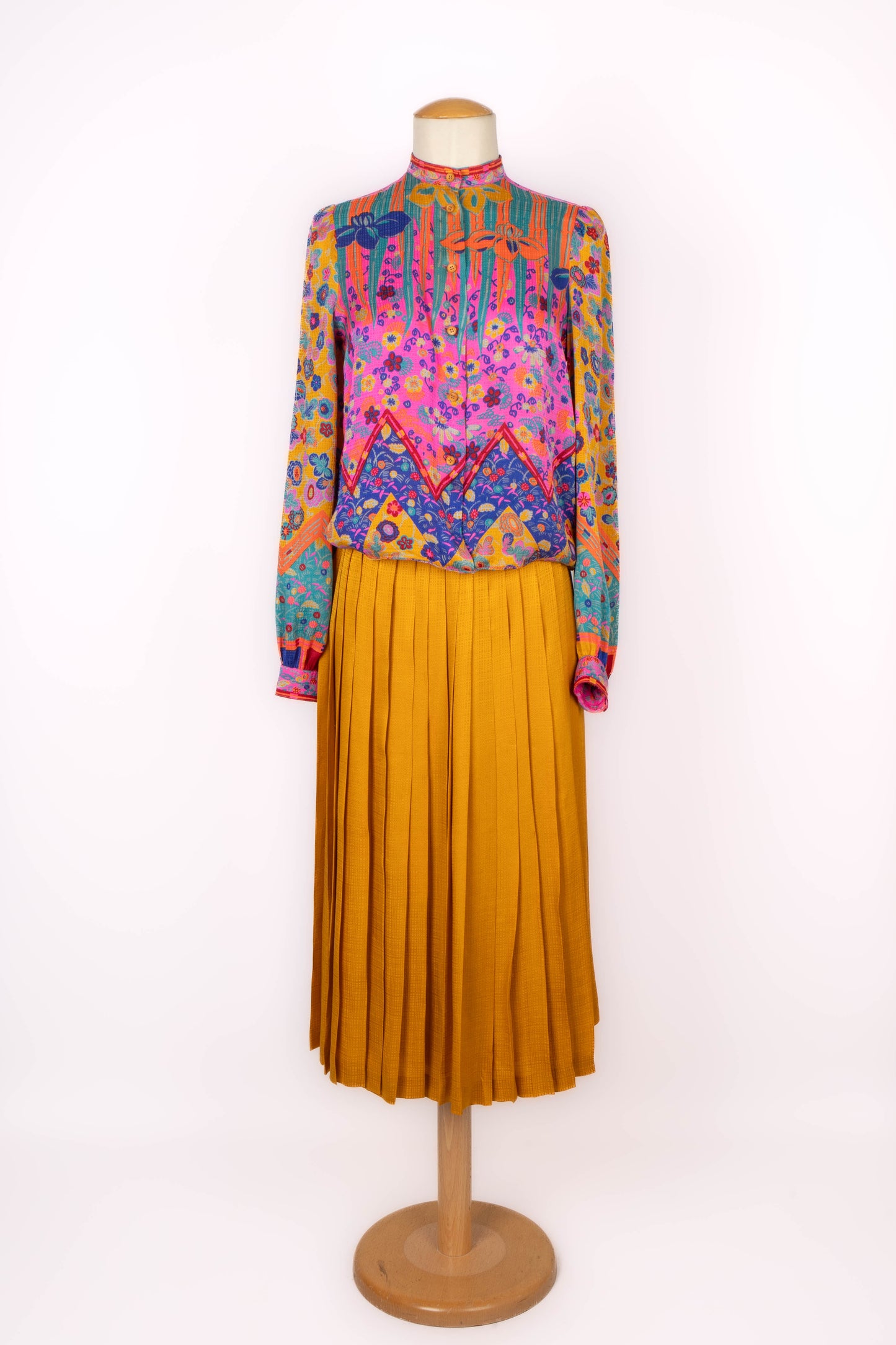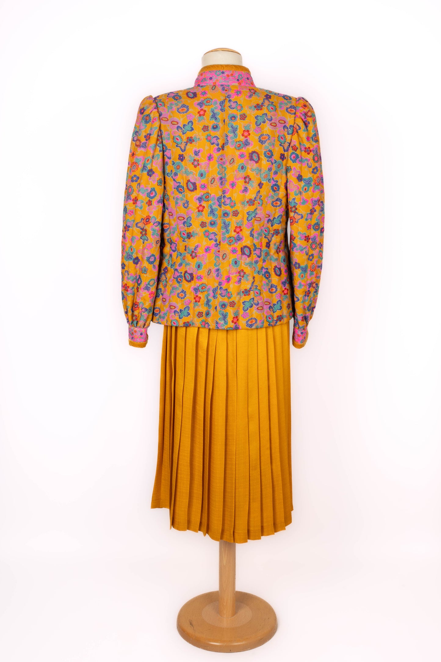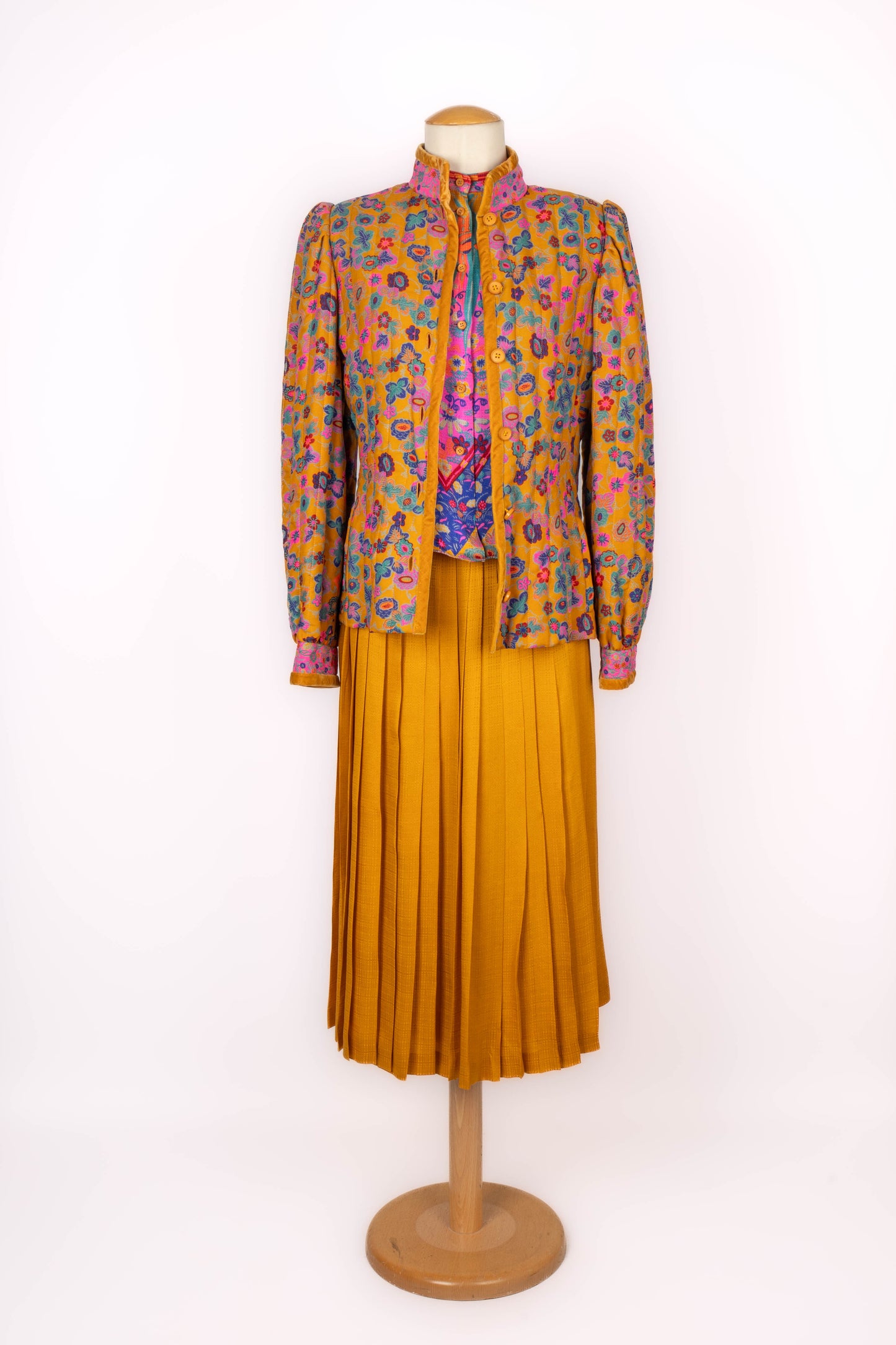 LOUIS FERAUD -Ensemble composé d'une veste matelassée, d'un chemisier en soie et d'une jupe plissée mi-longue. Pas de taille indiquée, il convient à un 36FR. Collection Haute Couture circa 1980.