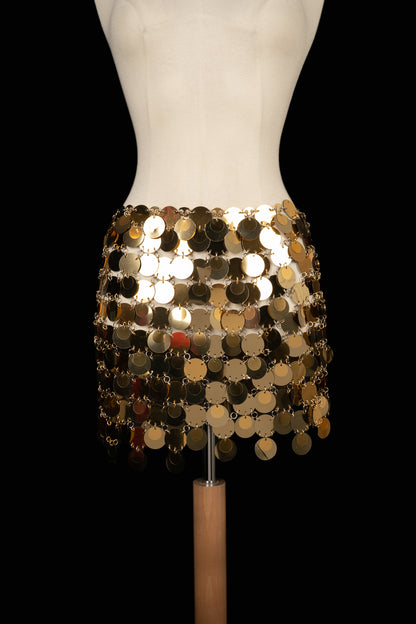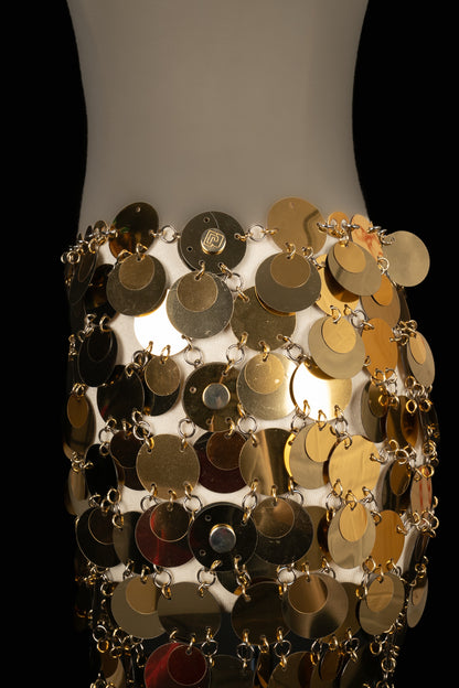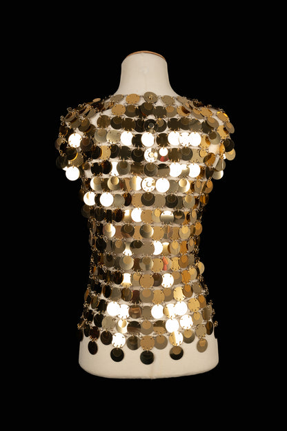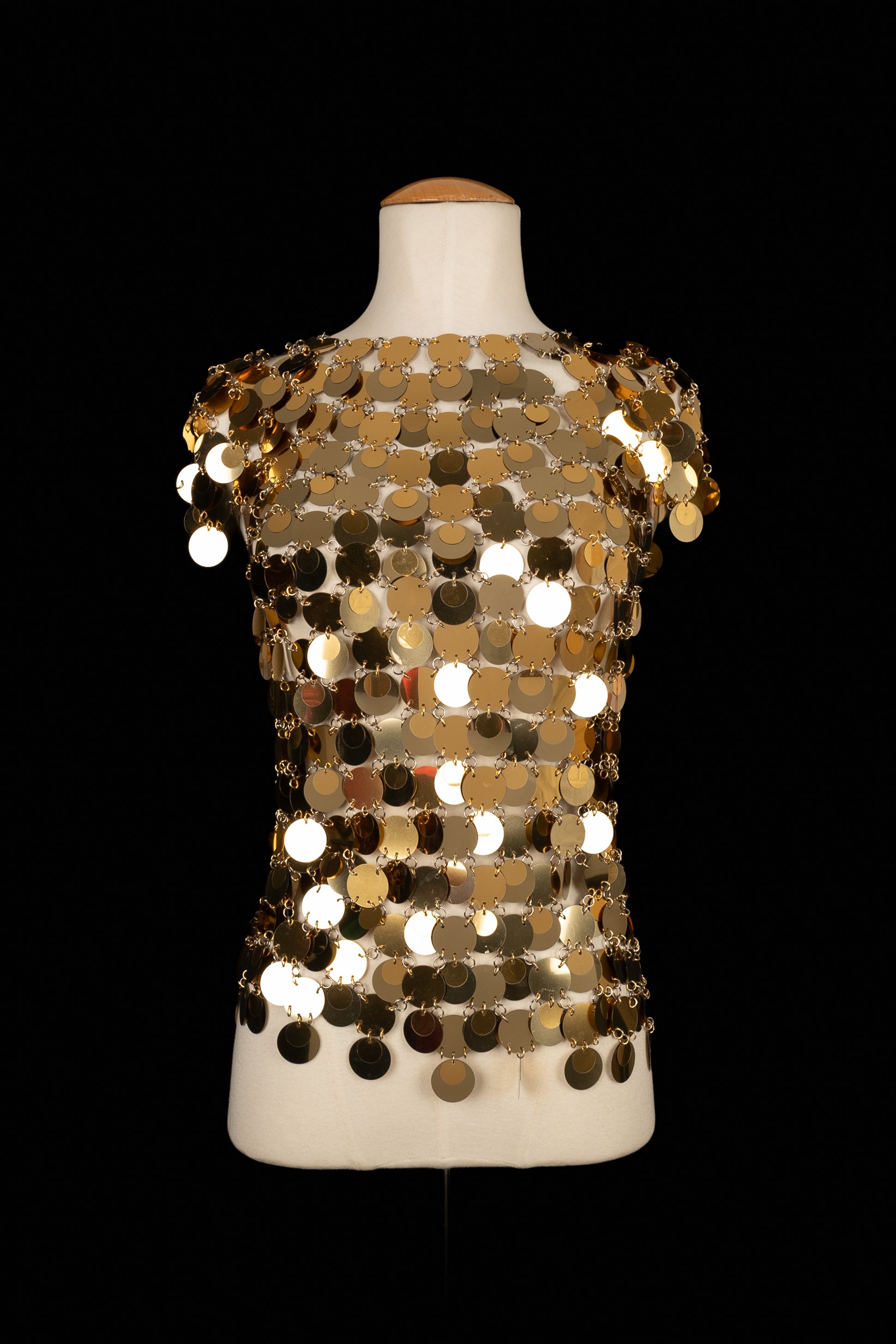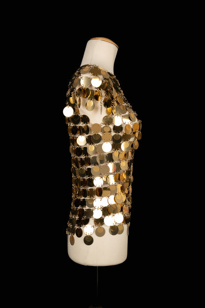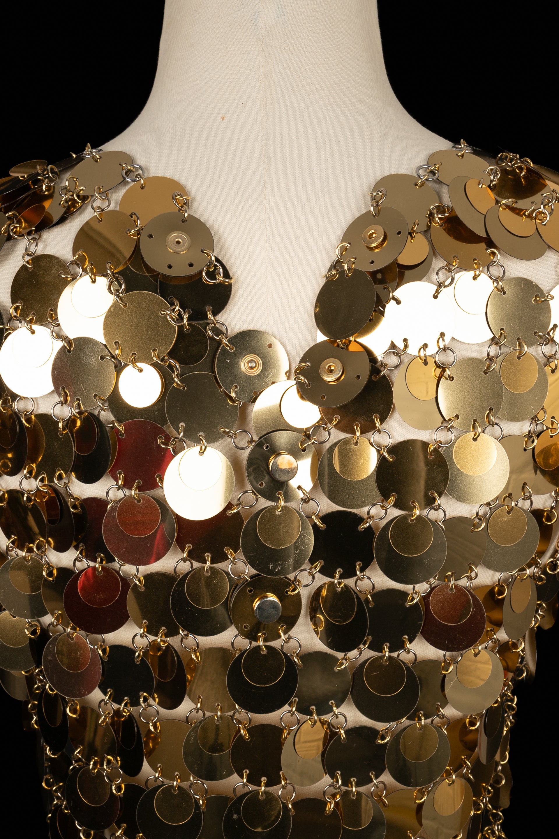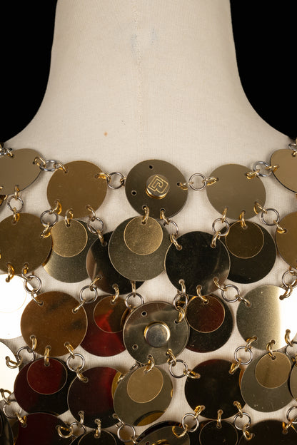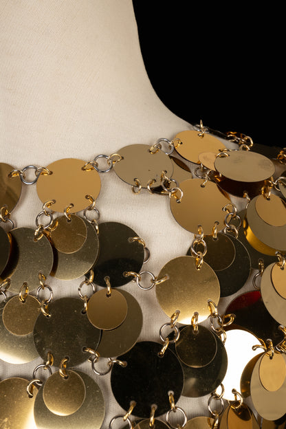 PACO RABANNE -Ensemble composé d'une jupe et d'un top en pastilles de celluloïds dorés. Pas de taille indiquée, il convient à un 36FR.