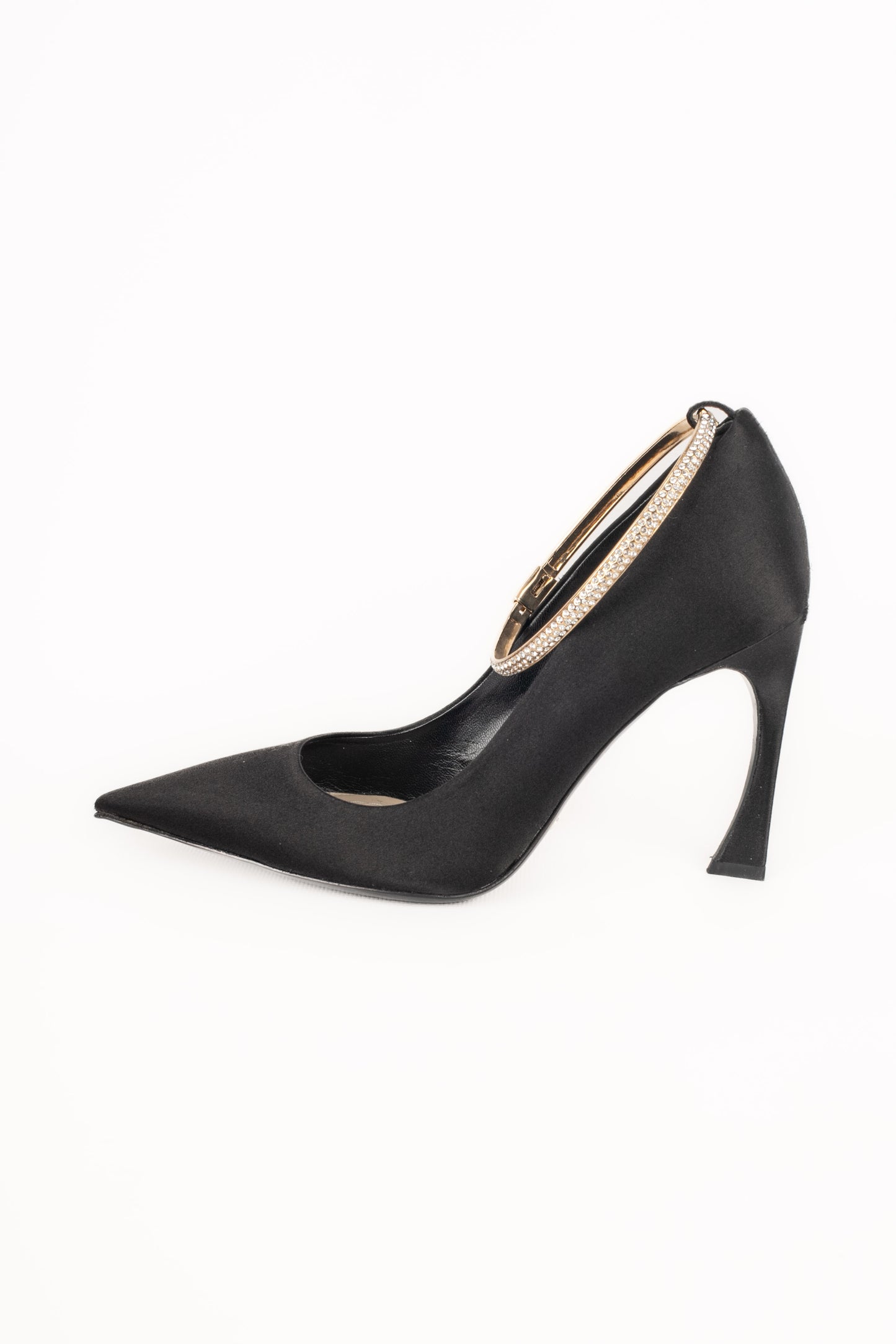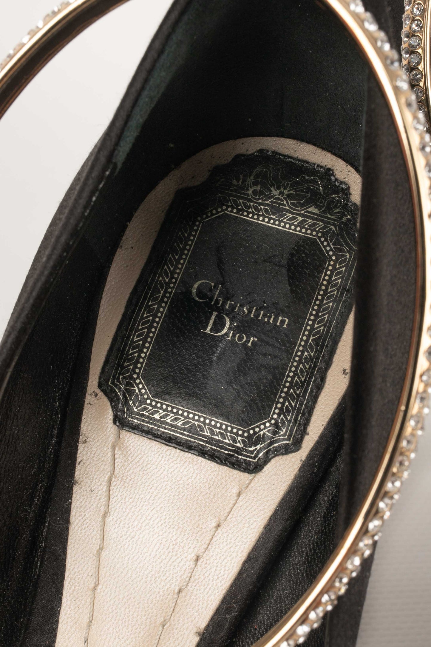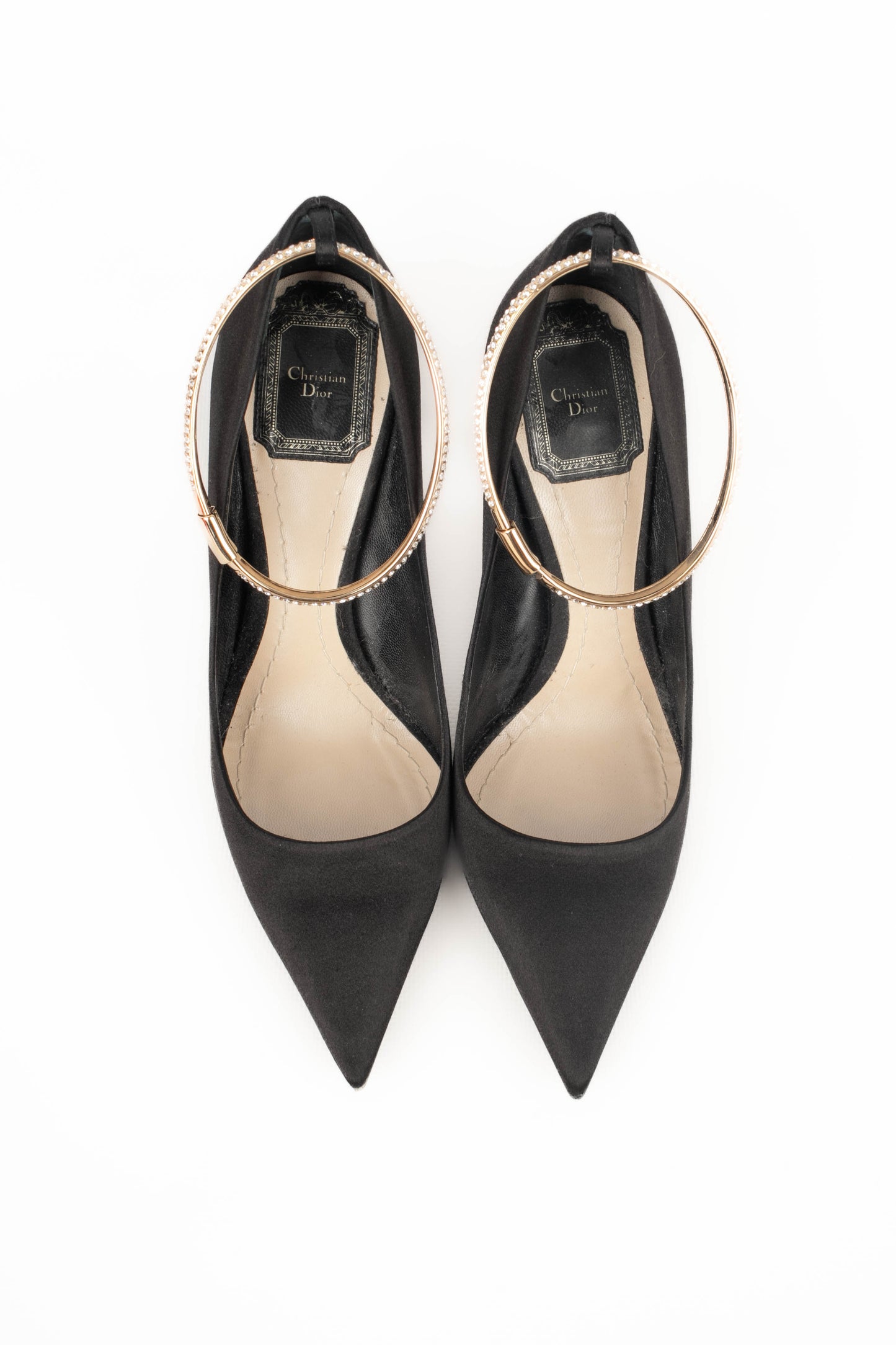 DIOR -(Made in Italy) Escarpins en soie noire retenant une attache bracelet de cheville en métal champagne serti de strass. Taille indiquée 36FR.