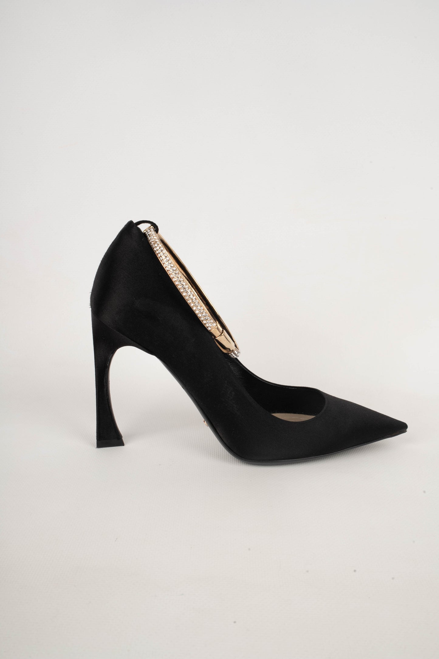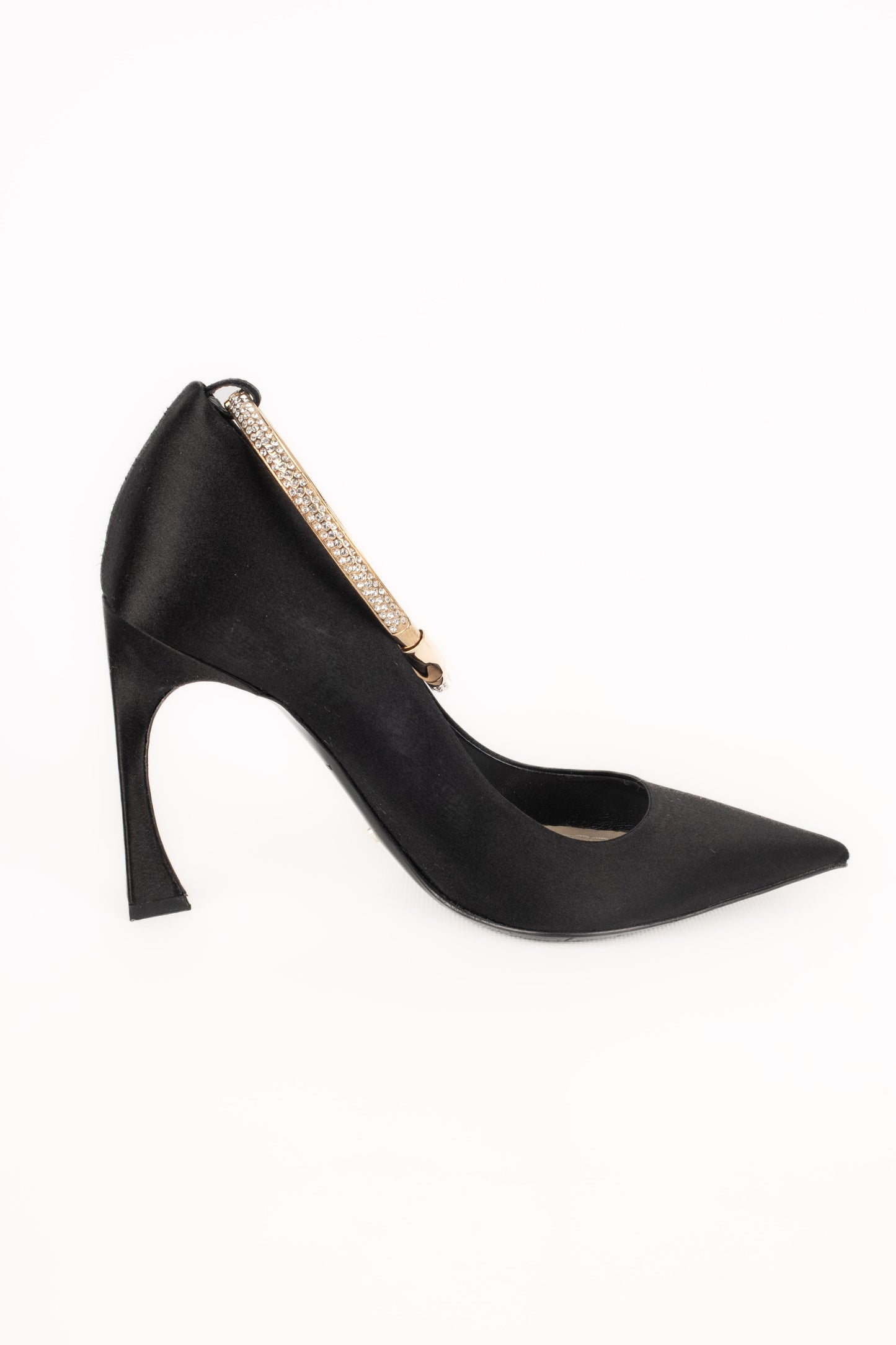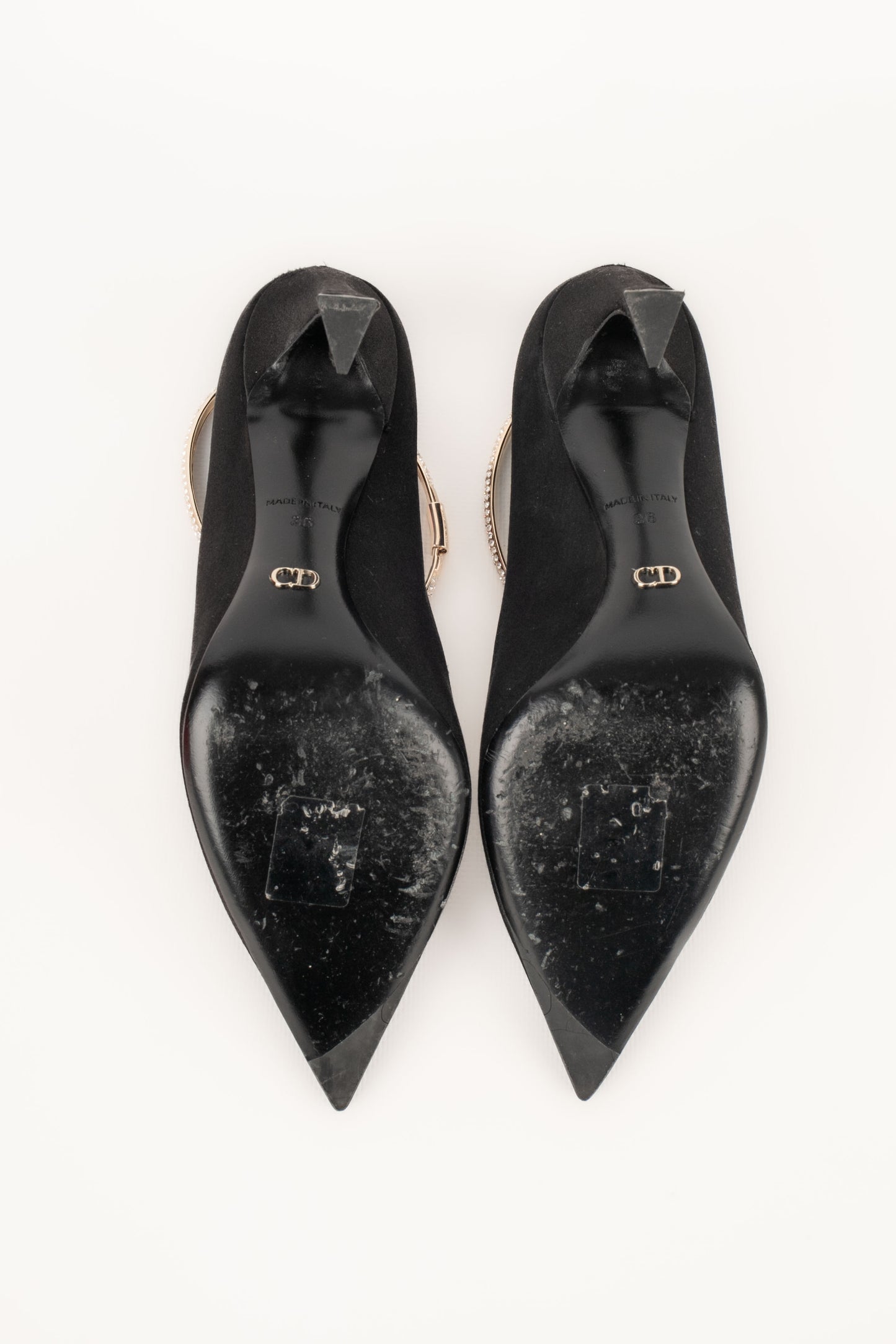 DIOR -(Made in Italy) Escarpins en soie noire retenant une attache bracelet de cheville en métal champagne serti de strass. Taille indiquée 36FR.