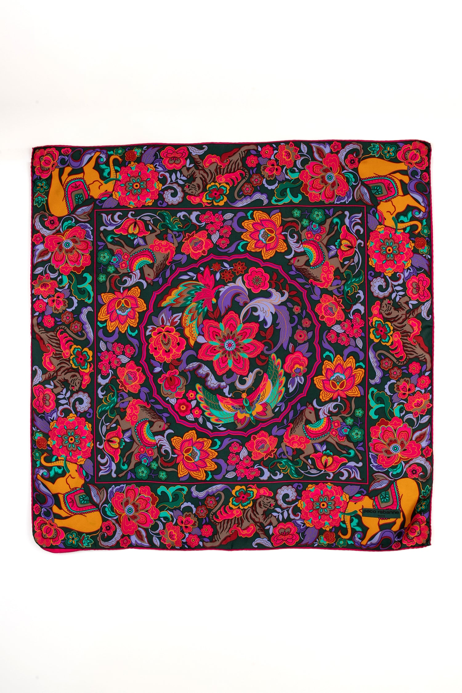 PACO RABANNE -(Made in France) Foulard en soie illustré de fleurs et d'animaux. A signaler, l'un des bords du roulotté est décousu.