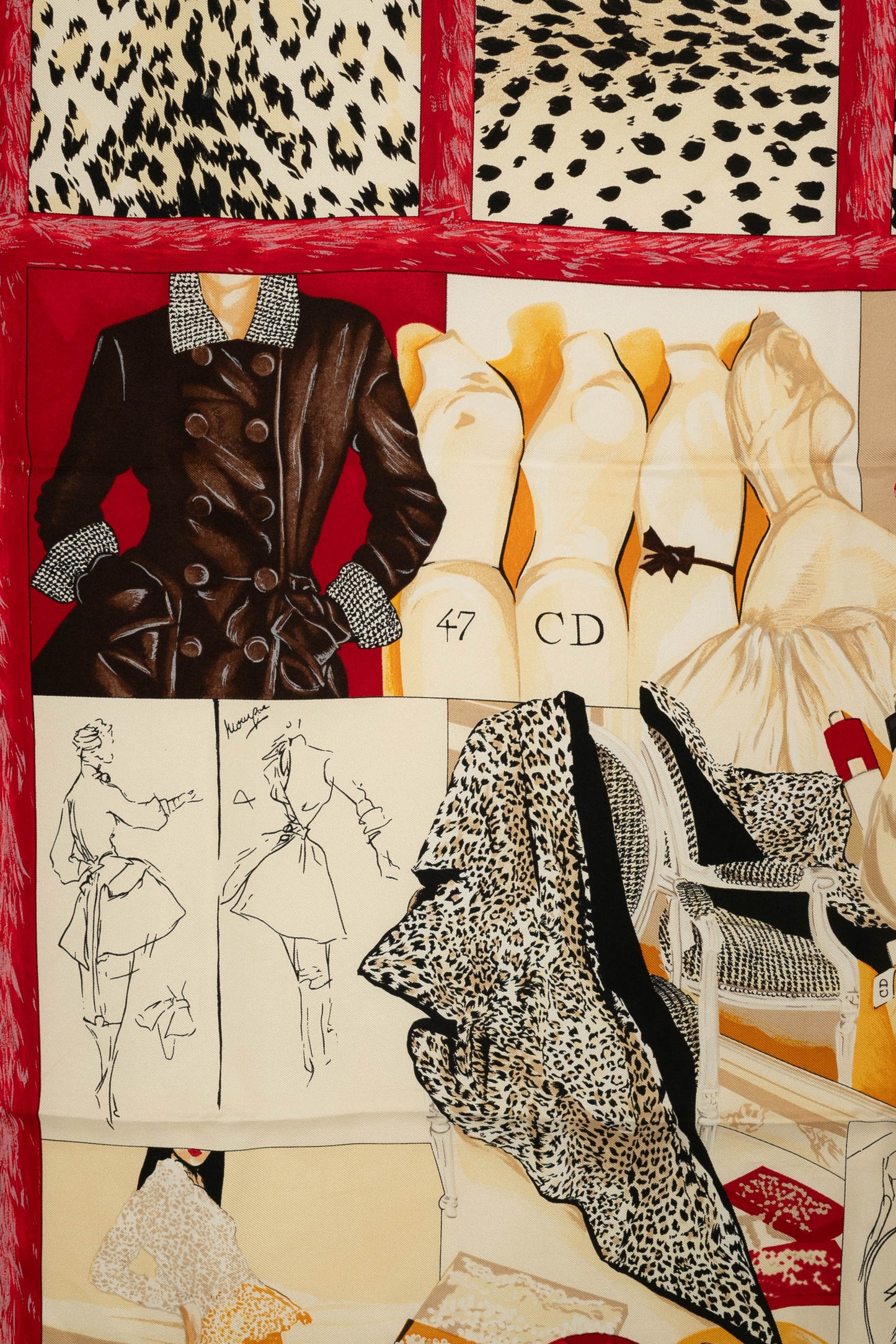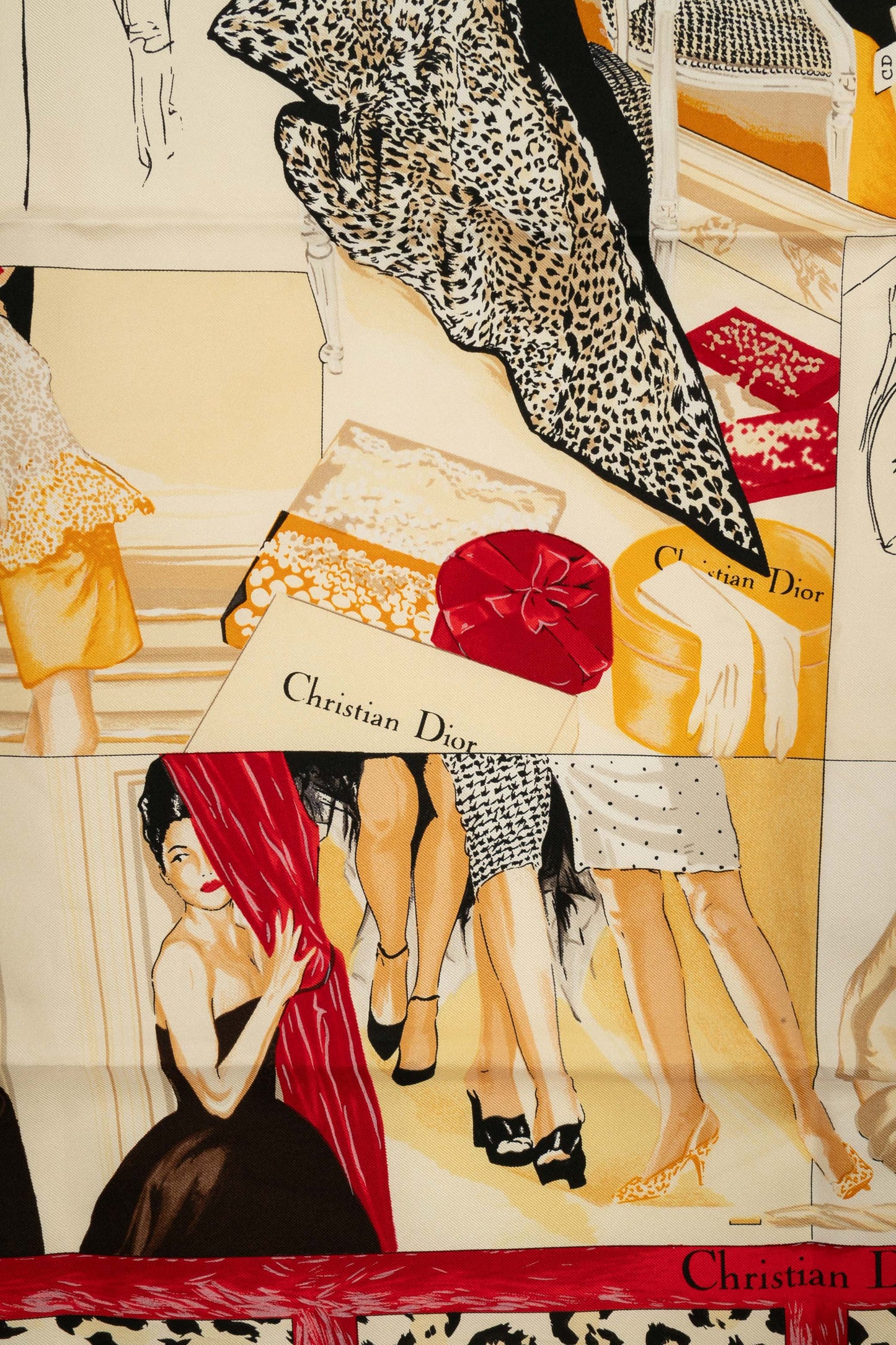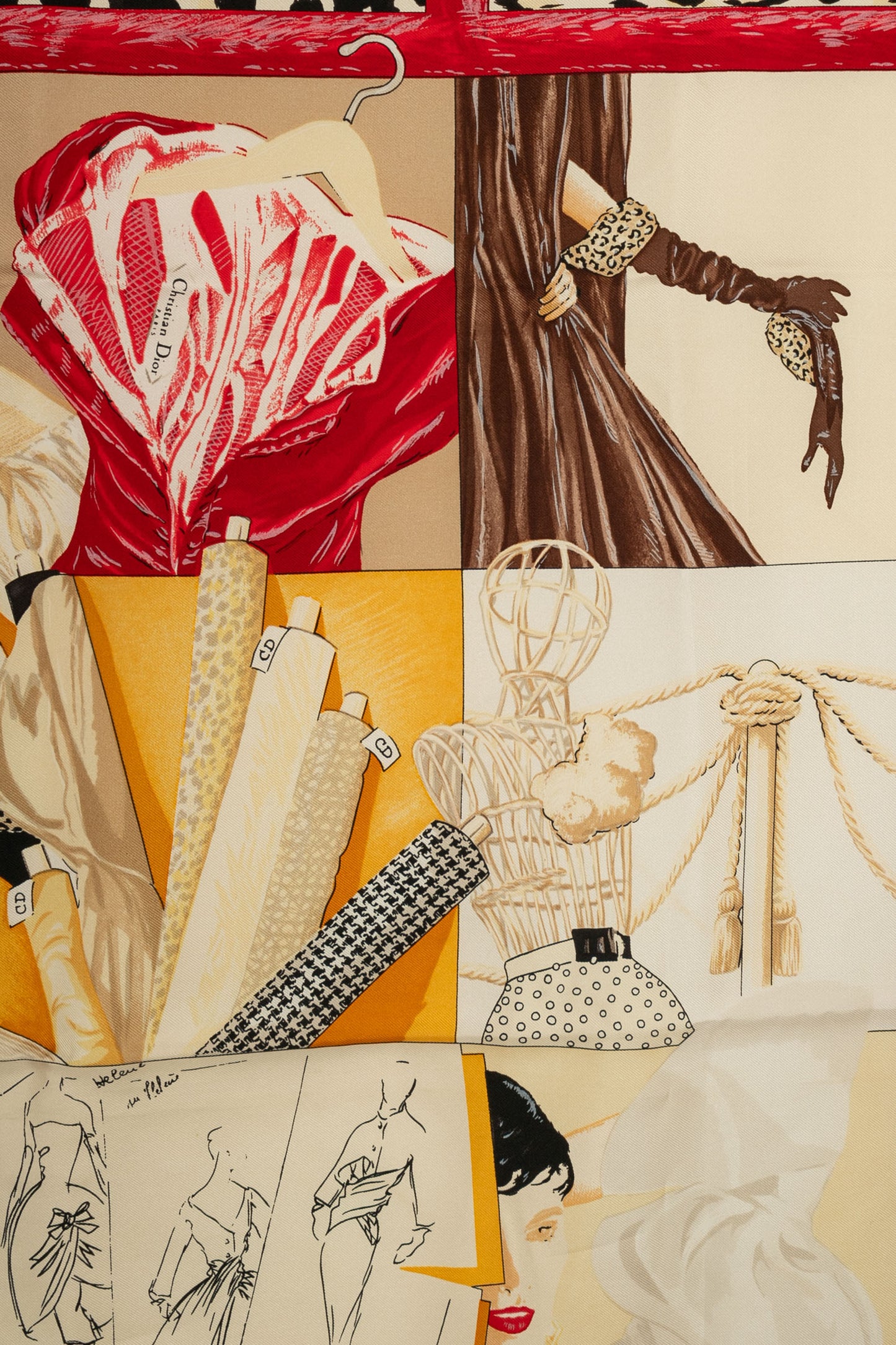 DIOR -(Made in France) Foulard en soie beige et rouge imprimé de silhouettes féminines.