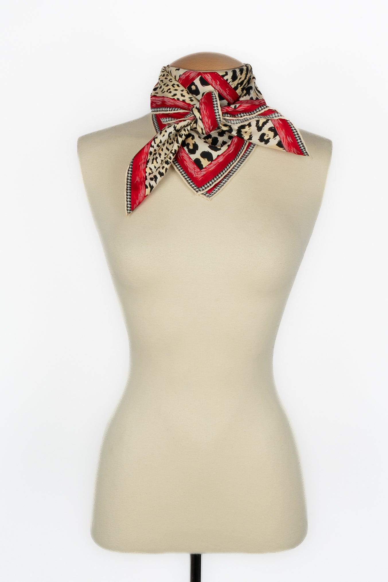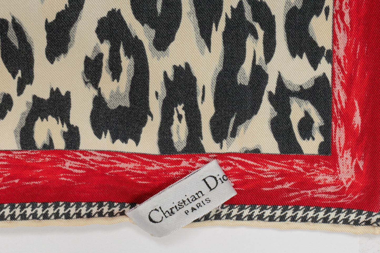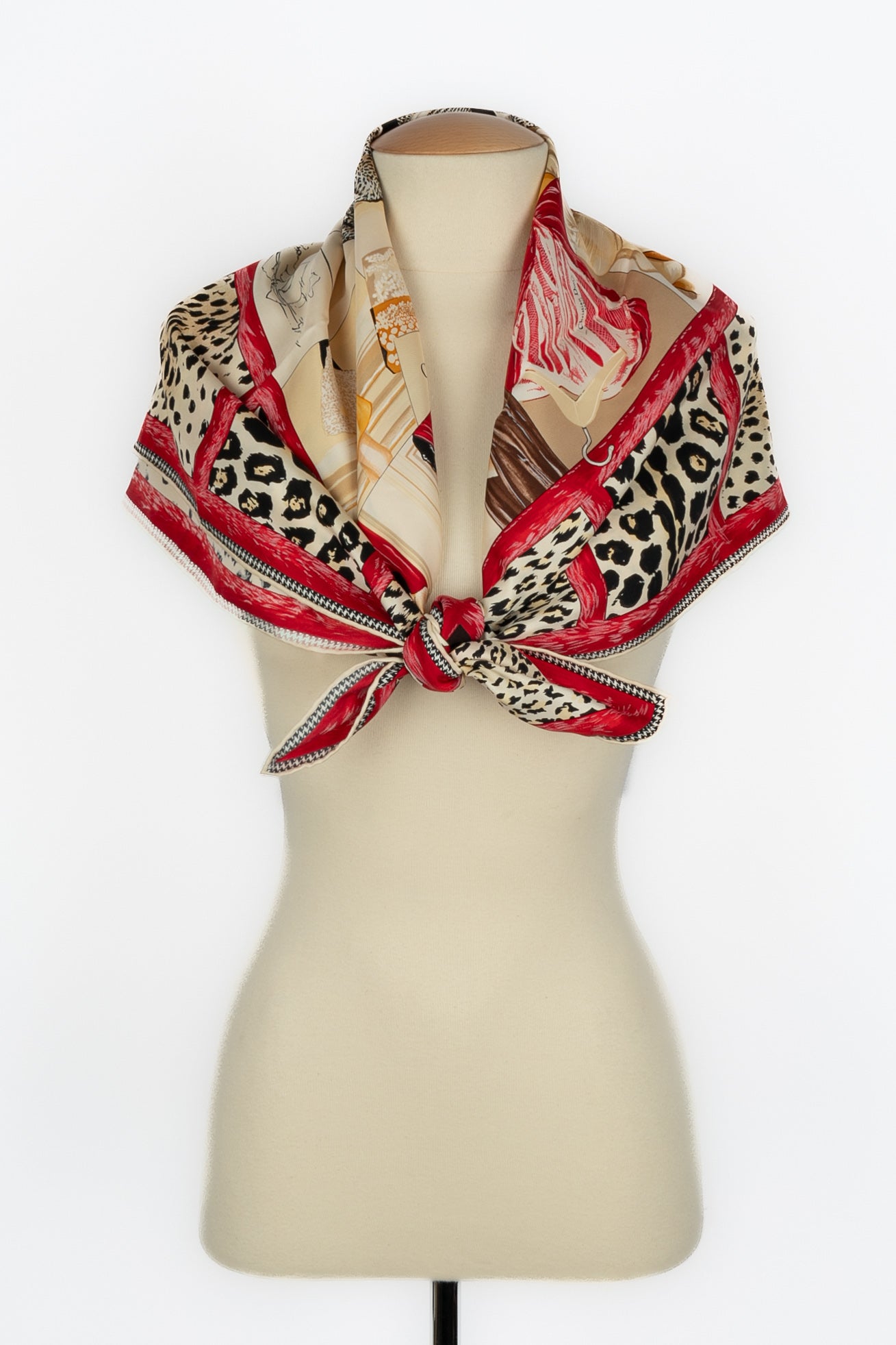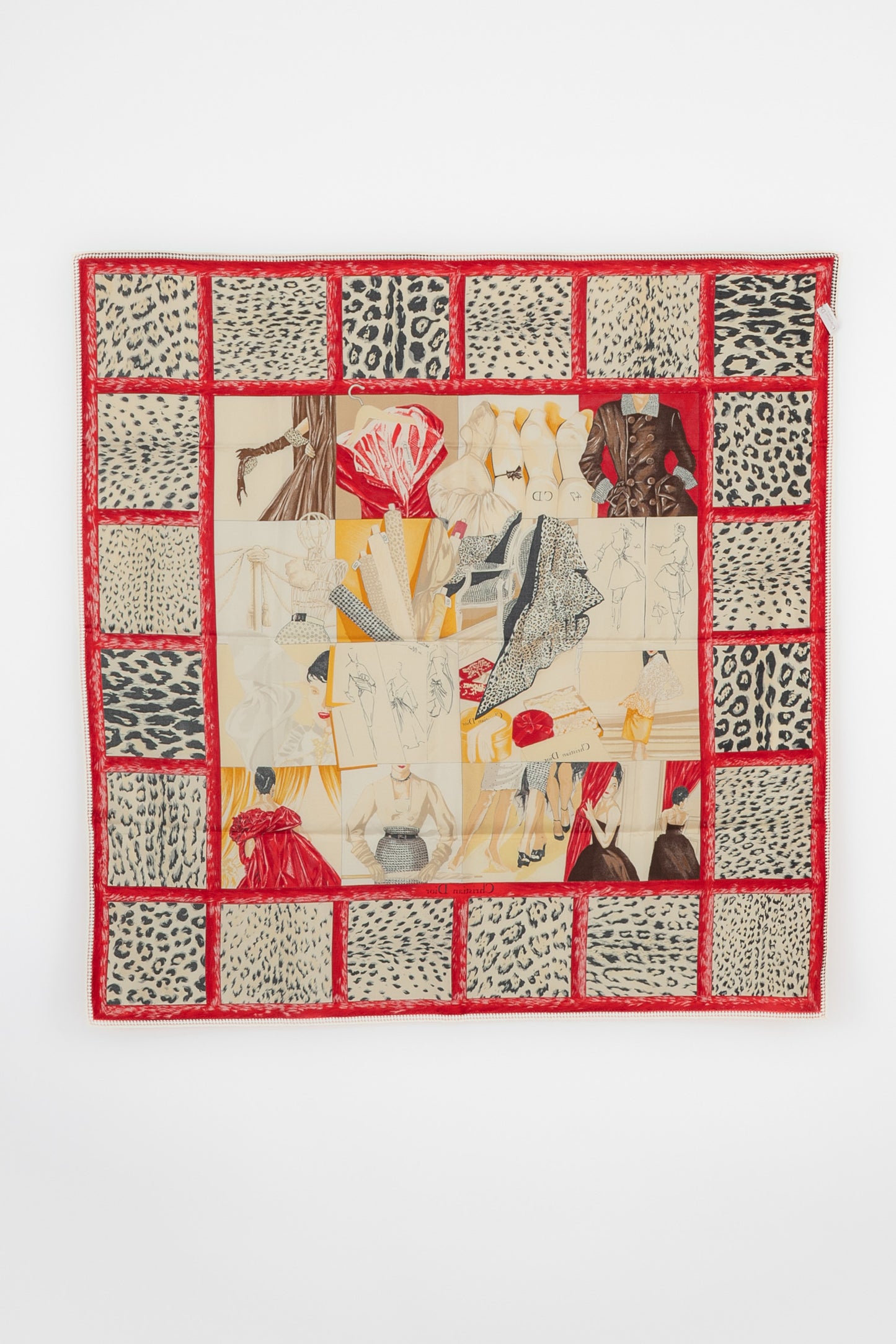 DIOR -(Made in France) Foulard en soie beige et rouge imprimé de silhouettes féminines.