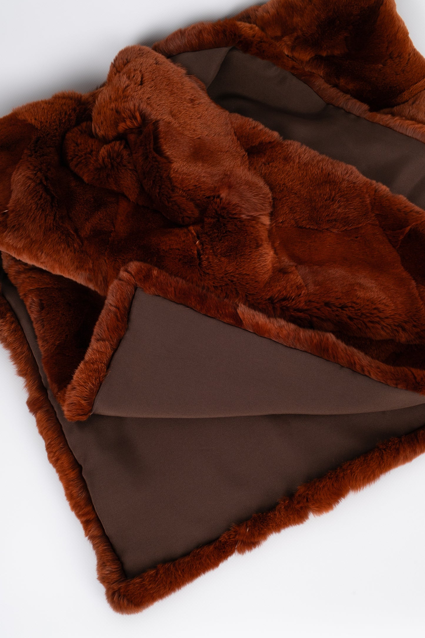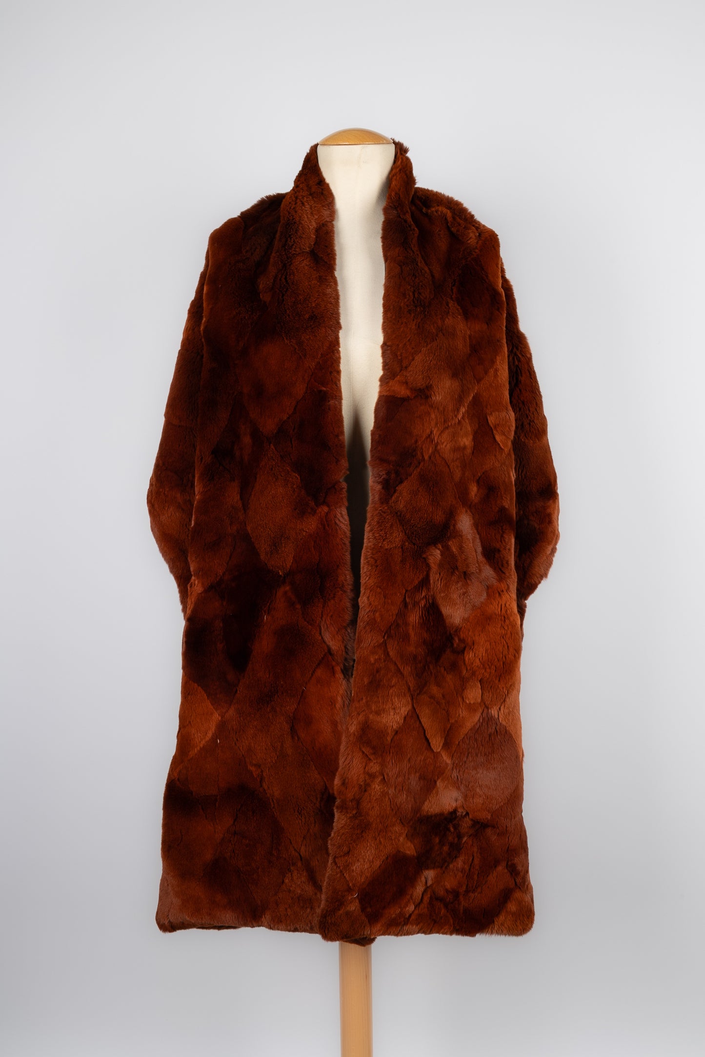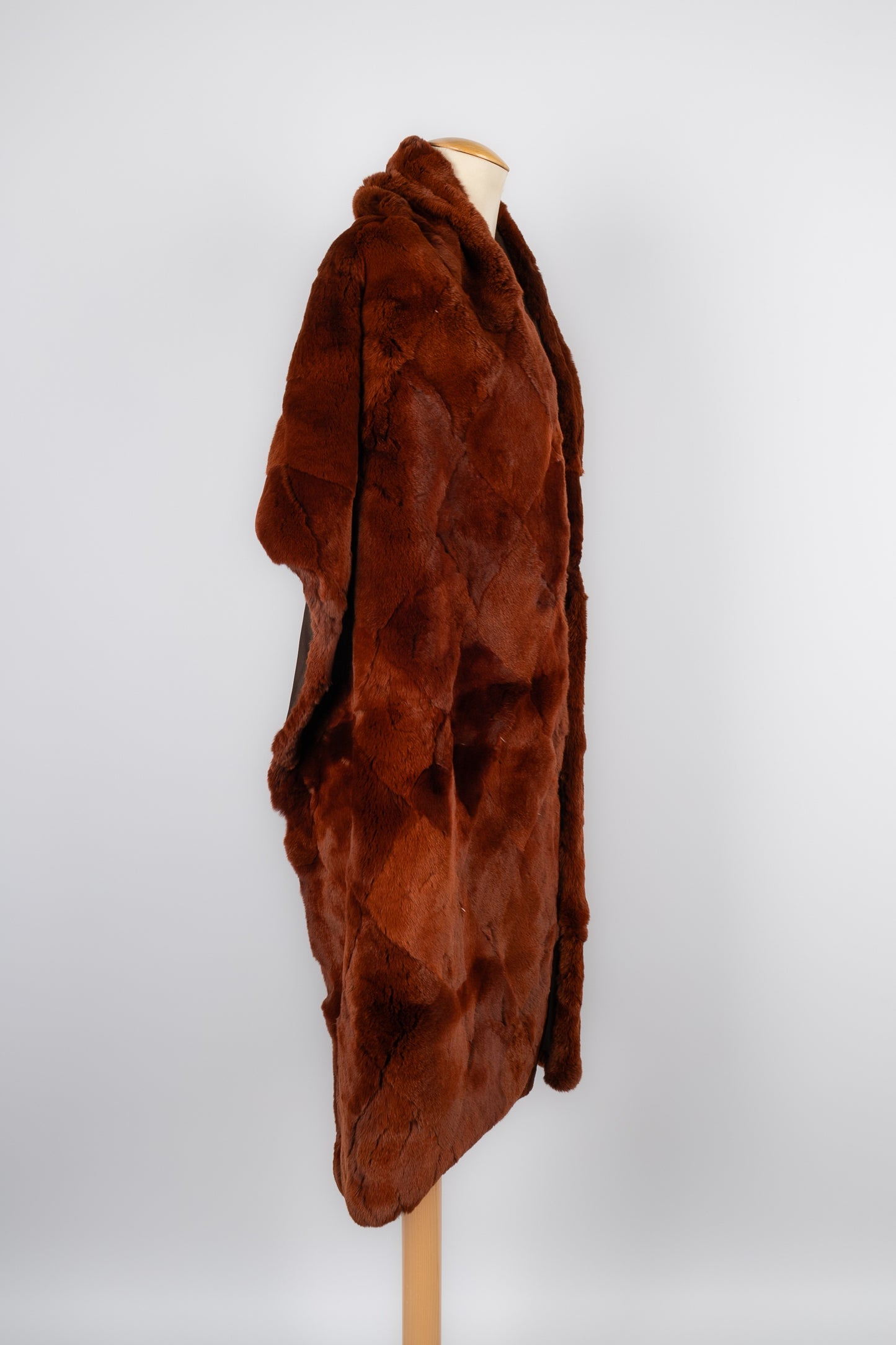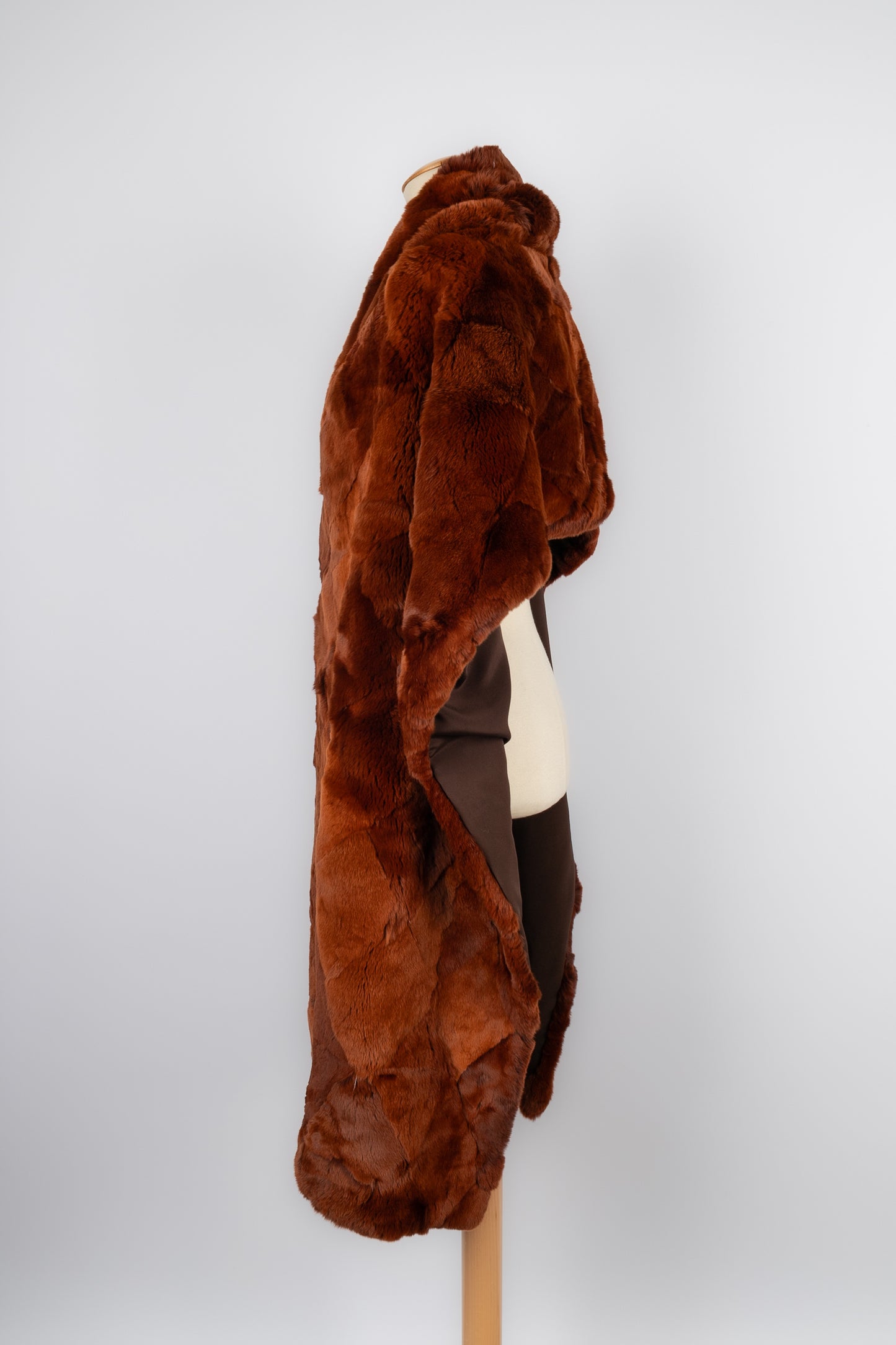 CHANEL -(Made in France) Grande étole en patchwork de fourrure d'Orylag marron cuivré et doublure en soie marron.