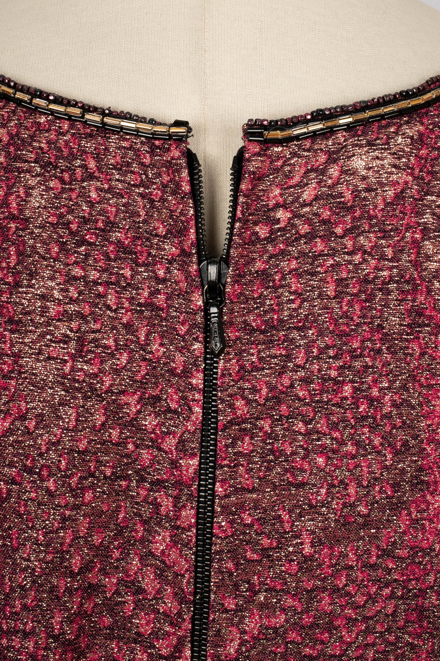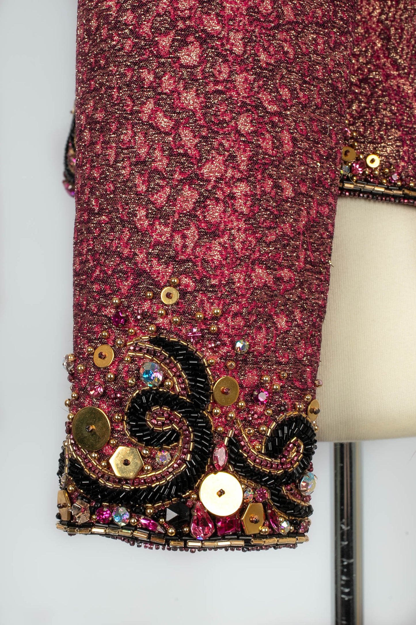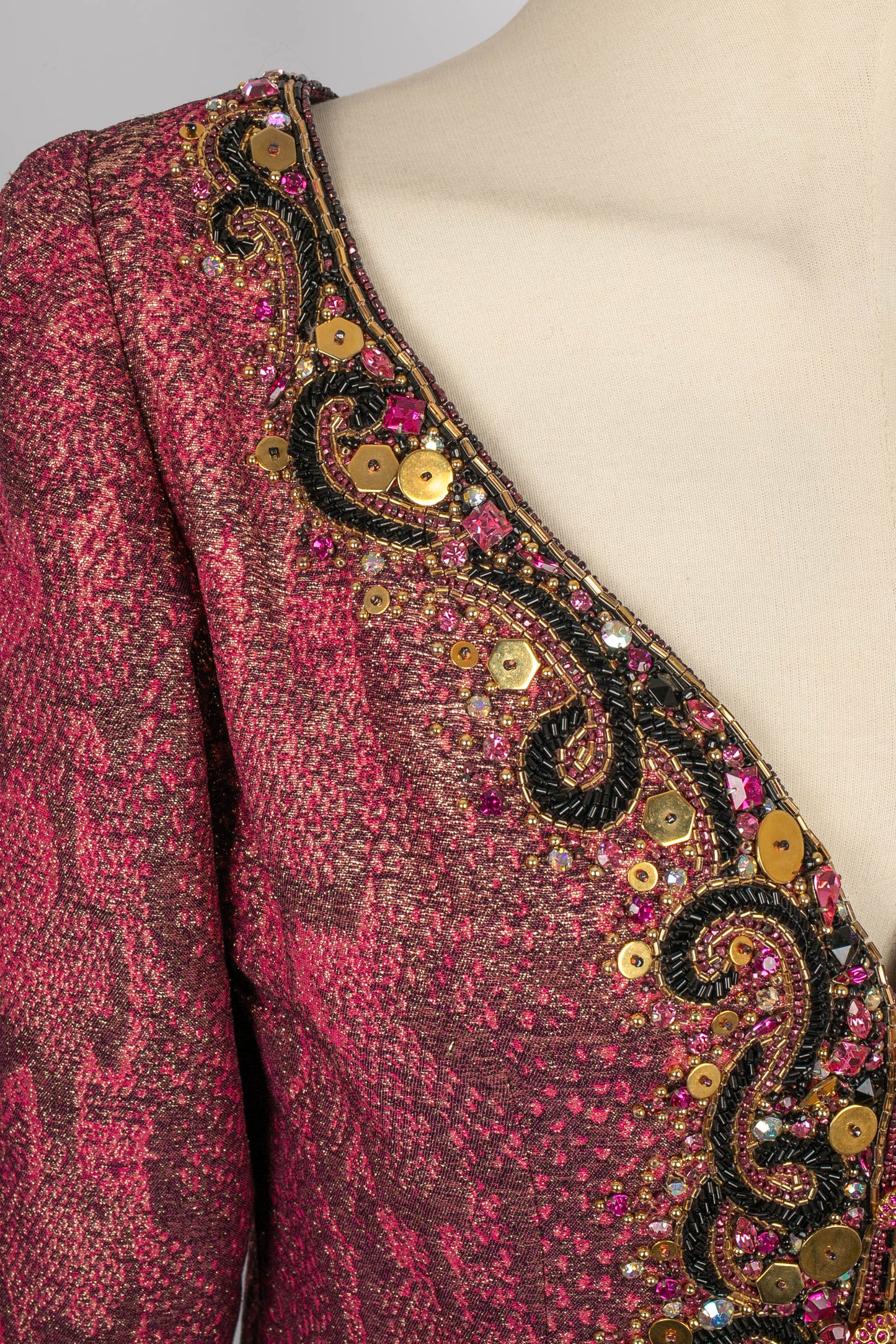 NINA RICCI -(Made in France) Haut à manches longues brodées de perles et de strass. Zip dans le dos. Faux boutons en métal doré et strass roses. Pièce datant des années 1970. Etiquettes de taille et de composition absentes, il convient à un 38FR.