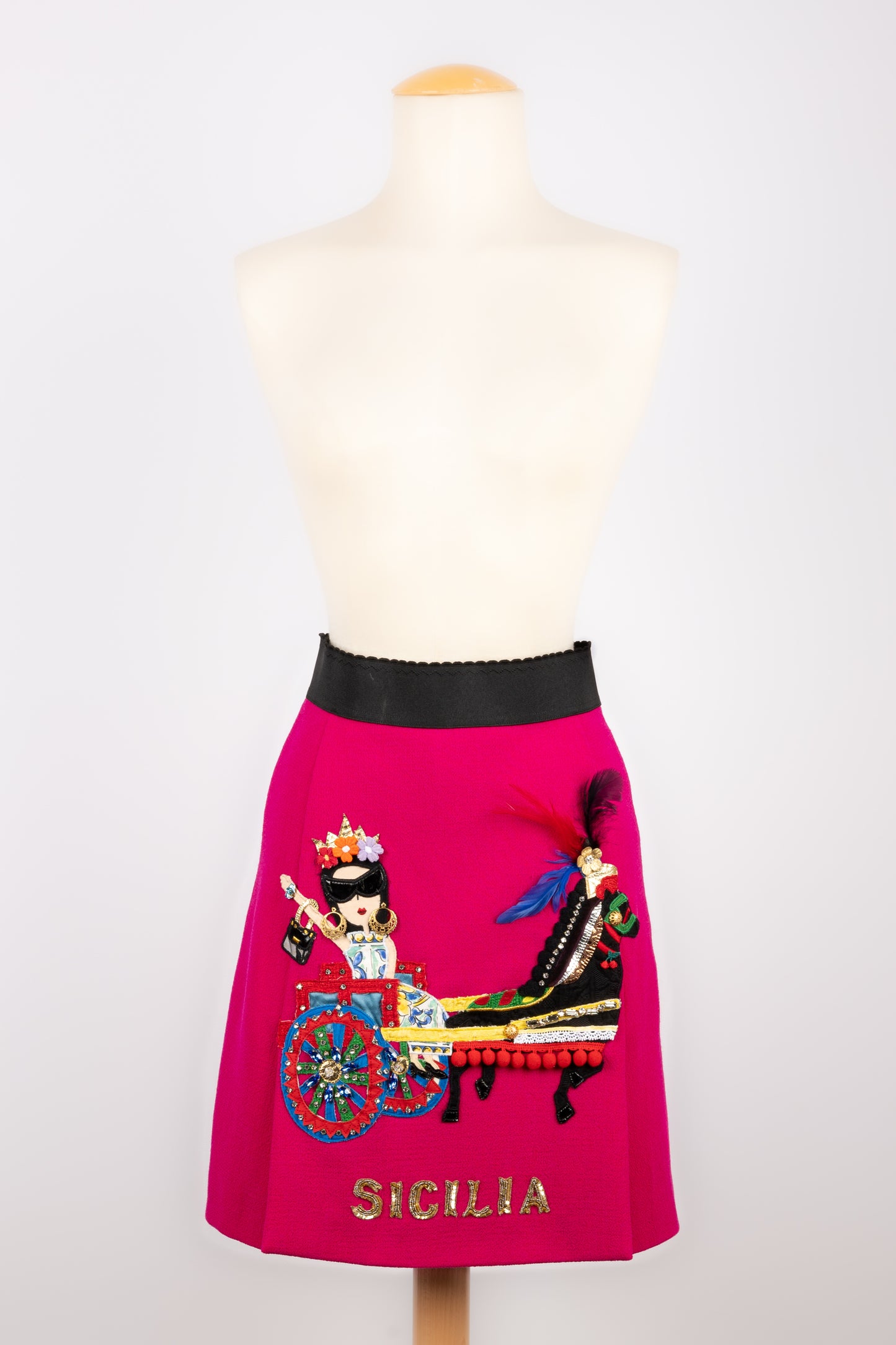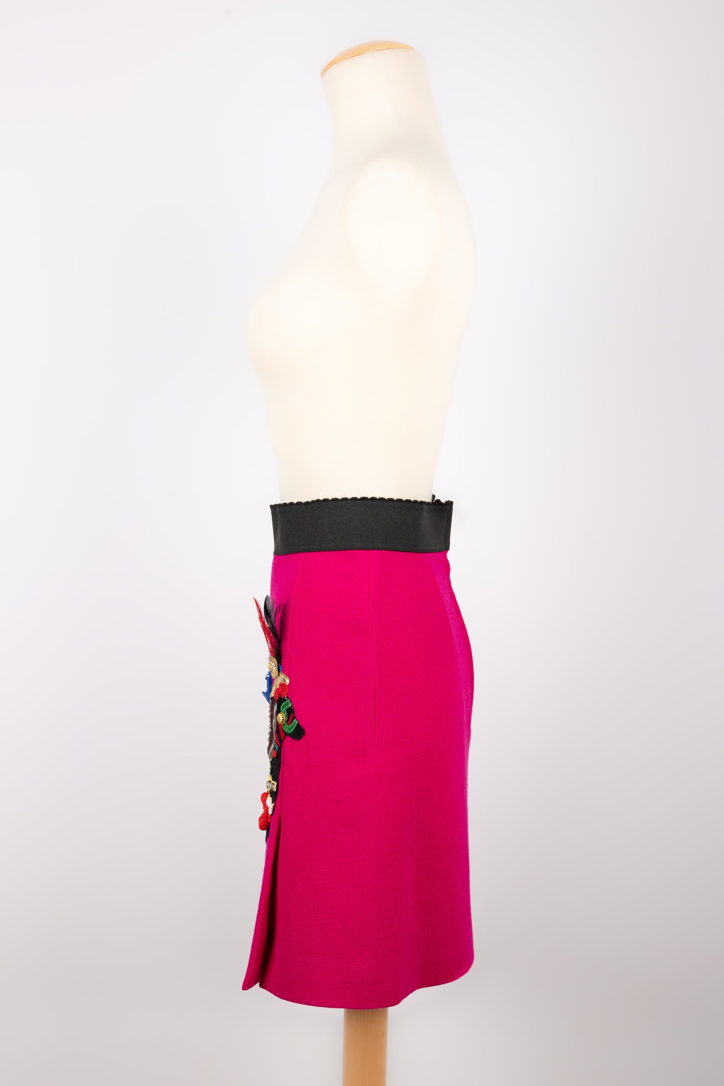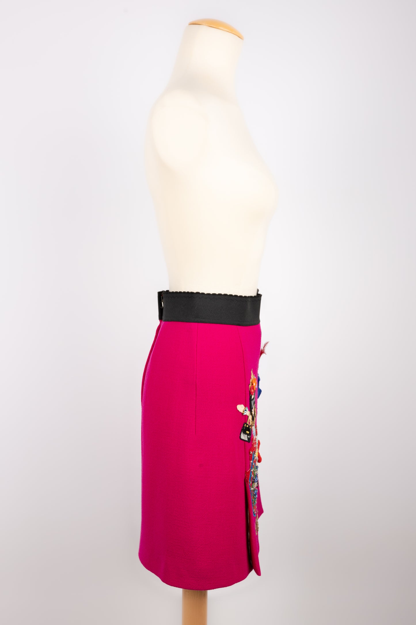 DOLCE & GABBANA -(Made in Italy) Jupe en laine rose rehaussée de strass, de passementerie, de cuir et de soie. Taille indiquée 36FR. Collection prêt-à-porter printemps-été 2016.