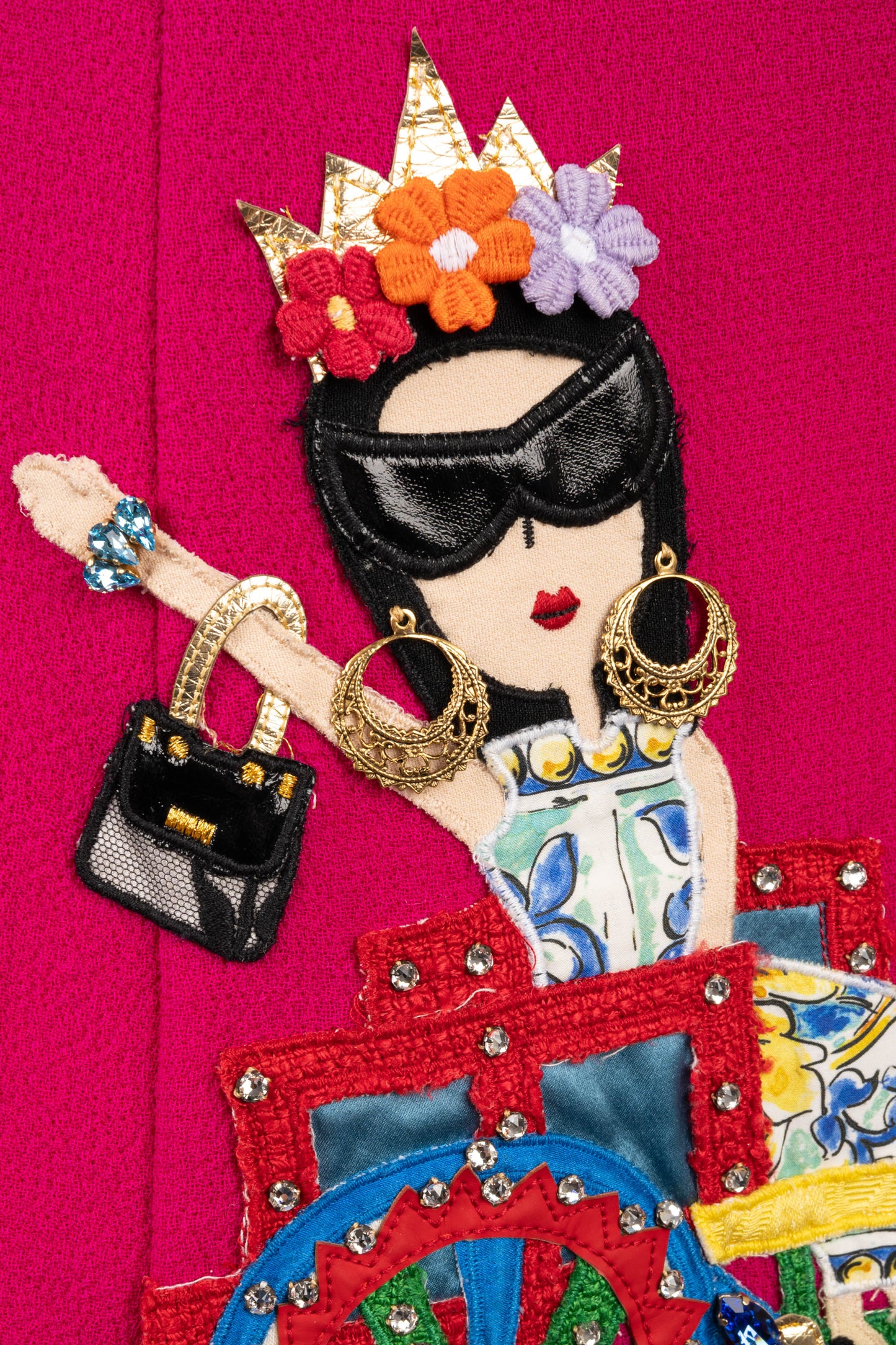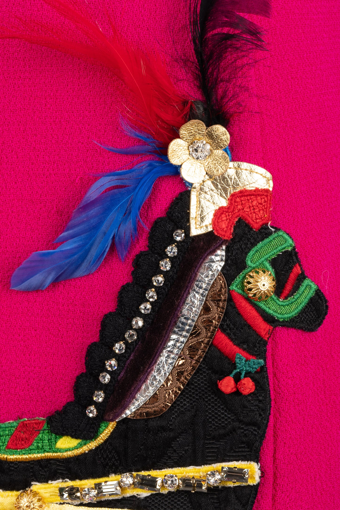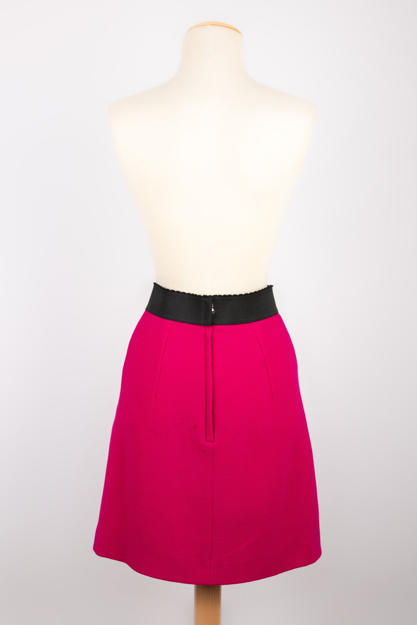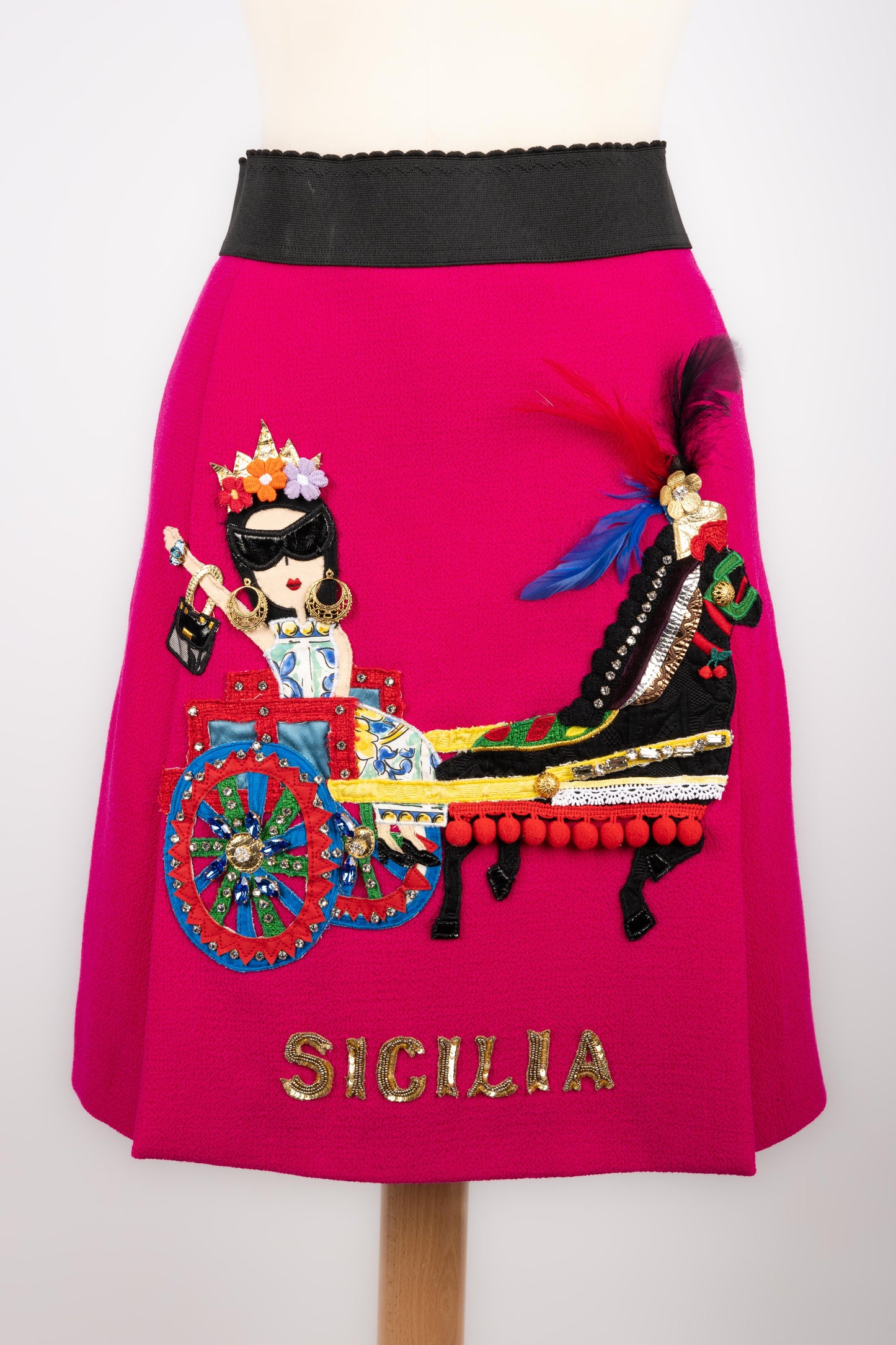 DOLCE & GABBANA -(Made in Italy) Jupe en laine rose rehaussée de strass, de passementerie, de cuir et de soie. Taille indiquée 36FR. Collection prêt-à-porter printemps-été 2016.