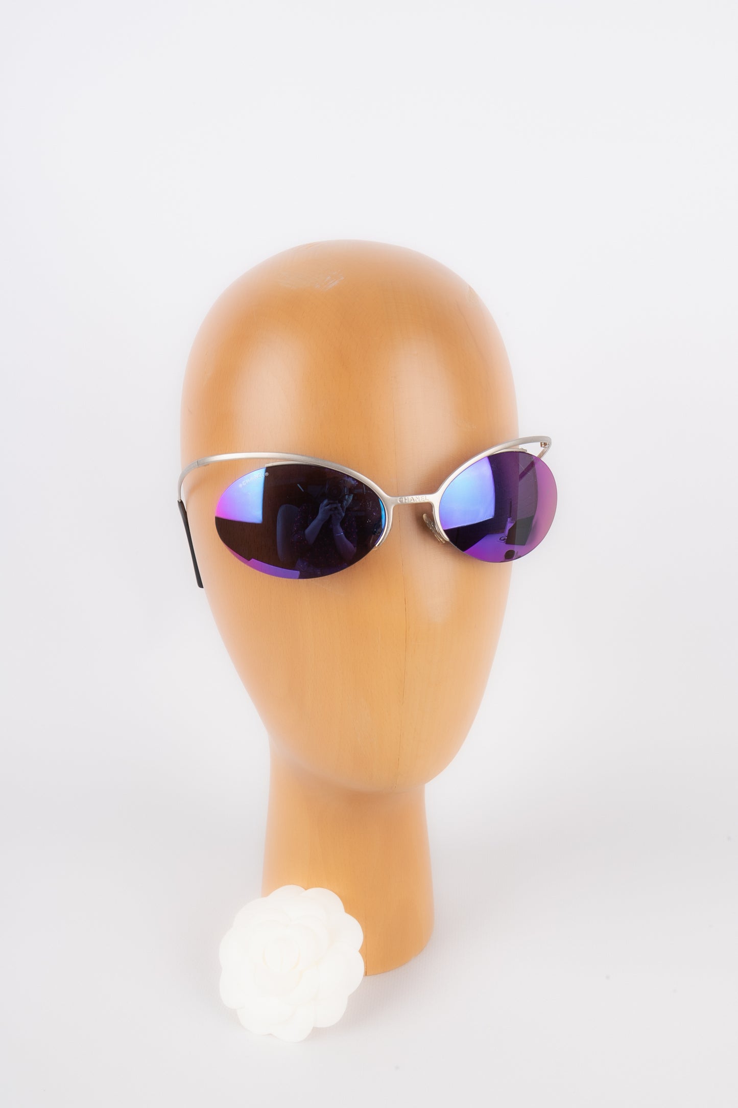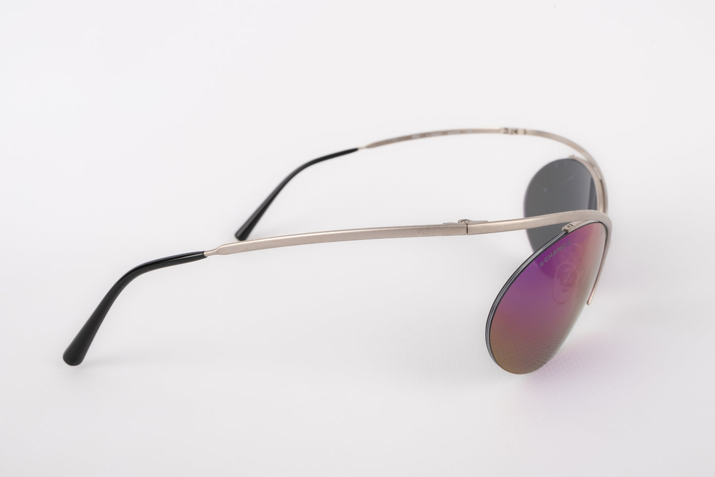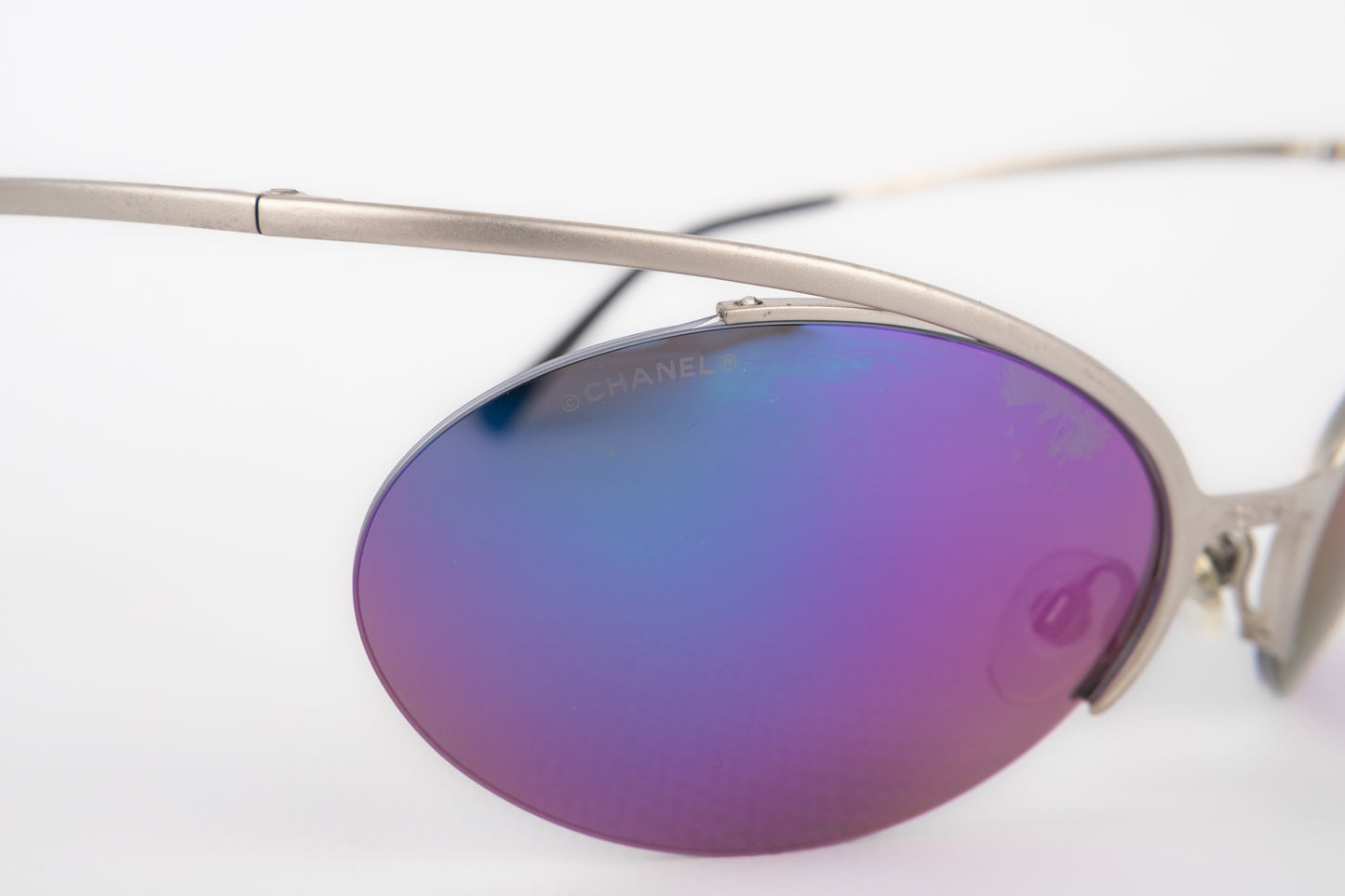CHANEL -(Made in Italy) Lunettes de soleil en métal argenté, verres teintés dans les tons de bleu et de violet.